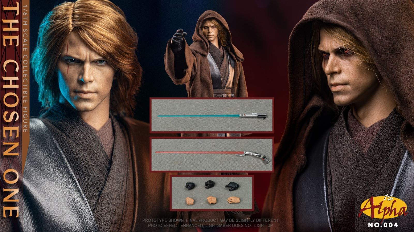 1:6 Alpha No.004 the Chosen OneNeutral Head (Rooted Hair) x1Evil Eyes Head (Rooted Hair) x1Body with 30 points of articulations x1Interchangeable hand x6light brown-colored shirtBrown under tunic x1Dark brown colored tunic x1Dark brown-colored leather-like belt x1Brown colored Jedi robe x1Brown colored pants x1dark brown-colored leather-like textured boots x1Lightsaber hilt x1Curved hilt lightsaber x1Blue-colored lightsaber blades x1Red-colored lightsaber blades x1Shipmentime2Q2022