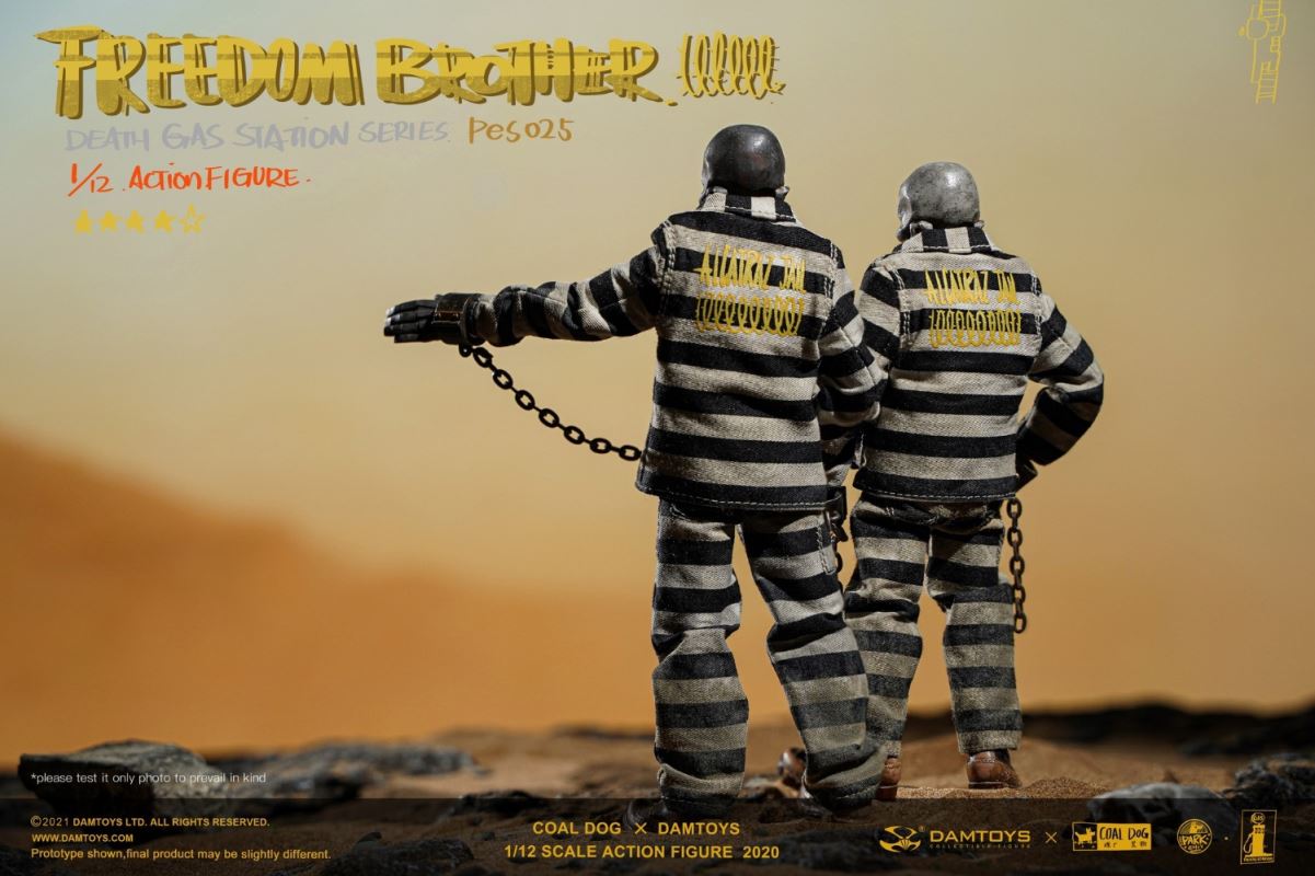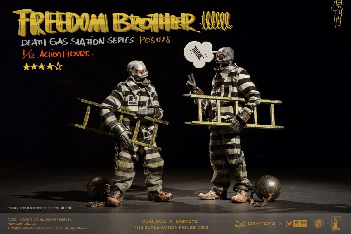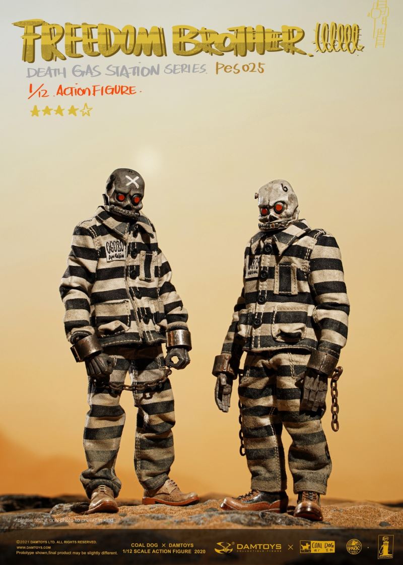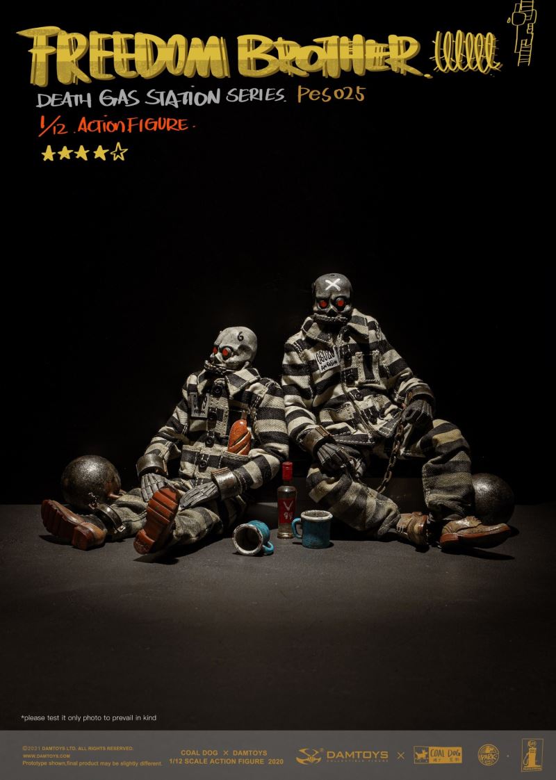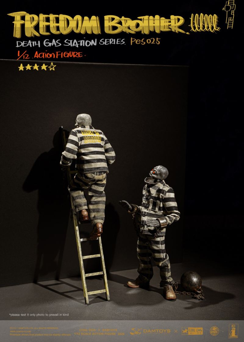 [DAMTOYS x COALDOG Coal Factory Black Dog]FREEDOM BROTHER-Death Gas Station DGS Series 1/12 Action Figure-PES025(Note: The final product effect is subject to the actual product)Parts list:movable head x2movable body x2Hand x12shoes x2vodkawater cup x2identification plate x2handcuffsdisconnected handcuffsfetters x2ladder x2 (can be combined into a long ladder)a bite of breadcampfire (two states)keychainwanted poster x3pliers (movable)comicstickerpouchofficial price: 780 yuanis expected to ship time: 2022 second quarterproduct bar code: 6970569620886