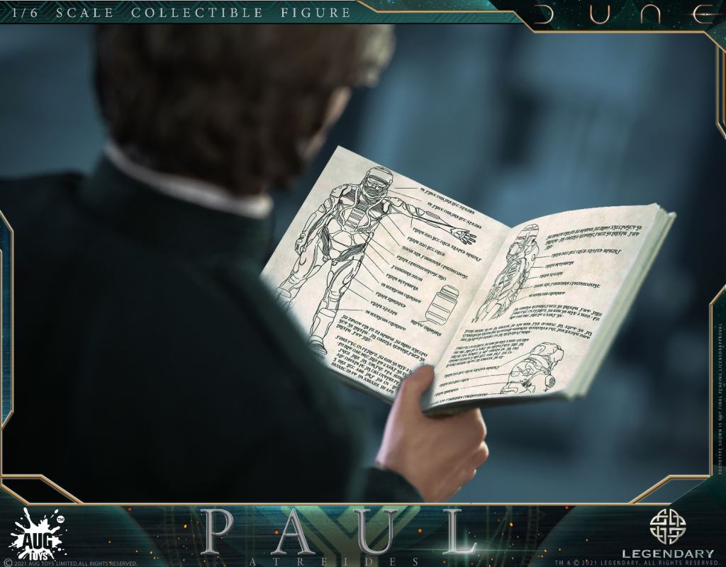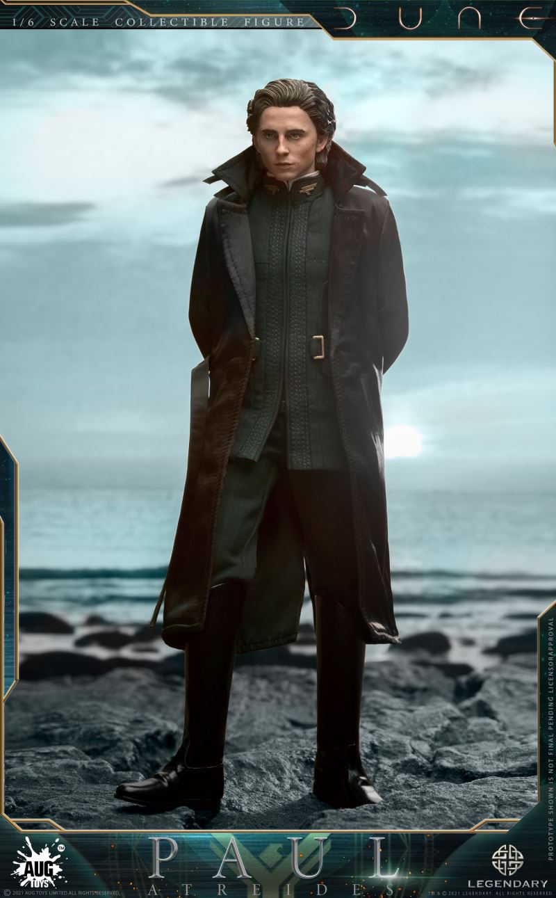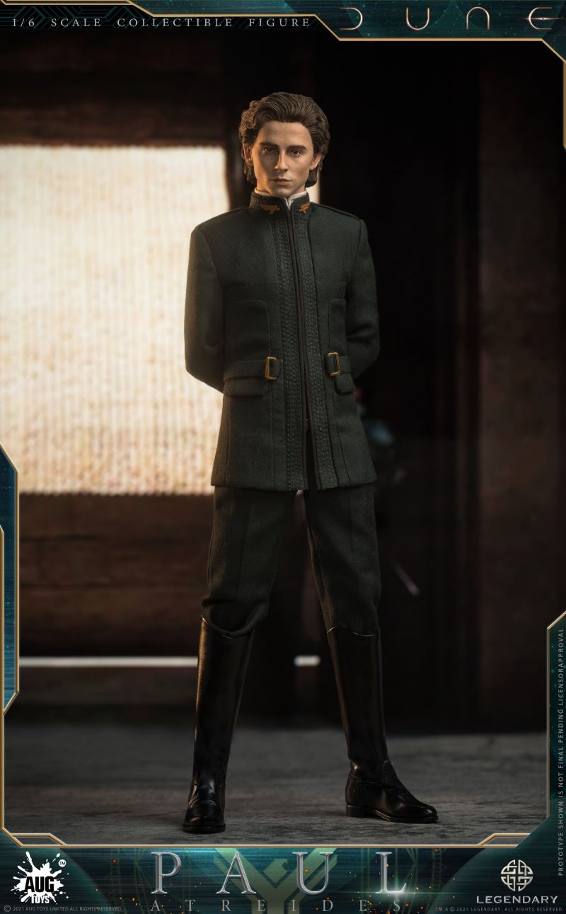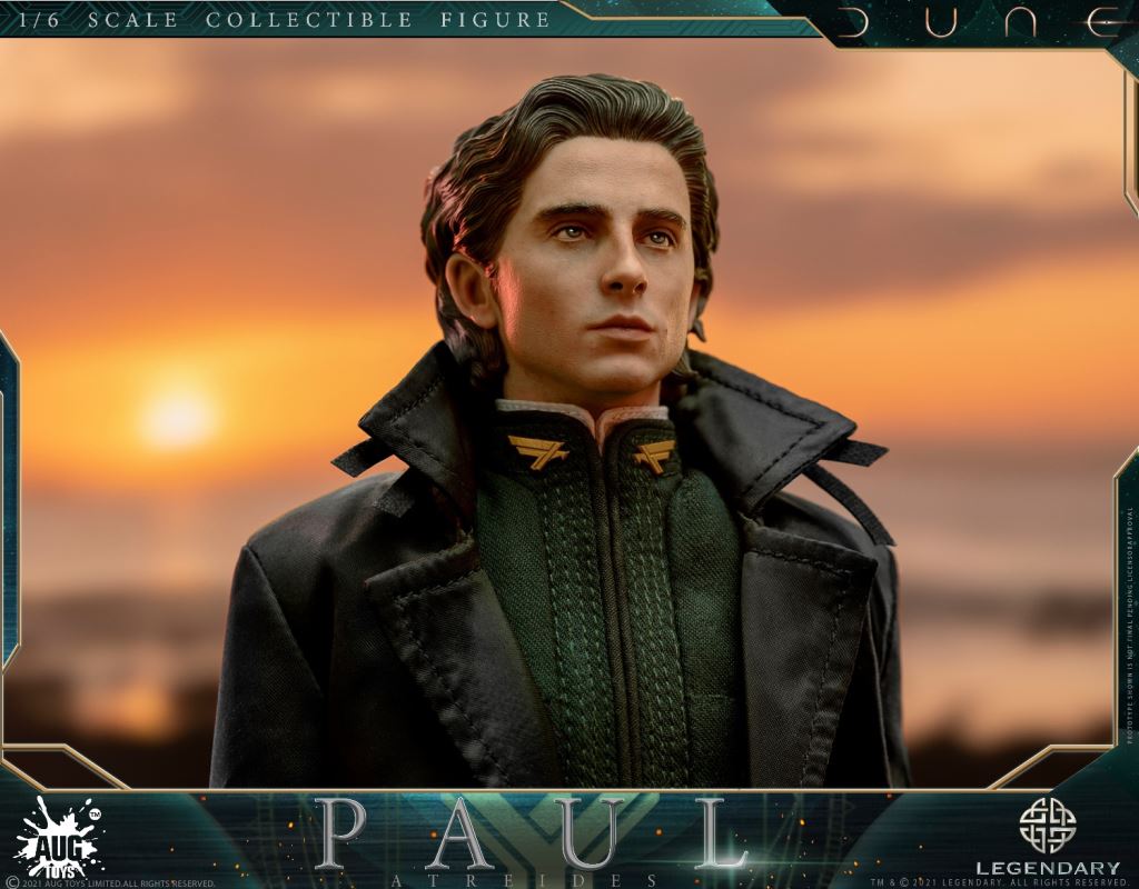 AUG TOYS Dune Paul Atreides' 1:6 scale collectible dollDune is a legendary Hollywood science fiction masterpiece created by Legendary Pictures and Warner Bros. Pictures and directed by Denis Villeneuve (director of Arrival and Blade Runner 2049), the new godfather of science fiction films. The film is based on Frank Herbert's well-known science fiction novel, starring Timothée Chalamet, Rebecca Ferguson, Oscar Isaac, Josh Brolin, Stellan Skarsgård, Zendaya, Chang Chen, Jason Momoa, and Javier Bardem.Dune is a legendary Hollywood science fiction masterpiece created by Legendary Pictures and Warner Bros. Pictures and directed by Denis Villeneuve (director of Arrival and Blade Runner 2049), the new godfather of science fiction films. The film is based on Frank Herbert's well-known science fiction novel, starring Timothée Chalamet, Rebecca Ferguson, Oscar Isaac, Josh Brolin, Stellan Skarsgård, Zendaya, Chang Chen, Jason Momoa, and Javier Bardem.AUG TOYS Dune Paul Atreides' 1:6 scale collectible doll product features:AUG TOYS has created a 31cm tall doll with more than 30 movable joints based on the shape and proportions of Paul Atreides in the Dune movie, which perfectly reproduces Paul's body shape.Meanwhile, the AUG TOYS production team restores the formal dress of Paul Atreides in House Atreides in 1:6 scale according to the texture, material, and line proportion of the movie costume. As the son and heir of the great Duke of House Atreides, Paul is wearing a gown with his father to welcome the decree from Padishah Emperor. During the solemn and grand ceremony, Paul's dress was decorated with exclusive gold trim on the shoulders and collar of his family and rank. In order to guarantee the collectibility of the product, AUG TOYS has picked the more durable leather material to make the boots, so they are more collectible. In terms of head sculpture, a wax-painted head sculpture regarding the role of Paul played by Timothée Chalamet (Sweet Tea) is equipped. In terms of accessories, in addition to the nine interchangeable hand shapes, the AUGTOYS team has specially restored the hovering light that appears several times in the play and has a light-up function. Furthermore, Paul's learning process of the encyclopedia and books is also essential. Thus, the pain box is a must-have for Dune fans when Paul is tested by Sororities!Product No.: DL001Product Barcode: 6972842530042Release Date: Approximately 3rd to 4th quarter of 2022Scale: 1/6Product List:-Basic head sculpture-30 articulated movable elements-9 interchangeable hands including-A pair of natural hands-A pair of holding hands-A outstretched hand-A pair of gloved hands holding an object-A pair of natural and gloved handsClothing:- One hat- One army green gown- A pair of pants in an army green gown- A pair of black boots (leather material)- A black trench coat (with built-in wire)Accessories:-Encyclopedia-Hover lamp-Books-A pain box-Specially designed with the House Atreides family logo on the floor and character name tags**The picture shown is not the final product prototype, pending licensee approval.**Any changes to the product details will be announced through our official account.