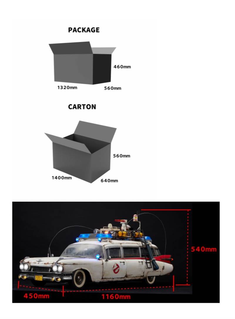 PRODUCT INFORMATIONLicense: GHOSTBUSTERS: AFTERLIFE, 2022Licensor: Sony Columbia PicturesProduct No: BW-UMS 11901Product Type: Premium UMS (1/6th Scale Vehicle)Product Size: L 1160mm W 450mm H 540mmProduct Weight : Approximately 33kg (including Package)Dimension:1. Package Dimension: Approximately W 1320mm L 560mm H 460mm2. Carton Dimension: Approximately W 1400mm L 640mm H 560mm(1 pc / 1 carton)(Dimension and weight could be changed later.)UPC: 8809321479593Estimate Shipment: 1Q, 2023Price: 1699 USDLimited Edition: TBDDESCRIPTIONOnce the icon of an era, the Ecto-1 has become a legend over 30 years of time andmemories.Although old and beat-up, the massive vehicle, like a giant beast with its hidden claws,is coming back with the familiar siren sound.As deep wrinkles have lain on the faces of the heroes who hunted down ghosts withfantastic and secret devices, the body of Ecto-1, once pure white, is stained with dirt,full of bumps and scratches now.However, the body, which powerfully runs forward with the engine making a noisysound, is rich in various secret devices.The gunner seat that pops out when the side door opens is exactly reproduced asseen in the movie.Used to catch ghosts, the R.T.V. takes off from the bottom of the vehicle body also asit does in the movie.The world's best model car ECTO-1 is over 40 inches long and of unbelievable quality.In memory of the late Harold Allen Ramis, the development team of Blitzwaypresents you with a special memory along with the movie moving you.PRODUCT SPECIFICATIONS. Highly Detailed likeness of ECTO-1 from the GHOSTBUSTERS: AFTERLIFE, 2022. Highly Detailed likeness of the 1959 Cadillac Miller-Meteor Ambulance. Accurate roof rack and exterior structures. Precise and detailed engine and underside. Realistically designed structures and props. 37 LED Light-up functions on the exterior & interior. Rotating light bars with 2 motors. Effect of Siren sound. Features audio paly with USB & micro SD plug-in. Fully openable of 5 doors and bonnet. Interlocking of front wheels and steering wheel. Turnable 4 Wheels. 4 Ghostbusters’ figures can fit in[Notice]Prototype samples are shown.Product details could be subjected to change without prior notice.[MATERIALS]1. Body: ABS2. Window: PC3. Tire: PVC4. Accessories: ABS,PVC,Metal5. Equipments: ABS,PVC,PC,Metal6. Package: Color EPP + Color Box[CREATORS]Producer: SungWoong Bae, Won ChoiPlanner: SungWoong BaeExecutive Director: Director K (Kwon Hyuck Chul)Marketing: Won ChoiSenior Director: Typhoon KimProduction Management: Director K (Kwon Hyuck Chul)Art director: K. A. KimArt Supervisor: RainmanDesign & 3D works: Konkuk KimPainting: Kwangse Oh, Hansol YuAssistant Artist: Kyoungwook Kim, Hyun Woo Nam, Byung Hun LeeElectric Device & Lighting: Konkuk KimGraphic Design: Zhou hai, MCjoajoaAssistant Manager: Eric Lee, Lang XuPhotographer: Shingiru Studio, ReFe YoonEditor of Photography: Zhou haiPackage Design: Zhou haiThe Blitzway Design & Development TeamManufactured by : BLITZWAY CO., LTD.