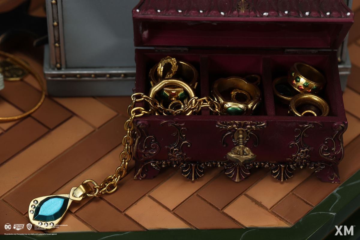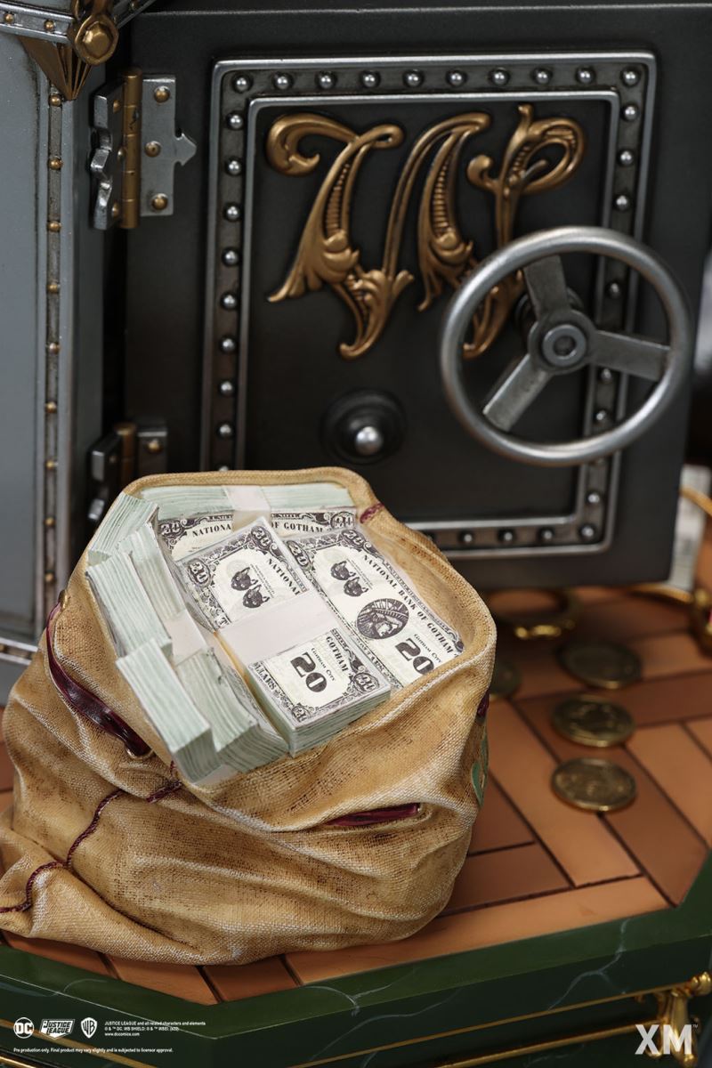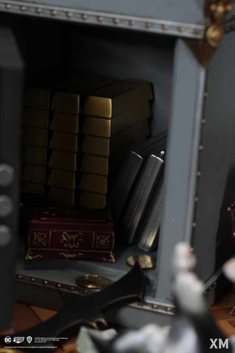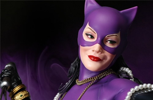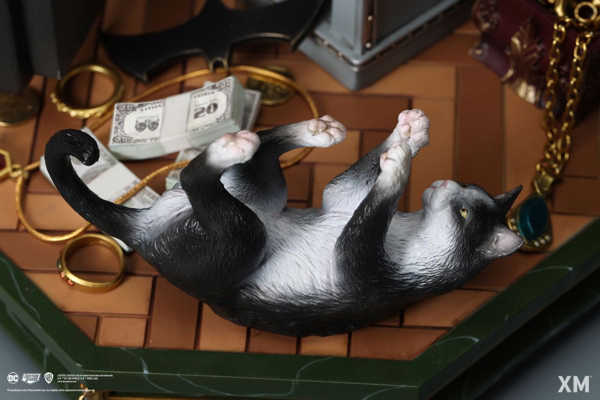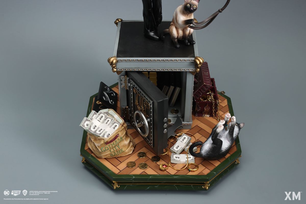 โจรแห่งเมืองก็อตแธม การตั้งค่าสำหรับรูปปั้นนี้ทำให้แคทวูแมนอยู่ในองค์ประกอบตามธรรมชาติของเธอและทำในสิ่งที่เธอทำได้ดีที่สุด สวมสร้อยคอมุกขณะหมุนแส้เครื่องหมายการค้าอันยาวเหยียดไปรอบๆ ตัวเธออย่างสนุกสนาน มีคนเห็นเธอยืนอยู่บนรองเท้าส้นสูงเปิดตู้เซฟพร้อมกองเงินสดและเครื่องประดับมากมายรอบตัวเธอ คราวนี้เธอเอาอุ้งเท้าของเธอปลอดภัยจากใคร แม้ว่าคุณอาจจะถาม? ตัว 'W' ที่หุ้มด้วยทองคำขนาดใหญ่บนตู้เซฟอาจให้เบาะแสได้