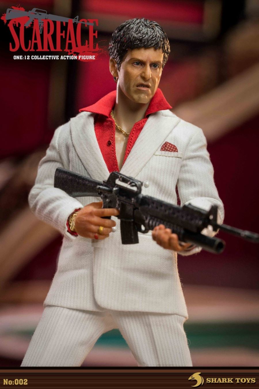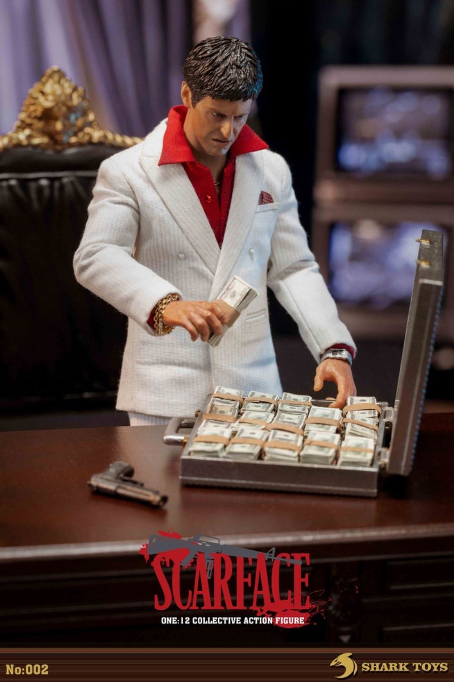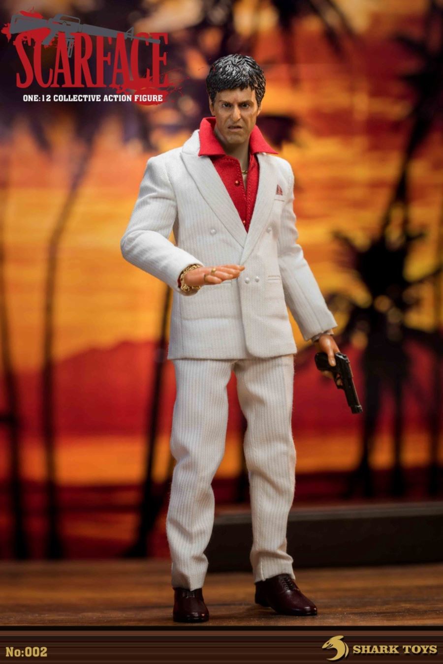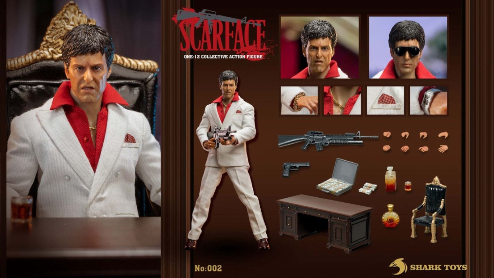 List:– Normal head carving*1– Emoji head carving*1– Replacement hand *8– 1/12 body*1clothing:– White top*1– red shirt*1– white pants*1– Leather shoes*1Accessories:– Necklace*2– Bracelet*1– USD*1– Pistol*1– Wine bottle*2– Wine glass*1– Table*1– Chair*1– Suitcase*1– Assault Rifle*1