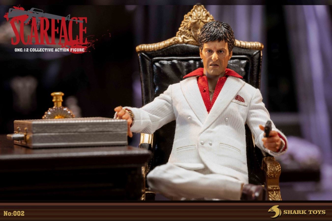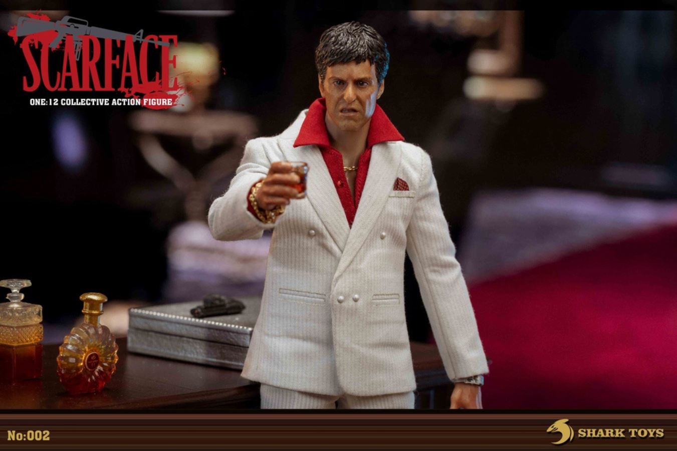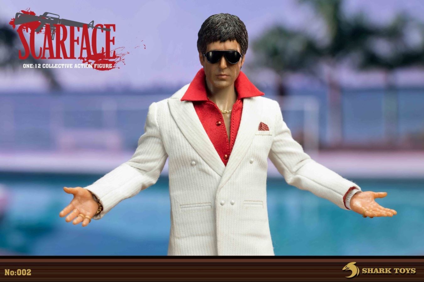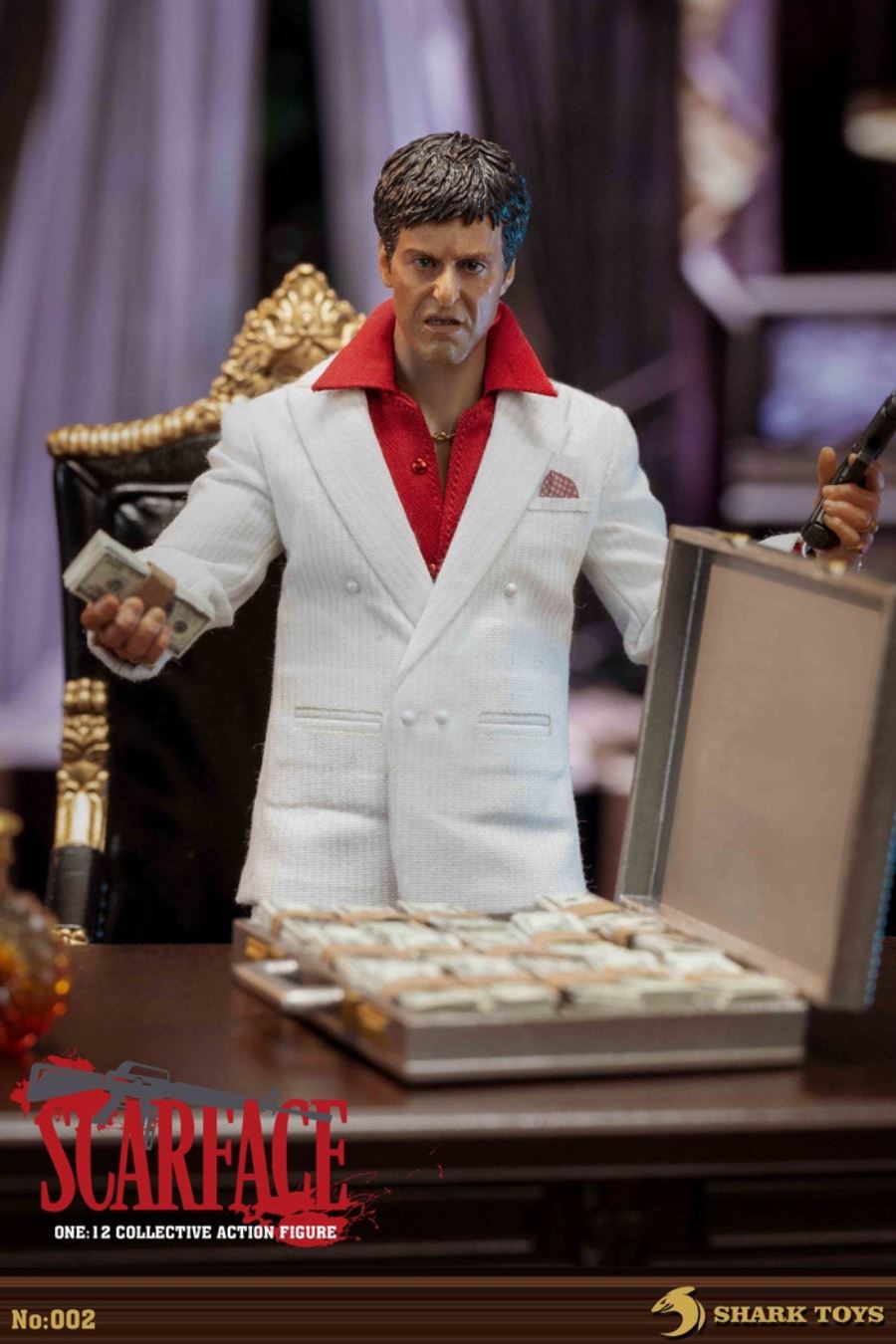 List:– Normal head carving*1– Emoji head carving*1– Replacement hand *8– 1/12 body*1clothing:– White top*1– red shirt*1– white pants*1– Leather shoes*1Accessories:– Necklace*2– Bracelet*1– USD*1– Pistol*1– Wine bottle*2– Wine glass*1– Table*1– Chair*1– Suitcase*1– Assault Rifle*1
