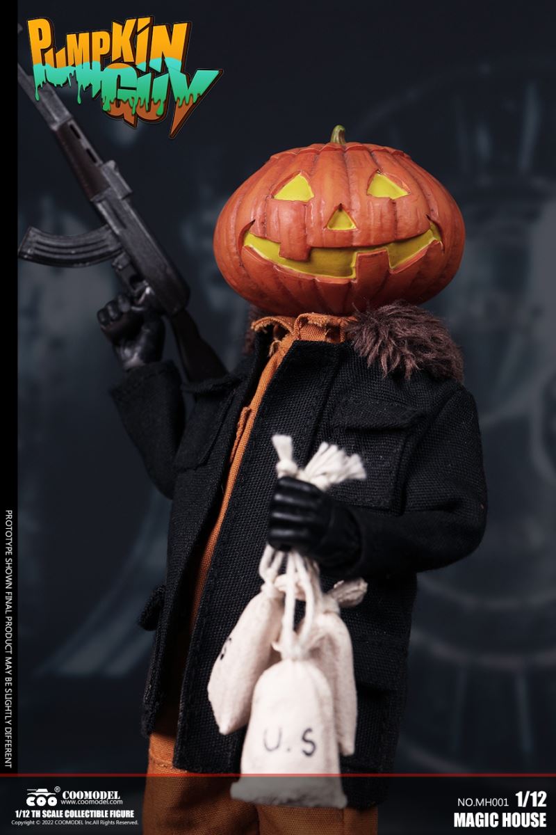 COOMODEL 1/12 MH002 MAGIC HOUSE - PUMPKIN GUY (EXCLUSIVE VERSION)BARCODE:6971242122024The 1/12th Pumpkin Guy (Exclusive Ver.) Collectible Figure Specially Features:- One (1) pumpkin head sculpt- One (1) evil pumpkin head sculpt- One (1) 1/12 active body- Six (6) pieces of interchangeable palms in black glovesCostumes:- One (1) white T-shirt- One (1) orange coverall- One (1) black coat with fur collar- One (1) pair of black bootsWeapons:- One (1) gold assault rifle- One (1) scythe- One (1) axeAccessoriess:- One (1) brick-based figure stand- Three (3) bags of US dollar