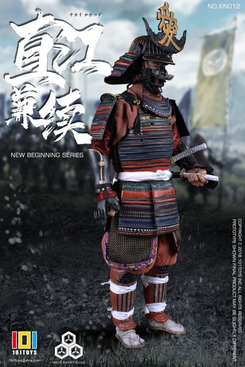 101TOYS 1/ 6 NO.KN012 NEW BEGINNER SERIES OF NAOE KANETSUGUMain Parts- One (1) head sculpt- One (1) body- Four (4) interchangeable palmsCostumes- One (1) brown coat- One (1) pair of light brown trousers- One (1) black belt- One (1) pair of white socks with sandalsArmors- One (1) black helmet with buck horns- One (1) black mask- One (1) black neck armor- One (1) black body armor- One (1) pair of black shoulder armors- One (1) pair of black bracelets- One (1) pair of black cuisses- One (1) white rope beltWeapons- One (1) long sword with scabbard- One (1) short sword with scabbard