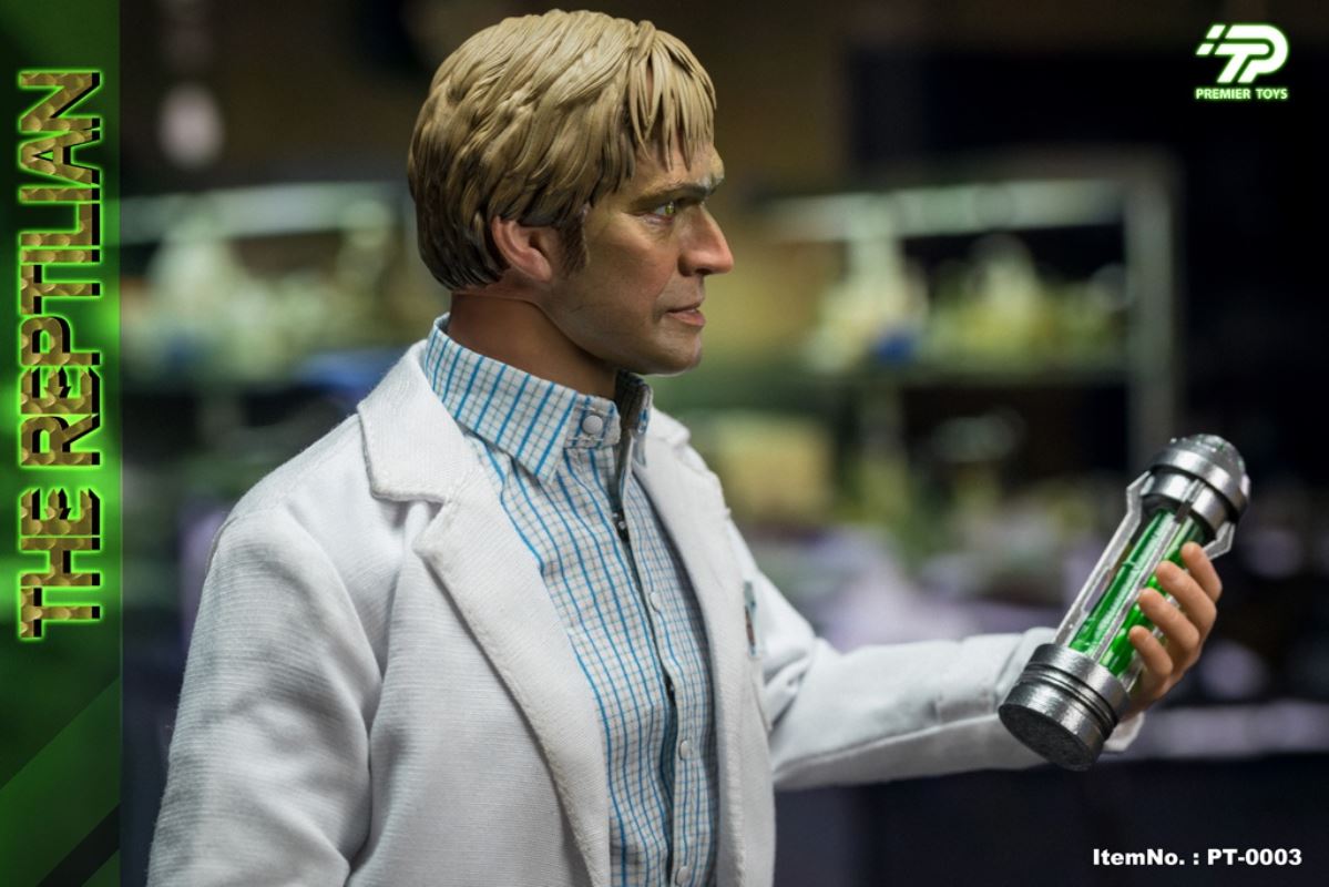 The 1/6th scale The Reptilian (Version A) Collectible Figure features:- Highly realistic detailed head sculpt- Highly detailed scaly creature skin textured sculpture- Especially hand-painted and blended in multiple greens colors and olive drab- 1/6 scale body with 17 points of articulation- Outer skin in vinyl material on a PVC body with soft PVC tail- Approximately 42 cm tall- Four (4) pieces of interchangeable hands including:- One (1) pair of open hands- One (1) pair semi-opened handsCostume:- One (1) white torn lab coatAccessories:- Two(2) Serum canisters
