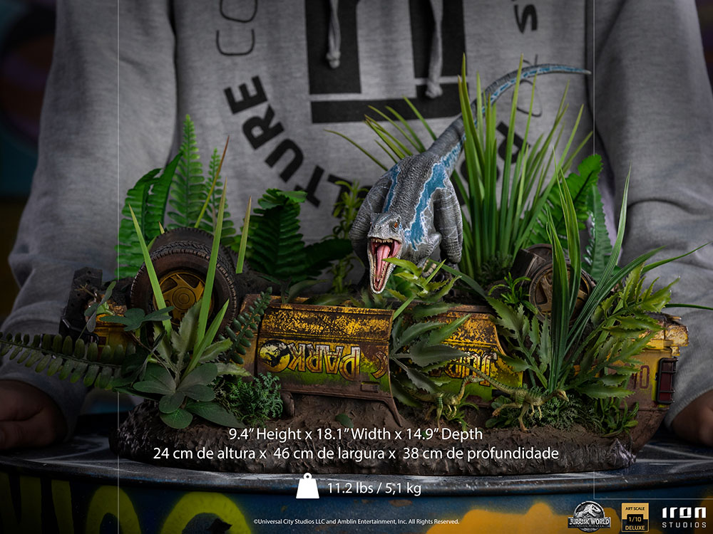 ABOUT THIS 1:10 SCALE STATUESideshow and Iron Studios present the latest from the Art Scale 1:10 Iron Studios statues line — Blue Deluxe! Based on original references from Jurassic World: Fallen Kingdom, this polystone Jurassic Park statue is hand painted and limited edition. Jurassic Park collectibles fans, don't miss your chance to add Blue to your Jurassic Park collection!BrandJurassic World: Fallen KingdomManufacturerIron StudiosType1:10 Scale StatueGenreSci-fi Pop Culture Dinosaur Action AdventureWHAT'S IN THE BOX?The Blue Deluxe 1:10 Art Scale Statue features:Limited EditionMade in PolystoneHand-PaintedADDITIONAL DETAILS & DIMENSIONSMaterialsPolystoneProduct SizeHeight: 9.4 (23.9 cm)Width: 18.1 (46 cm)Depth: 14.9 (37.8 cm)Weight: 11.2 lbs (5.1 kg) *Shipping Weight0.00 lbs (0 kg) ** Size and weight are approximate values.SKU9110132UPC618231950355Item shown is a prototype. When shipped, the final production piece may differ in appearance.©Universal City Studios LLC and Amblin Entertainment, Inc. All Rights Reserved.