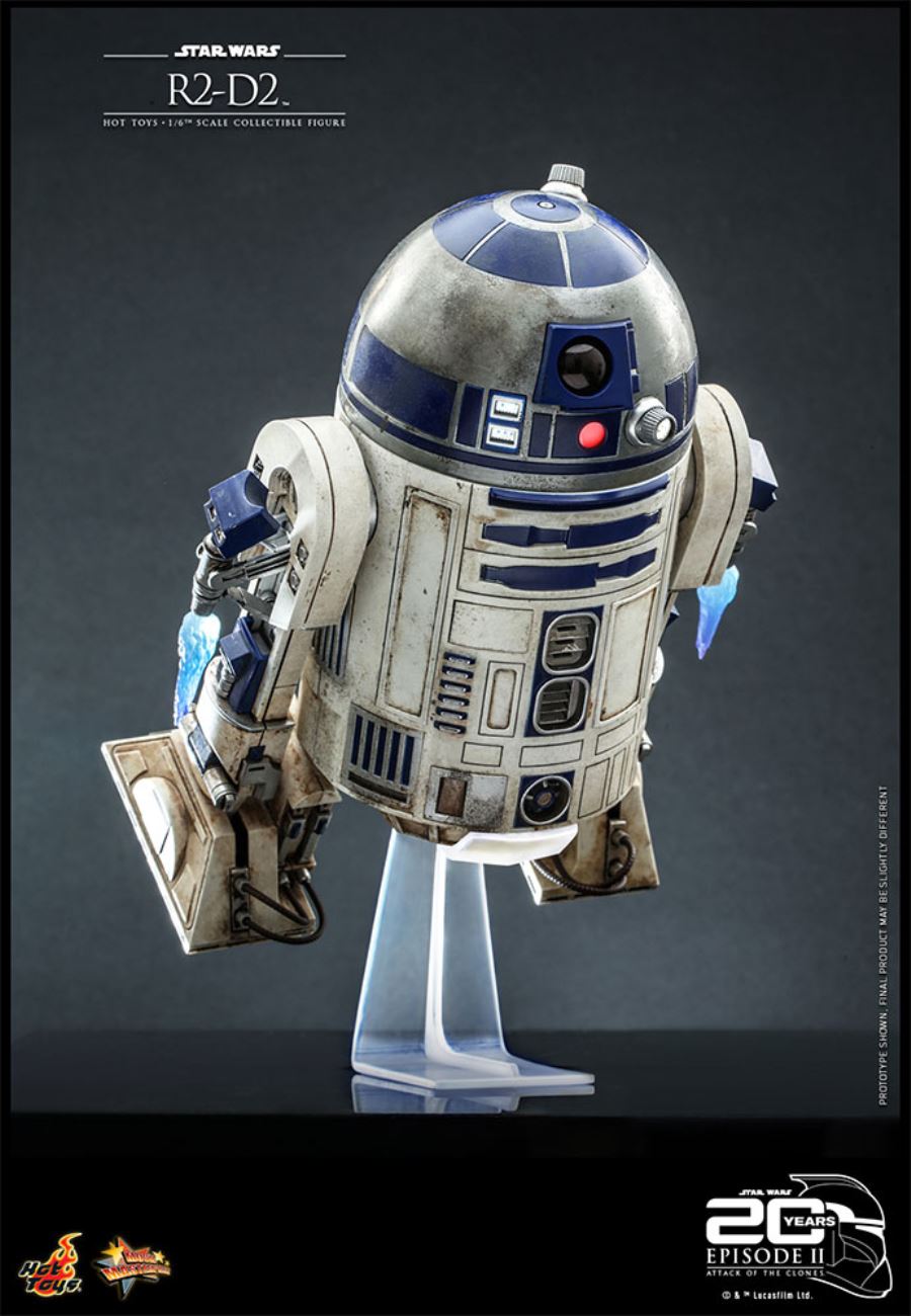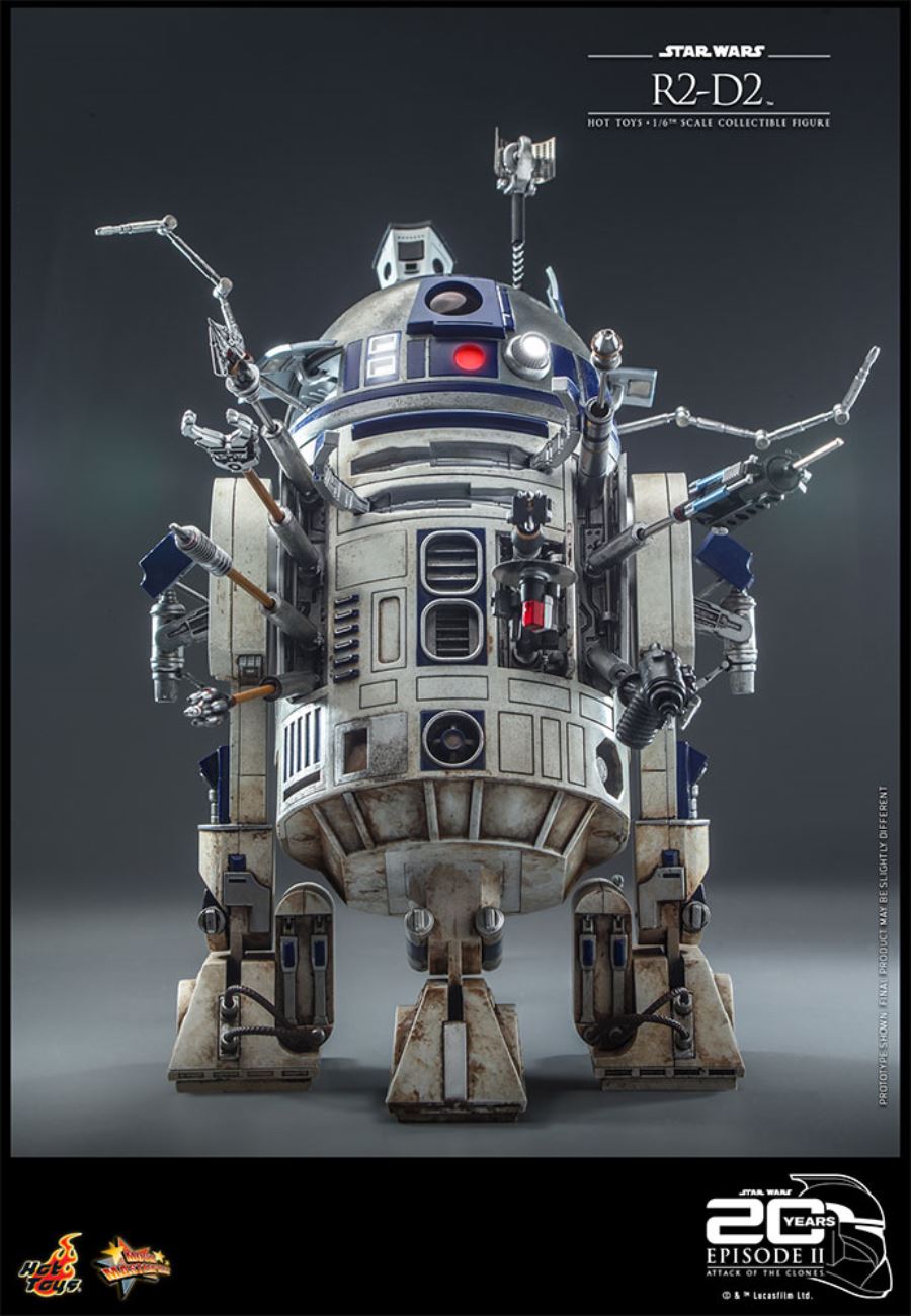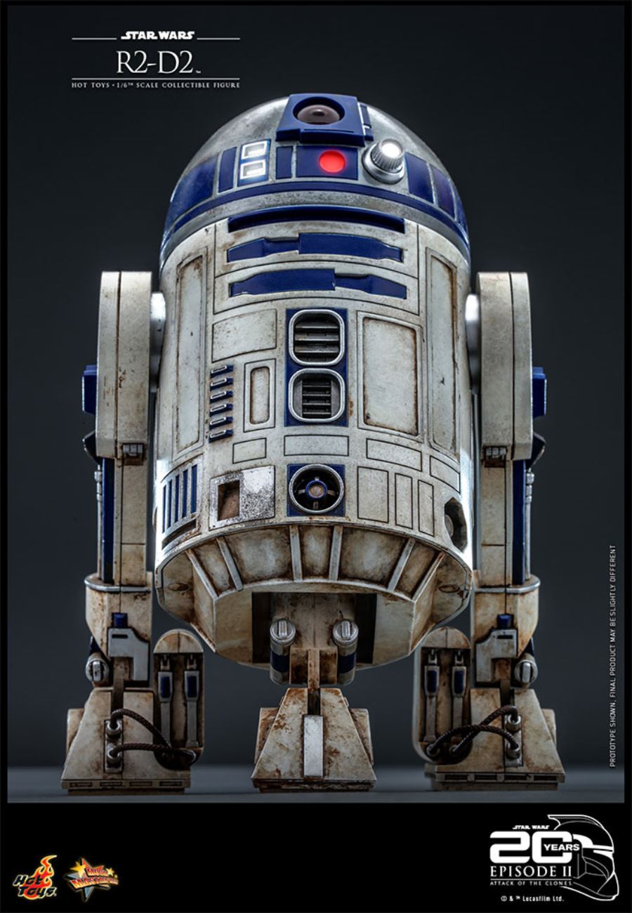 ABOUT THIS SIXTH SCALE FIGUREA reliable and versatile astromech droid, R2-D2 has served Padmé Amidala and Anakin Skywalker, showing great bravery in rescuing his masters and their friends from many perils. A skilled starship mechanic and fighter pilot's assistant, he has an unlikely but enduring friendship with the fussy protocol droid C-3PO.Celebrating the 20th anniversary of Star Wars: Attack of the Clones, Sideshow and Hot Toys is pleased to officially introduce a series of collectibles based on this landmark film for fans! The R2-D2 Sixth Scale Collectible Figure is skillfully crafted with a diecast metal dome, a highly detailed mechanical construction body with openable panels and a retractable middle leg, weathered paint application, an array of accessories including a pair of rocket thrusters, a tether cable for recreating the scene when R2-D2 fixes C-3PO, a collection of attachable mechanical arms and tools, as well as a specially designed commemorative packaging.Don’t miss the opportunity to pair R2-D2 with C-3PO in your amazing collection today!BrandStar WarsManufacturerHot ToysTypeSixth Scale FigureGenreSci-fi Pop CultureWHAT'S IN THE BOX?The R2-D2 Sixth Scale Figure features:Authentic and detailed likeness of R2-D2 in Star Wars Episode II: Attack of the ClonesMeticulously crafted diecast metal dome features 360° horizontal spin designSkillfully applied with realistic weathering effects Screen-accurate mechanical construction with 10 points of articulationsApproximately 18cm tallRemote controlled LED light-up functions (8 sets of LED light-up points, battery operated)Remote controlled sound effect function featuring 14 iconic R2-D2 sounds (battery operated)One (1) pair of articulated terrain tread legsOne (1) articulated and retractable center tread legOne (1) extending periscopeOpenable panels Special package design with Star Wars: Attack of the Clones 20th Anniversary logo Accessories:One (1) C-3PO mechanical head with LED light-up function (yellow light, battery operated) One (1) pair of rocket thrusters for flight mode with two (2) real-like thruster fire effectsThirteen (13) pieces of arms (some equipped with magnetic function): One (1) tether cableOne (1) life-form scannerOne (1) computer terminal armTwo (2) lock pick armsOne (1) repair armTwo (2) multi-function utility and interface armsOne (1) pair of computer interface armsOne (1) utility armOne (1) utility sawOne (1) universal computer interface armOne (1) infrared remote control for R2-D2’s sound effect and LED light-up functions (battery operated)One (1) specially designed figure standADDITIONAL DETAILS & DIMENSIONSMaterialsProduct SizeHeight: 7.09 (18 cm) *Box SizeHeight: 5.50 (14 cm)Width: 10.00 (25.4 cm)Depth: 15.50 (39.4 cm) *Shipping Weight5.00 lbs (2.3 kg) ** Size and weight are approximate values.SKU911040UPC4895228611437Item shown is a prototype. When shipped, the final production piece may differ in appearance.© & TM Lucasfilm Ltd. © 2022 Hot Toys Limited. All Rights Reserved.