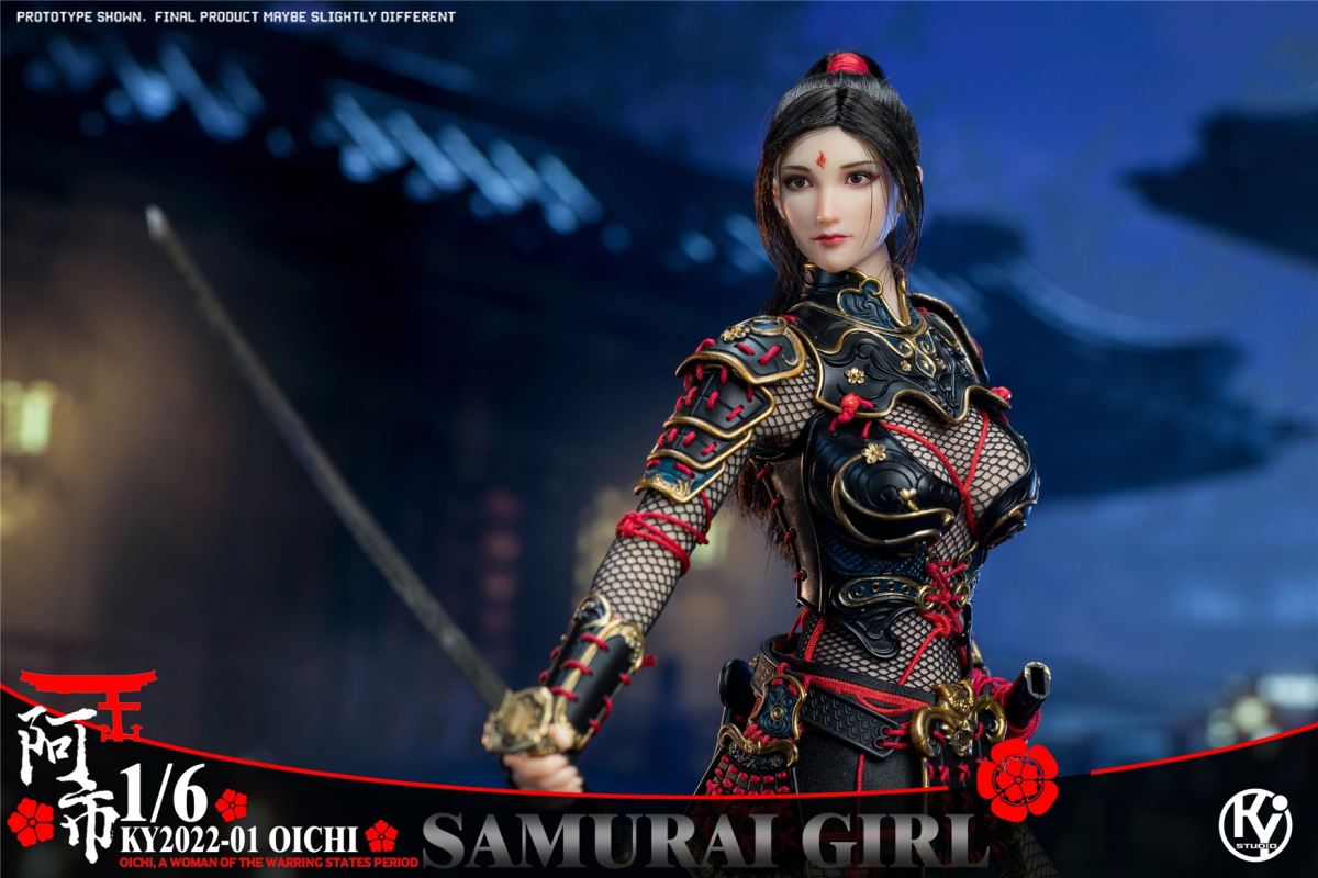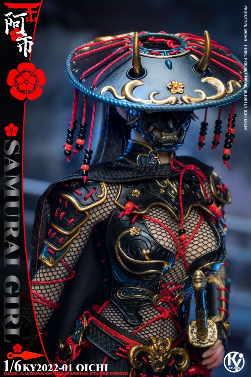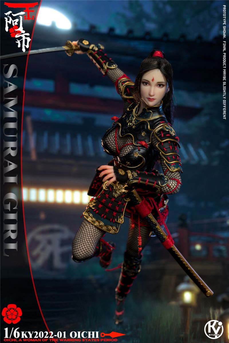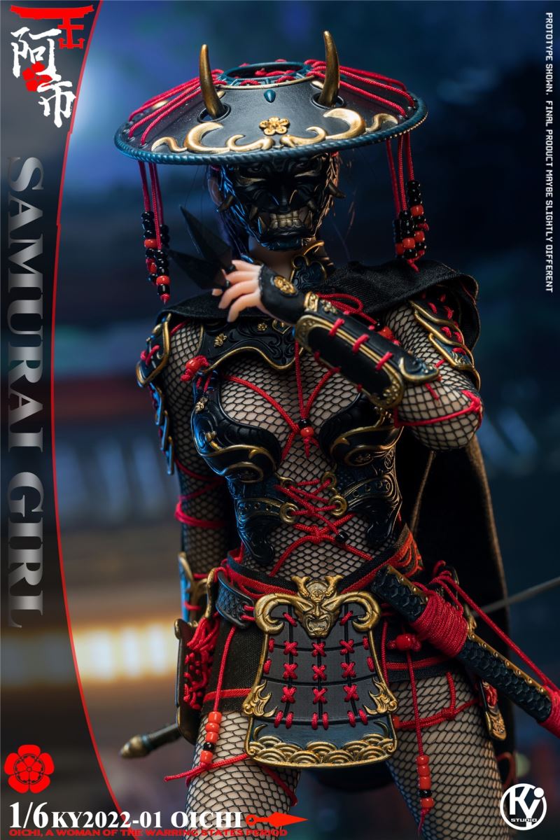 Kystudio ky2022-01 1/6 Japanese Warring States Period Female Warrior Series (OICHI)Product number NO:KY2022-01Product catalog:TBLS10D Encapsulated plastid x1Head carving x1(mask) x1(helmet) x1(neck protection) x1(breastplate) x1(back armor) x1(skirt armor) x1(shoulder armor) x4(hand guard) x2(knee pads) x2(leg guards) x2Fingernail X4Clog angle x2Samurai sword x1Dart x6Grenade x3Seamless one-piece mesh x1Tie rope x1Belt x1Cloak x1Platform x1Broken arrow X3Retail price: 1180.00 yuanShipment time: the fourth quarter of 2022