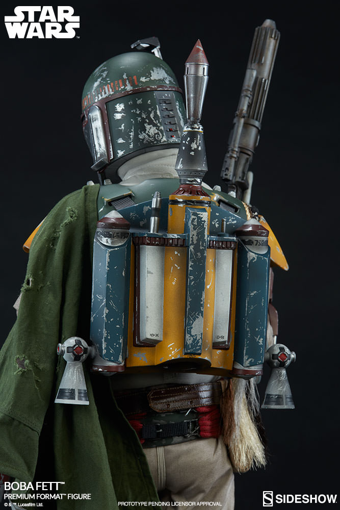 ABOUT THIS PREMIUM FORMAT™ FIGURE“He’s no good to me dead”Taking inspiration from his memorable appearance in Star Wars: Return of the Jedi, Sideshow has created an all-new Premium Format™ Figure that pays homage to the mysterious man-hunter! Standing atop a gritty and worn “Jabba’s Palace” character base, Boba Fett is a cold, calculating, and confident Bounty Hunter in his prime. Mixing highly-detailed sculpture with painstakingly tailored fabric elements, this museum-quality collectible has all the attention to detail and movie-accurate subtleties that our fans have come to expect from our Premium Format™ Figures Outfitted in his battle worn Mandalorian armor and jetpack, and wielding his EE-3 Blaster Carbine, Boba Fett is not a man to be trifled with, striking fear into the hearts of even the most hardened galactic gangsters. Every piece of Boba Fett’s iconic outfit has been lovingly reproduced in jaw-dropping detail. From the blaster-scorched and dented panels of his breastplate to each individually braided “Wookiee scalp” trophy! The Sideshow Exclusive variant features a swap-out hand with a concussion grenade launcher.LicenseStar WarsTypePremium Format™ FigureManufacturerSideshow CollectiblesArtistsJP Mavinga (Design)Matt Black (Sculpt)Alfred Paredes (Sculpt)Chadwick Anderson (Mold & Cast)Adam Smith (Mold & Cast)Jason Eaton (Paint)Casey Love (Paint) Esther Skandunas (Costume Fabrication)The Sideshow Design and Development TeamADDITIONAL DETAILS & DIMENSIONSExpected to ShipNov 2017 - Jan 2018Item shown is a prototype. When shipped, the final production piece may differ in appearance.Product Size20.75 H (527.05mm) x 9 W (228.6mm) x 10 L (254mm)*Product Weight25.00 lbs (11.34 kg)*Dimensional WeightTBDInt'l Dim. WeightTBD* Size and weight are approximate values.SKU3005151UPC747720233898© and ™ Lucasfilm Ltd.