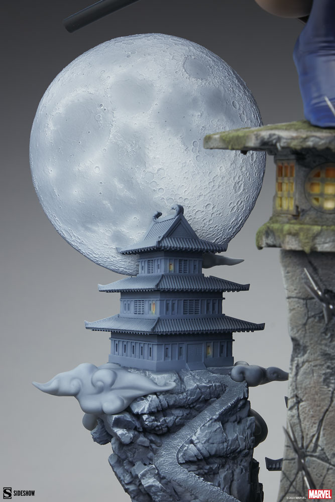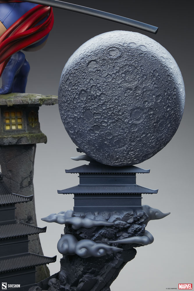 สวยงามและอันตราย กลายพันธุ์พลังจิตนี้อยู่ในภารกิจล้างแค้นใต้แสงจันทร์ ฟิกเกอร์ Psylocke Premium Format มีขนาดสูง 21” และกว้าง 13.41” ในฉากที่ตระการตาพร้อมฉากหลังแบบบังคับมุมมองที่ไม่เหมือนใคร Psylocke หมอบอยู่บนโคมหินที่เต็มไปด้วยชูริเคนซึ่งพลาดเป้าหมายที่เข้าใจยากของพวกมัน อาวุธใบมีด psionic บนแขนขวาของเธอทำให้เกิดเอฟเฟกต์รูปผีเสื้อจากพลังของเธอ ถัดจากเธอไป พระจันทร์เต็มดวงลอยขึ้นและฉายแสงและเงาผ่านเจดีย์คู่หนึ่งซึ่งนั่งต่อไปตามทางเดินบนภูเขา