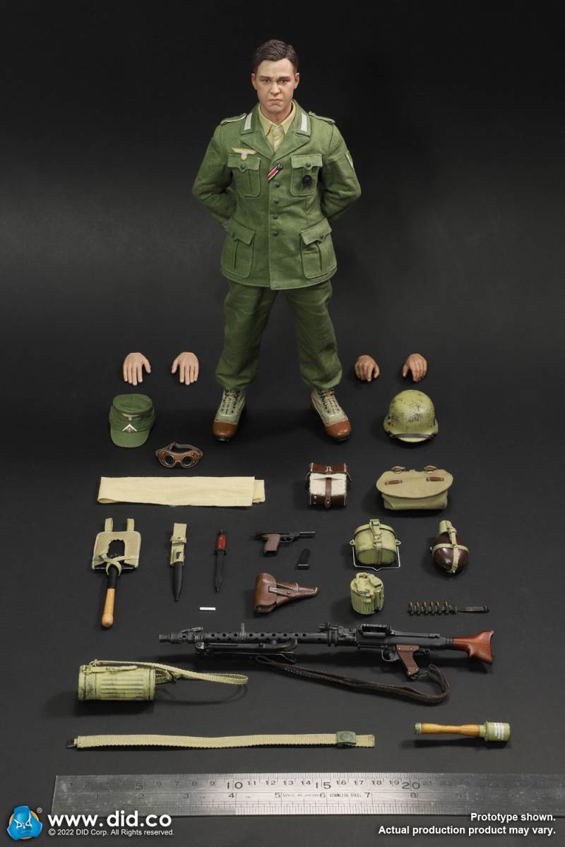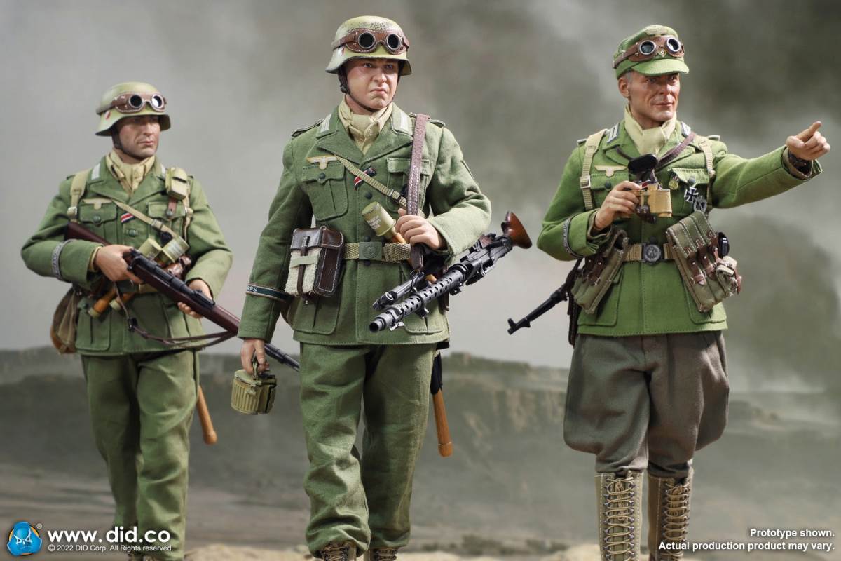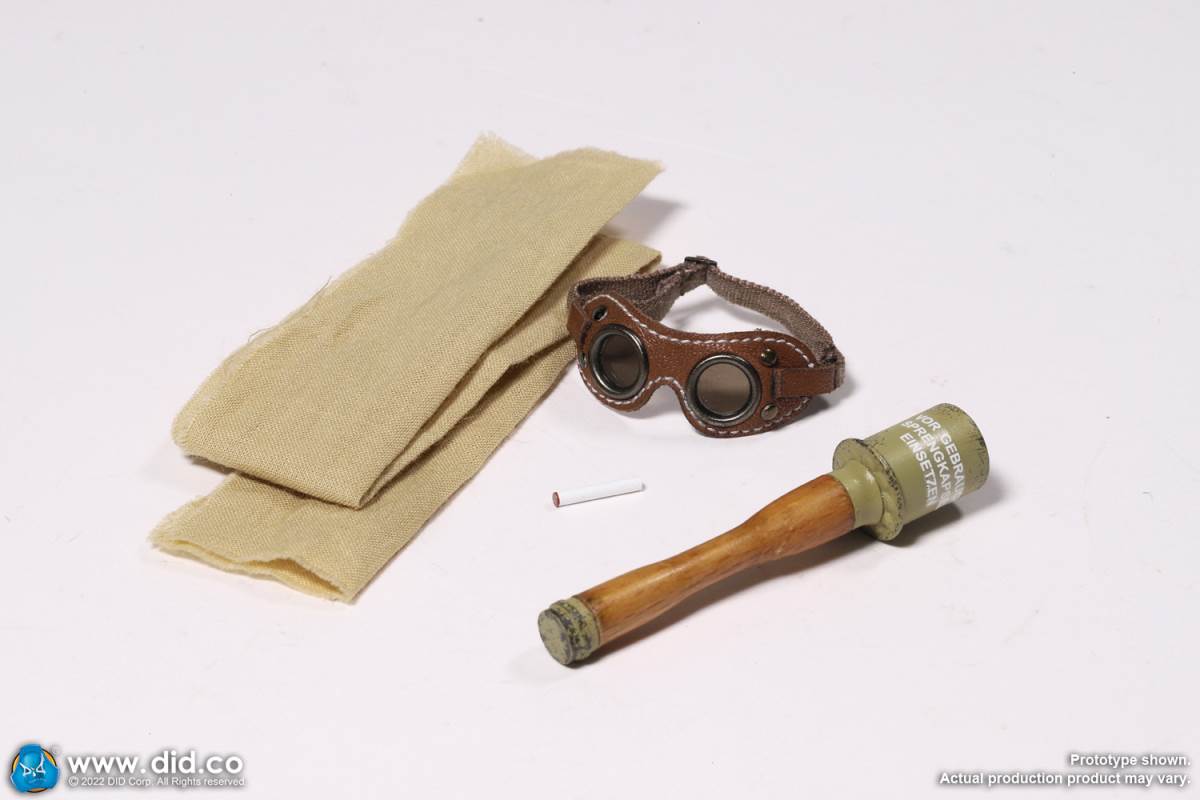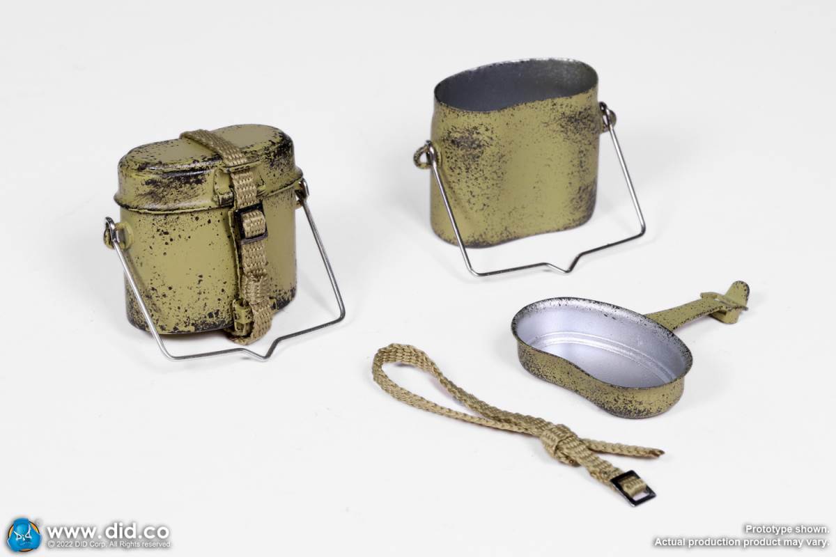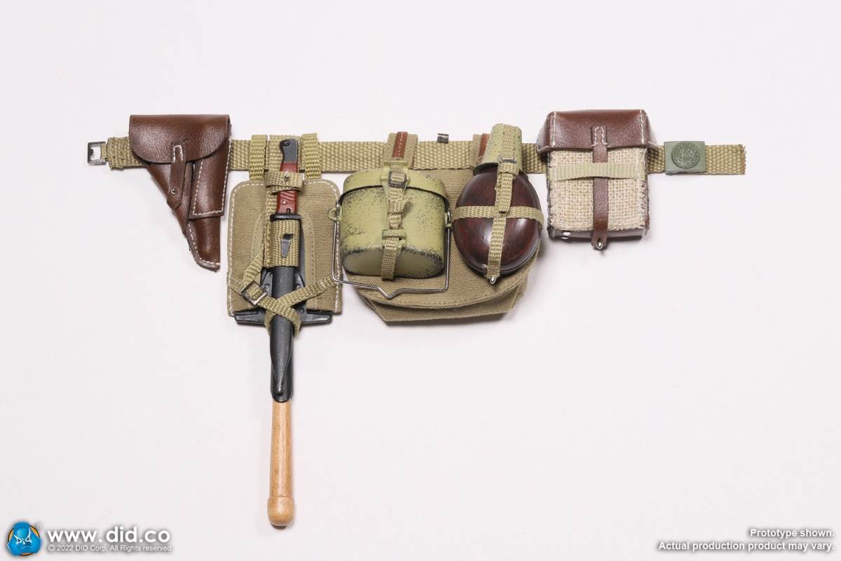 D80158 Accessories List Basic1 Head Carving2 DID 1/6 S Type Body (Standard Version)3 Palm X2 Pair of Clothing4 Helmet + Inner Support5 Combat Cap6 M40 Olive Green Uniform7 Olive Green Pants8 Sand Yellow Pullover Shirt9 Sand Yellow Scarf10 Belt11Canvas Leather Booties Accessories12Engineer Shovel + Shovel Cover13BreadBag14 Spiked Water Bottle (Old)15 Lunch Box (Old)16 Gas Mask Bucket (Old)17 Windproof Goggles18Brown Leather Repair Kit19Cigarettes Weapons20 bayonet + bayonet cover21 grenade X1 (old)22 P38 pistol + brown pistol holster (leather)23 MG34 machine gun + drum + bullet chain + 6 bullet badges24 Eagle mark X125 V letter X126 Black War Wounded Medal X127 CuffNote: The North African members (D80151 and D80152) in the picture are not included in D80158.
