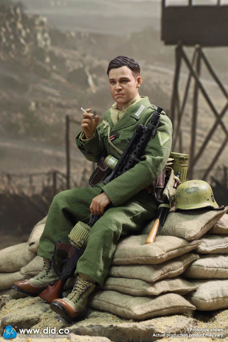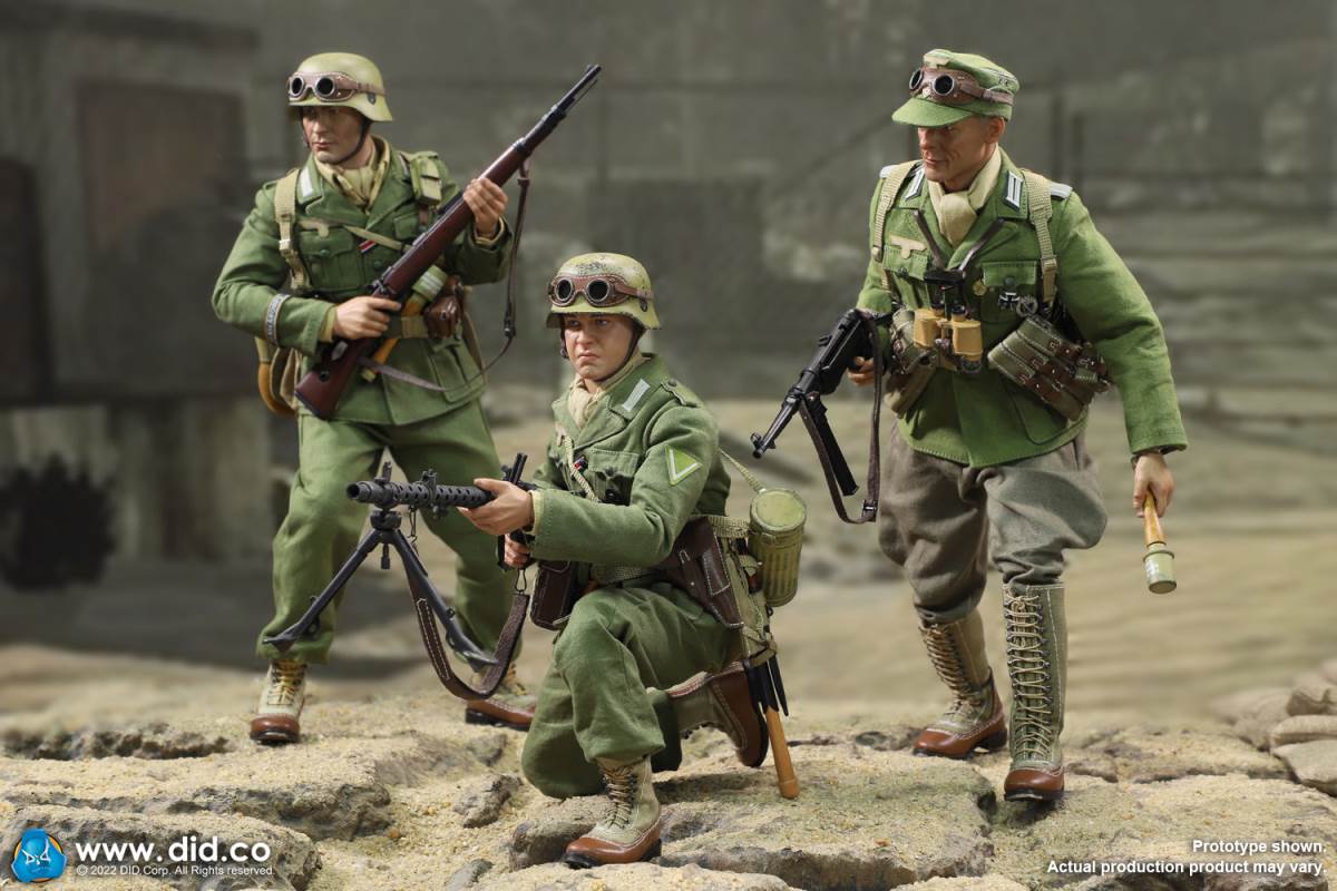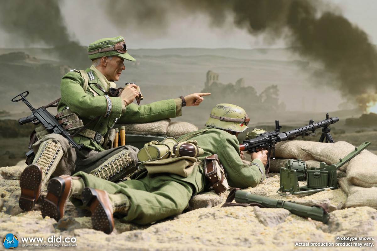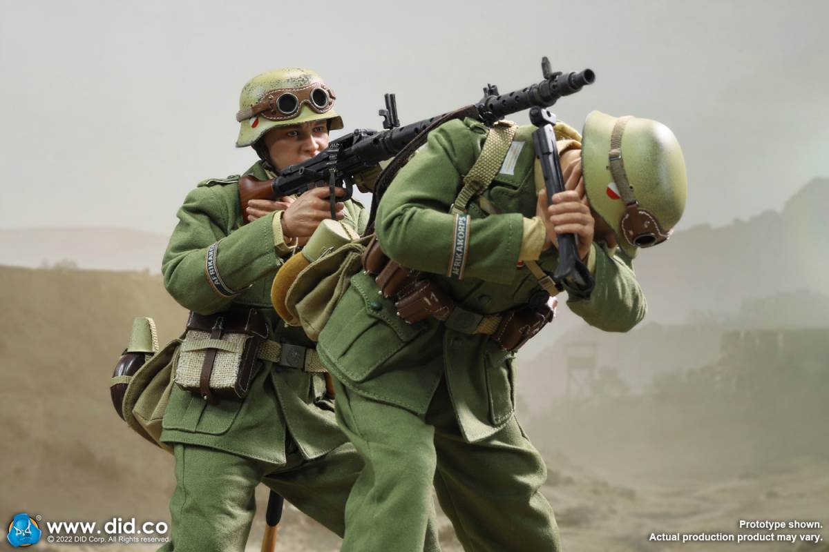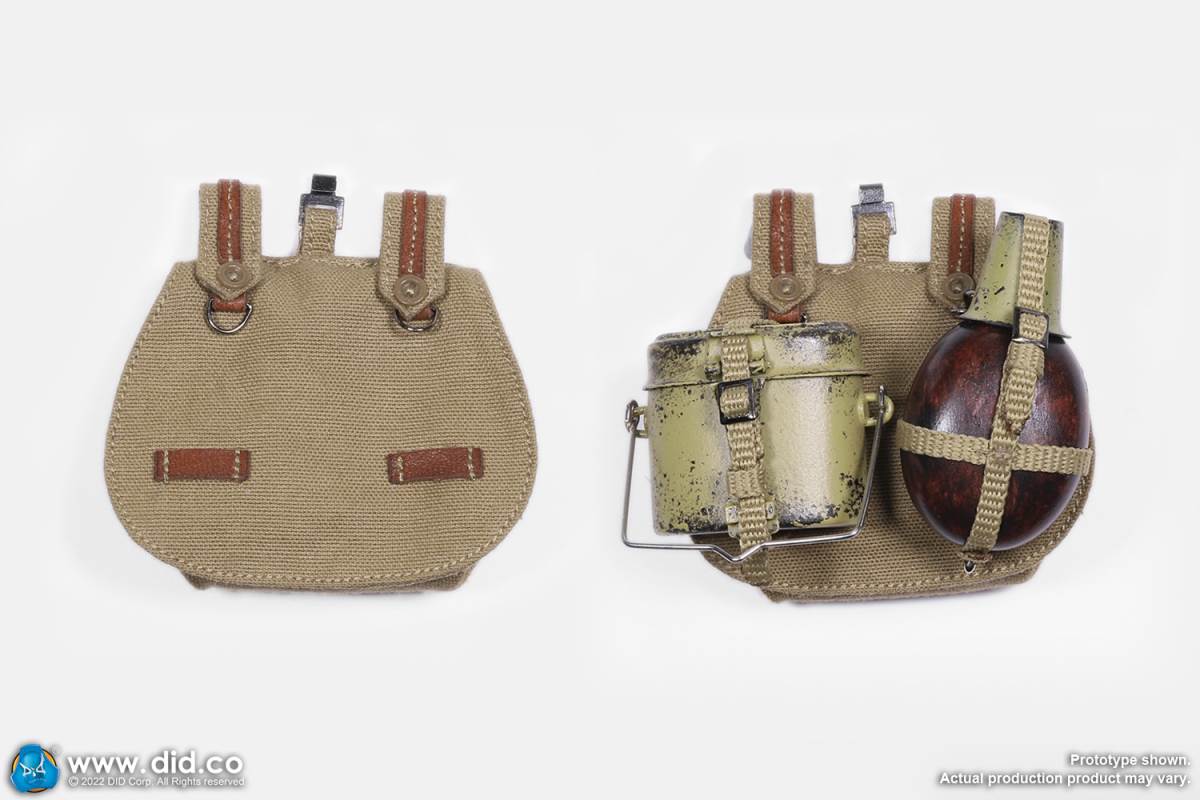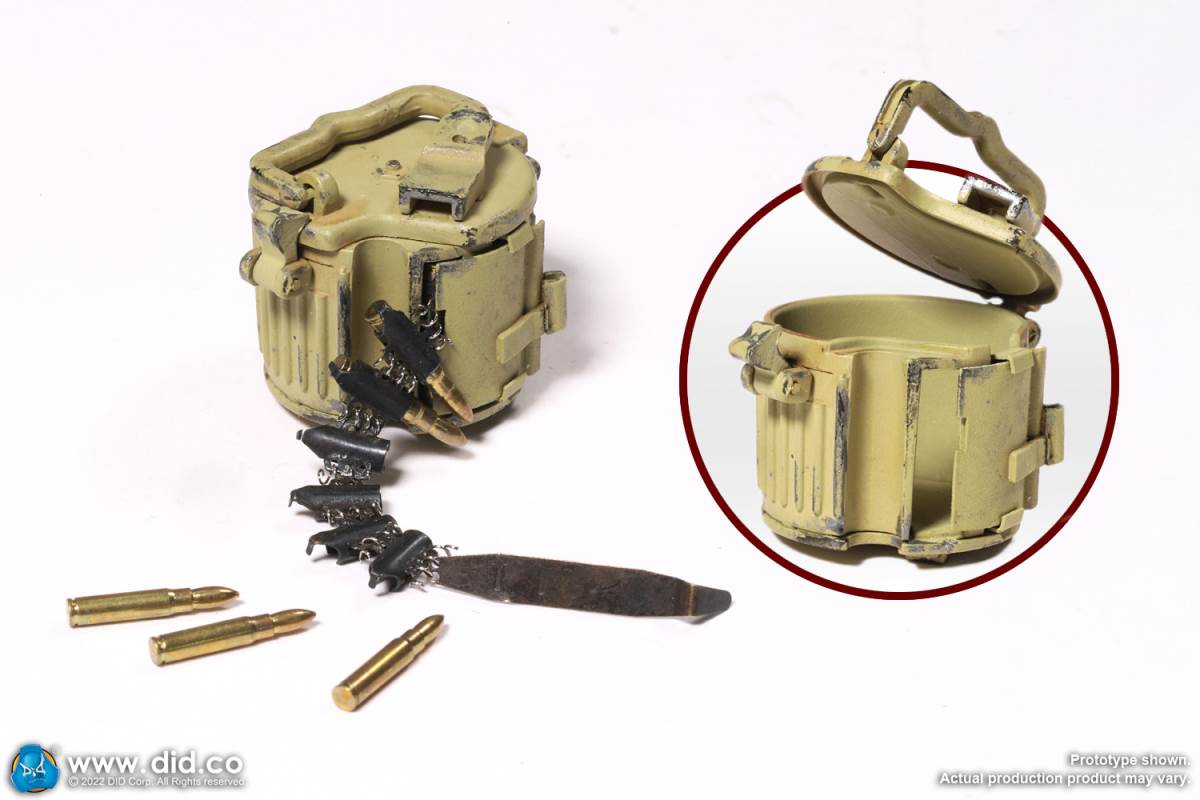 D80158 Accessories List Basic1 Head Carving2 DID 1/6 S Type Body (Standard Version)3 Palm X2 Pair of Clothing4 Helmet + Inner Support5 Combat Cap6 M40 Olive Green Uniform7 Olive Green Pants8 Sand Yellow Pullover Shirt9 Sand Yellow Scarf10 Belt11Canvas Leather Booties Accessories12Engineer Shovel + Shovel Cover13BreadBag14 Spiked Water Bottle (Old)15 Lunch Box (Old)16 Gas Mask Bucket (Old)17 Windproof Goggles18Brown Leather Repair Kit19Cigarettes Weapons20 bayonet + bayonet cover21 grenade X1 (old)22 P38 pistol + brown pistol holster (leather)23 MG34 machine gun + drum + bullet chain + 6 bullet badges24 Eagle mark X125 V letter X126 Black War Wounded Medal X127 CuffNote: The North African members (D80151 and D80152) in the picture are not included in D80158.