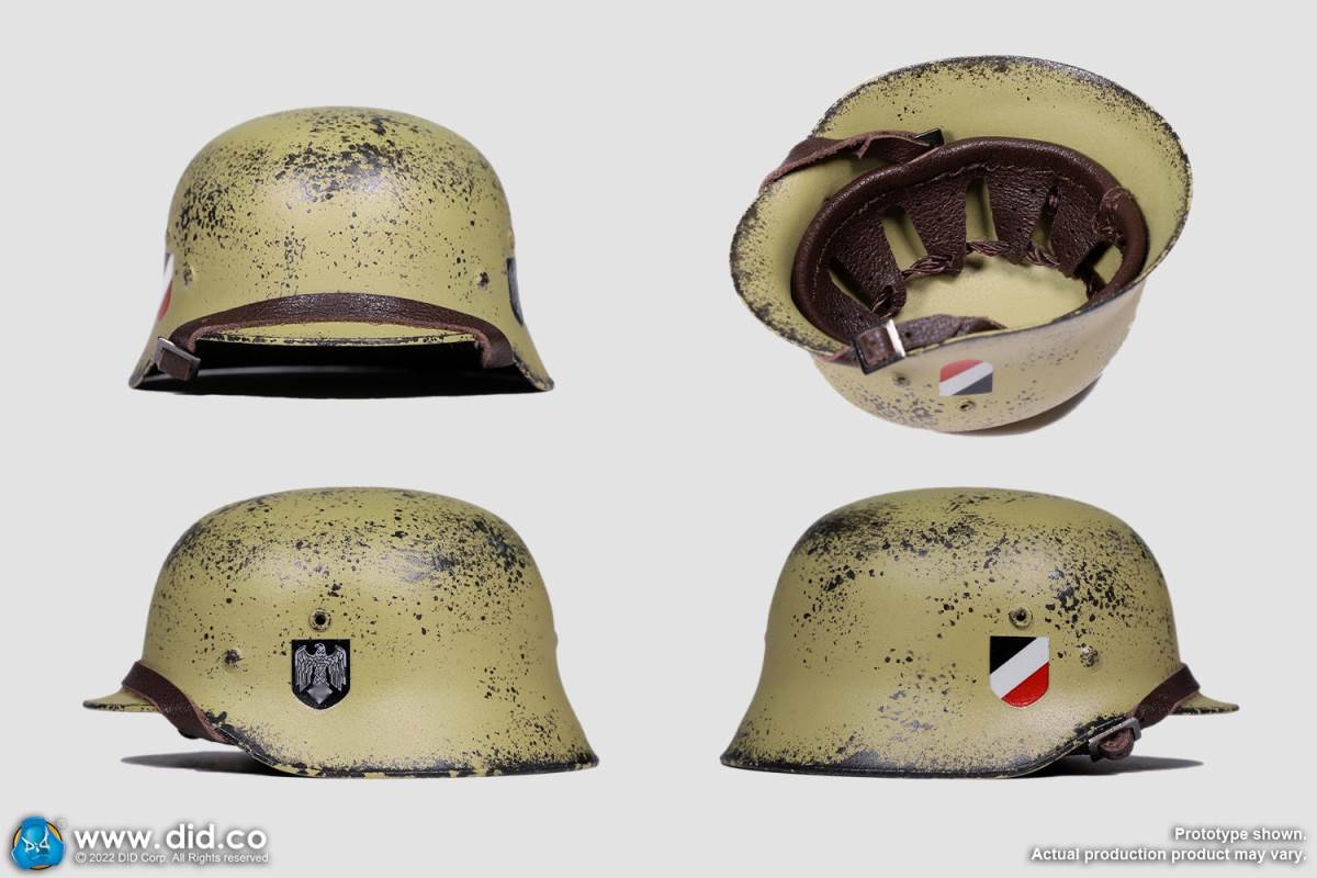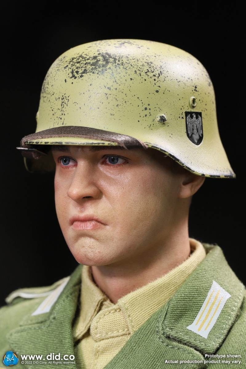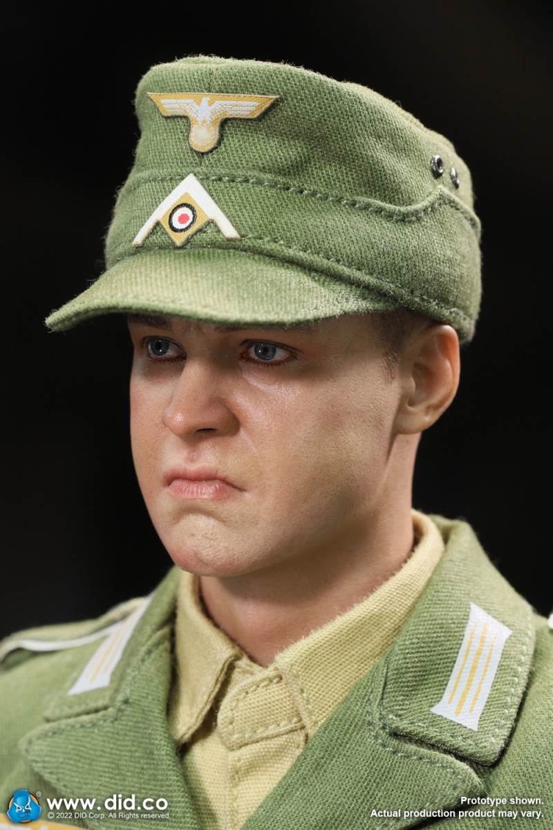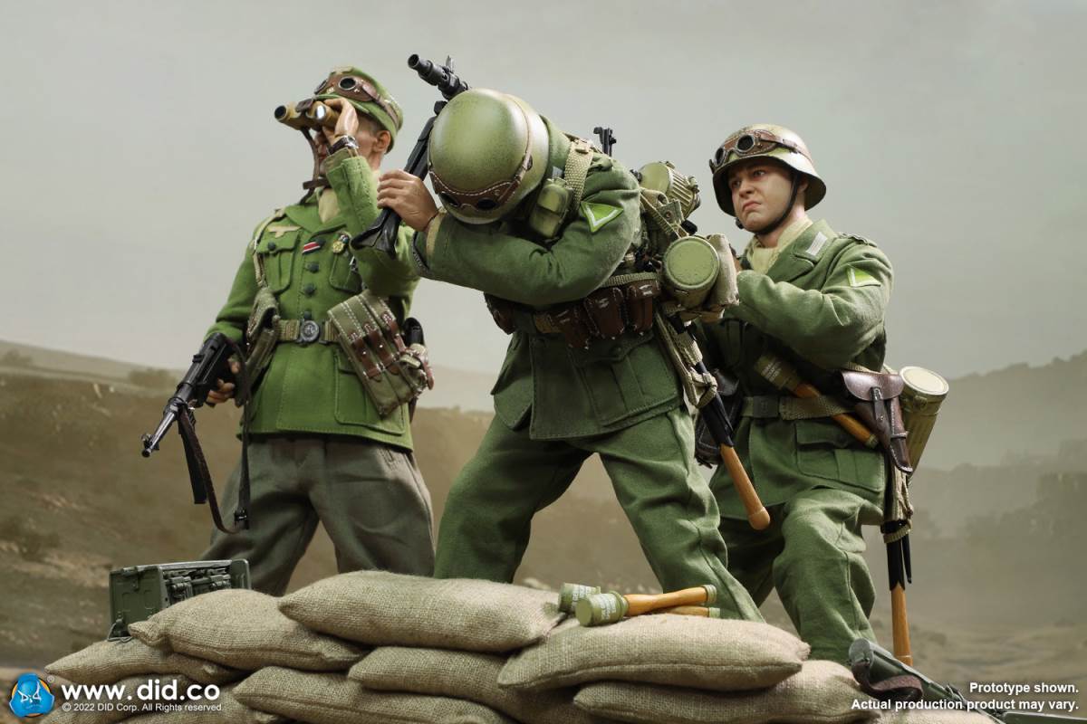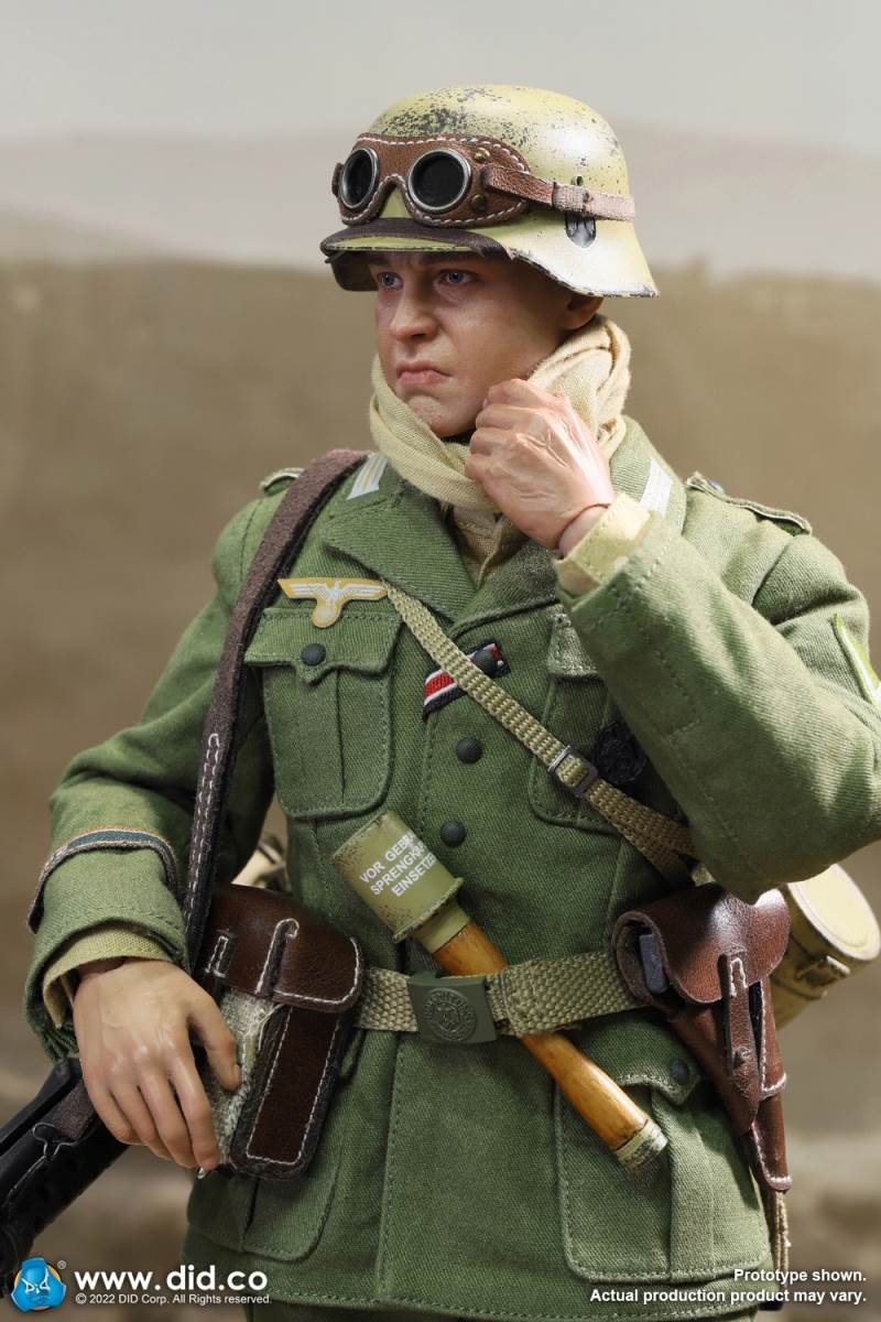 D80158 Accessories List Basic1 Head Carving2 DID 1/6 S Type Body (Standard Version)3 Palm X2 Pair of Clothing4 Helmet + Inner Support5 Combat Cap6 M40 Olive Green Uniform7 Olive Green Pants8 Sand Yellow Pullover Shirt9 Sand Yellow Scarf10 Belt11Canvas Leather Booties Accessories12Engineer Shovel + Shovel Cover13BreadBag14 Spiked Water Bottle (Old)15 Lunch Box (Old)16 Gas Mask Bucket (Old)17 Windproof Goggles18Brown Leather Repair Kit19Cigarettes Weapons20 bayonet + bayonet cover21 grenade X1 (old)22 P38 pistol + brown pistol holster (leather)23 MG34 machine gun + drum + bullet chain + 6 bullet badges24 Eagle mark X125 V letter X126 Black War Wounded Medal X127 CuffNote: The North African members (D80151 and D80152) in the picture are not included in D80158.