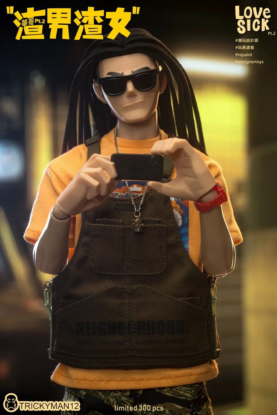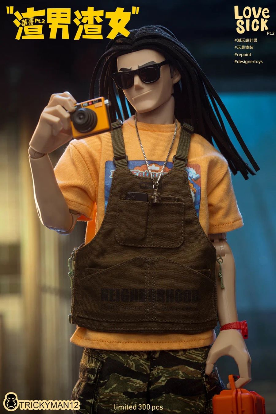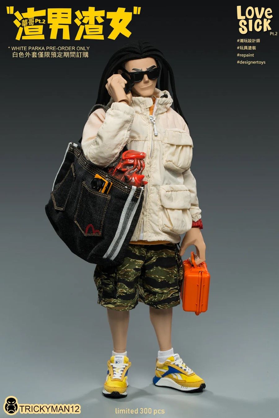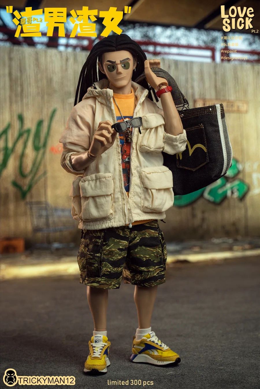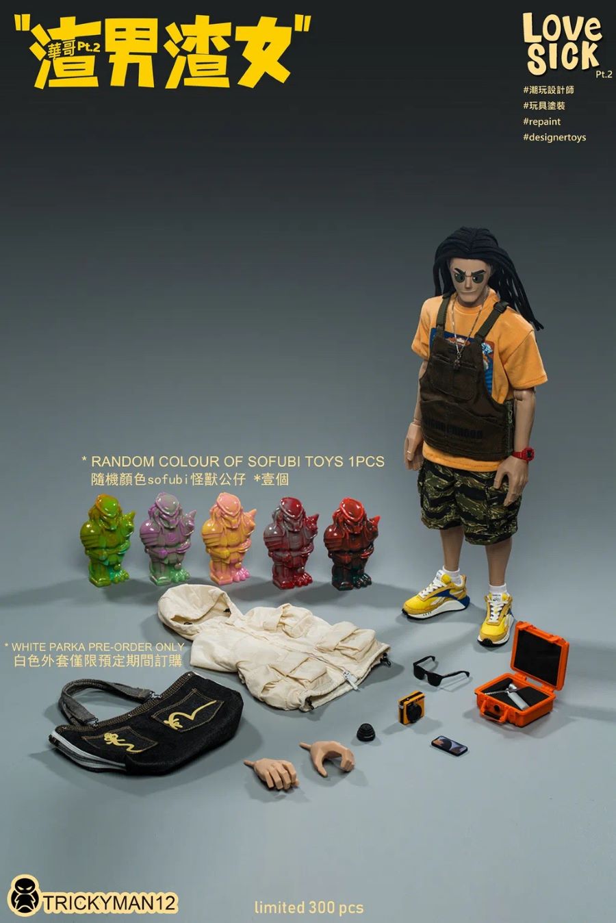 Trickyman12 1/6 Scale Scumbag and Scumbag - Hua Ge (LOVESICK Pt.2)-Parts List-.necklace.G watch.sunglasses.cell phone.Airbrush.toolbox. Instant camera.SOFUBI monster figure*1 (random color).1/6 body.Head carving (hair transplant).Alternative hand (one pair).T-shirt.Tiger print camouflage shorts.Vest apron.Denim satchel.sock.Classic Leather Legacy Yellow Sneakers. Jacket (only available during the pre-order period)