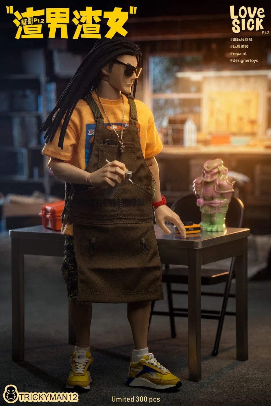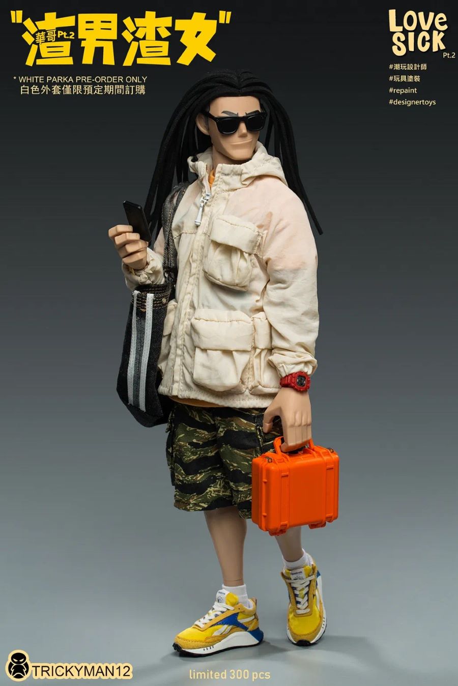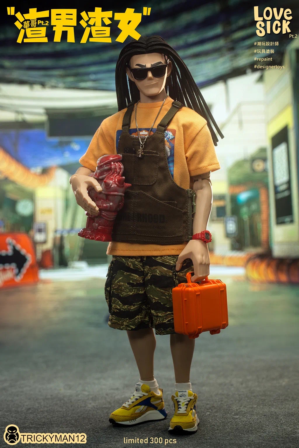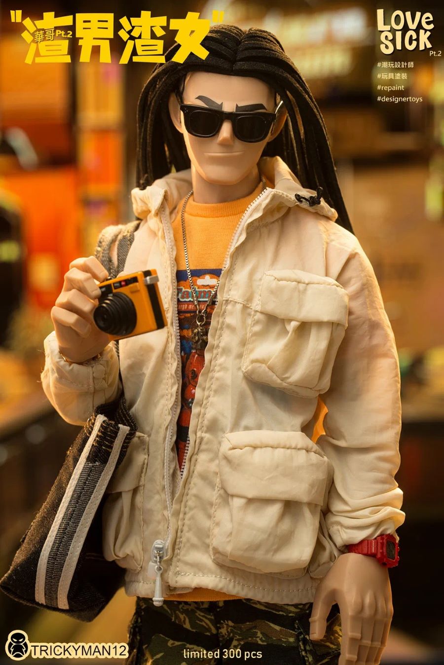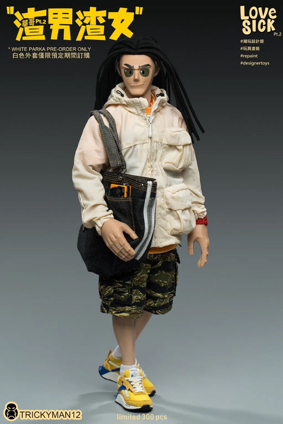 Trickyman12 1/6 Scale Scumbag and Scumbag - Hua Ge (LOVESICK Pt.2)-Parts List-.necklace.G watch.sunglasses.cell phone.Airbrush.toolbox. Instant camera.SOFUBI monster figure*1 (random color).1/6 body.Head carving (hair transplant).Alternative hand (one pair).T-shirt.Tiger print camouflage shorts.Vest apron.Denim satchel.sock.Classic Leather Legacy Yellow Sneakers. Jacket (only available during the pre-order period)