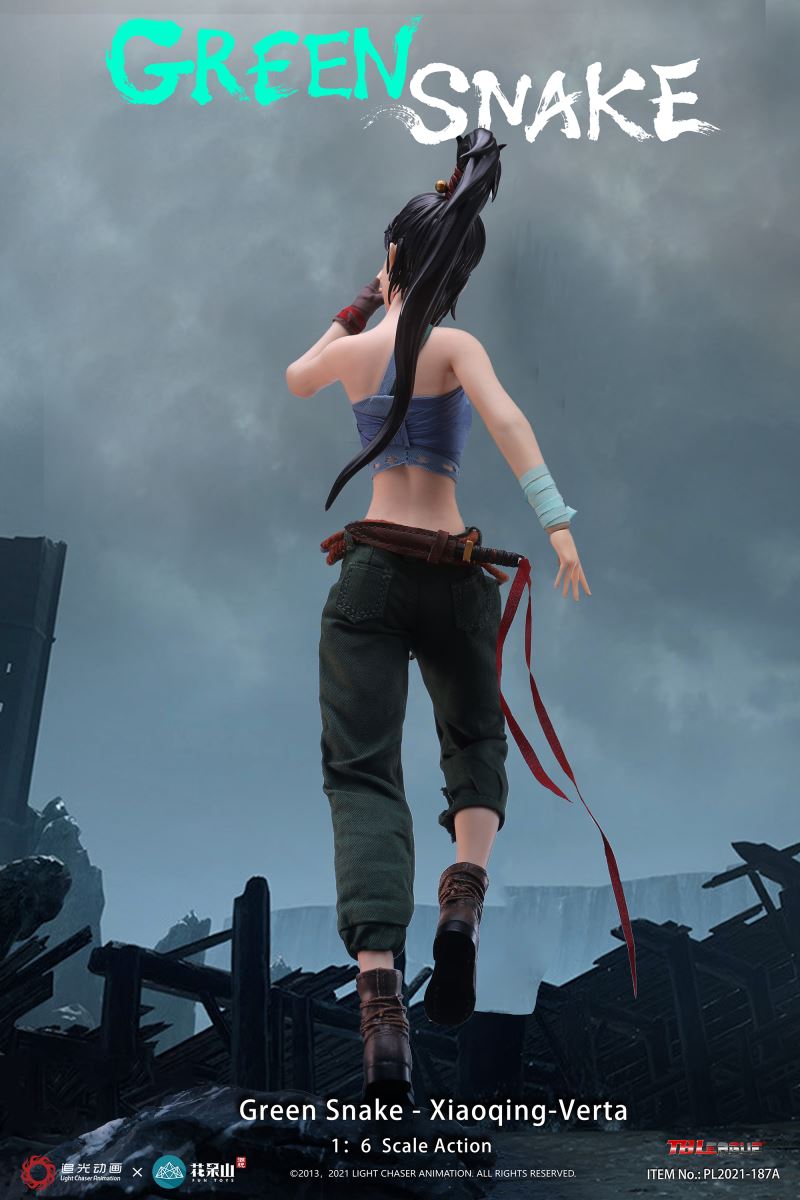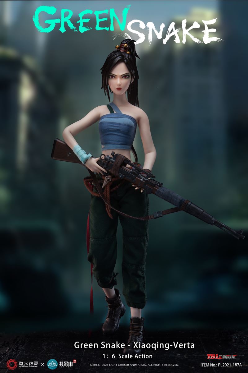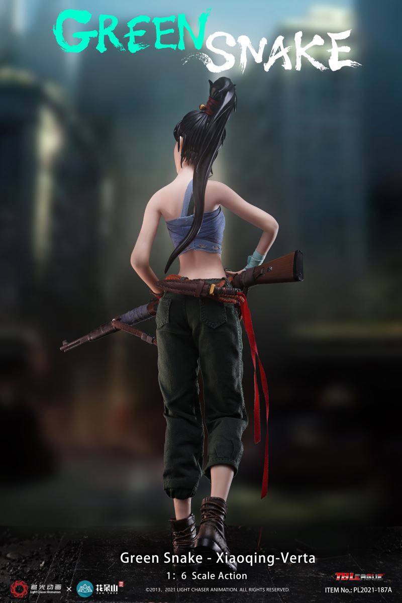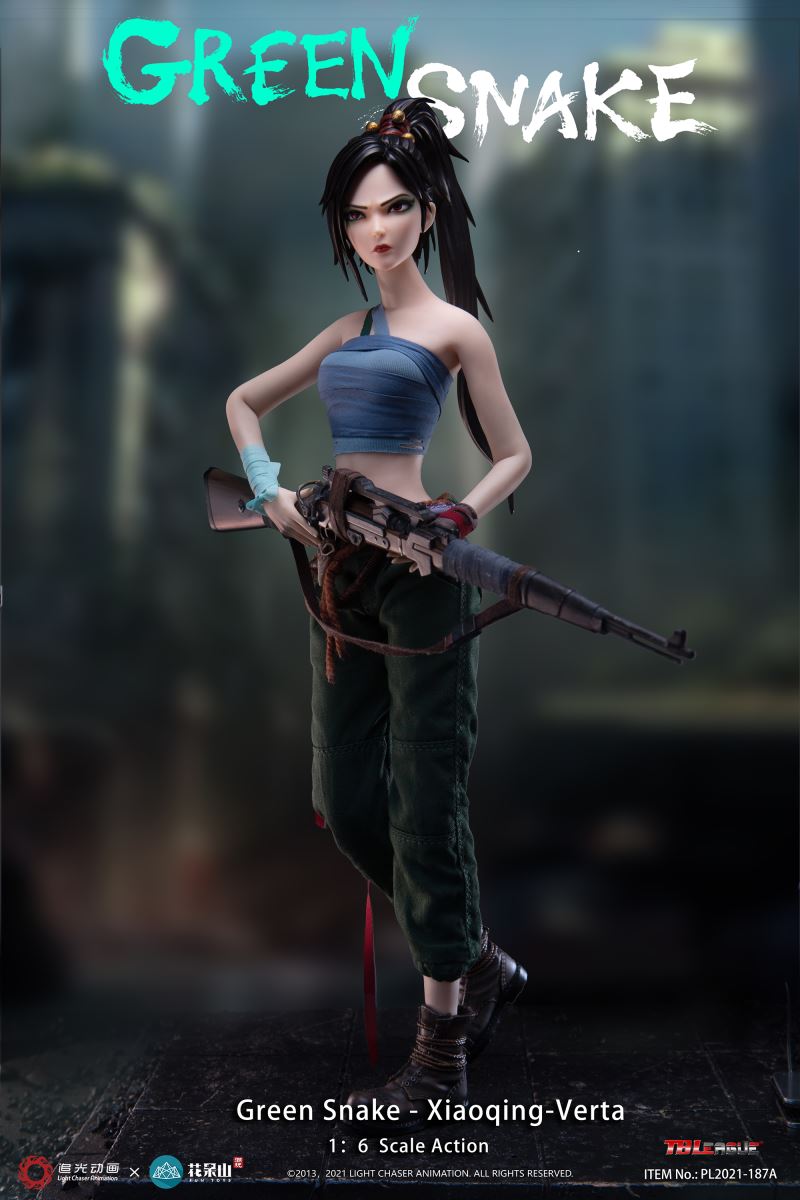 ABOUT THIS SIXTH SCALE FIGURESideshow and TBLeague are proud to present this amazing collectible, the Xiaoqing-Verta Sixth Scale Collectible based on one of the standout characters from the 2019 animated Chinese film White Snake and its sequel Green Snake. This mischievous and mysterious character- even lacking an official name beyond her job title and species!- is nevertheless a fan favorite based on her personality, design, and role within the series of movies.This sixth scale figure stands approximately 11.41 inches tall and comes with a variety of accessories based on her appearance in the movie. Order today to add to your collection!BrandWhite SnakeManufacturerTBLeagueTypeSixth Scale FigureGenreAnime Fantasy Pop CultureWHAT'S IN THE BOX?The Green Snake - Xiaoqing-Verta Sixth Scale Figure features:One (1) head sculptOne (1) TBLeague seamless female figure body (Height,29cm)One (1) breast wrap vestOne (1) pair x green army pantsOne (1) strip of cyan ribbon for wrapping around lower right armOne (1) strip of brown ribbon for wrapping around left palmOne (1) rope beltOne (1) pouch bag (goblin face image and pvc material)Three (3) ivory piecesOne (1) daggerOne (1) sheath for the daggerOne (1) rifleTwo (2) pairs x interchangeable handsOne (1) pair x bootsADDITIONAL DETAILS & DIMENSIONSMaterialsProduct SizeHeight: 11.41 (29 cm) *Box SizeHeight: 2.75 (7 cm)Width: 7.60 (19.3 cm)Depth: 15.00 (38.1 cm) *Shipping Weight1.98 lbs (0.9 kg) ** Size and weight are approximate values.SKU911298Item shown is a prototype. When shipped, the final production piece may differ in appearance.©2013, 2021 LIGHT CHASER ANIMATION. ALL RIGHTS RESERVED