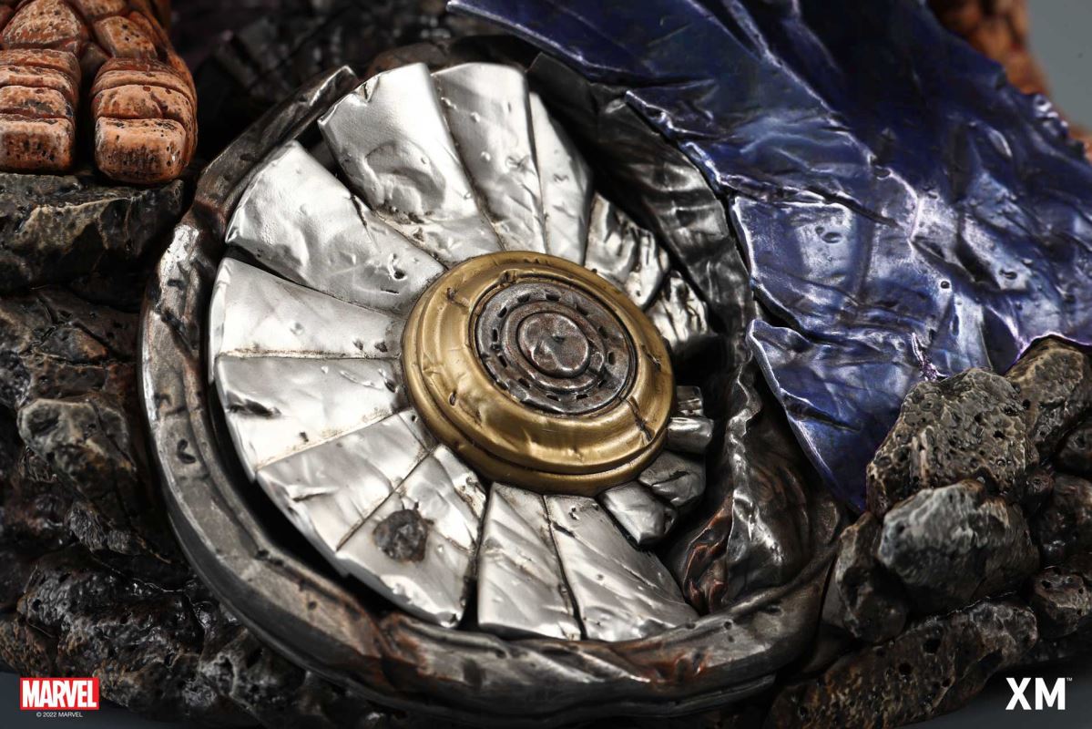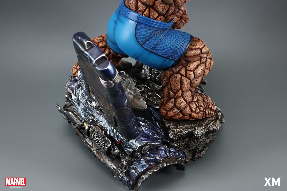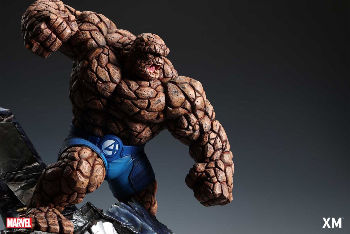 XM Studios is excited to present our next 1:4 scale MARVEL Premium Collectibles series statue, The Thing. Each painstakingly handcrafted statue is individually hand-painted with XM’s famous quality finish, and comes in a bold, dynamic, and story-laden style.The Thing is seen in battle mode, standing on a destroyed Fantastic Four spaceship and ready to throw a punch. His rock appearance is made up of rocks of various sizes with smaller rocks at joints, neck, and face. XM Team used rock formation to create his anatomy, resulting in a realistic and clearly defined musculature. The interplay between shadows and highlights define the crevices, further accentuating the realistic rocky skin texture. Decked in Fantastic Four’s iconic blue uniform design, XM Team modernized the shorts with textured panels and added piping details on the edge and down the side.The Thing comes in 2 head sculpts – one displaying a smirking, confident look, and one displaying a raging battle mode. Collectors can choose to display it either as a standalone piece or with Super Skrull to depict a dynamic mid-battle scene.Character BackgroundReed Richards, Ben Grimm, Susan Storm, and her brother, Johnny Storm, were forever changed during an experimental space flight in a stolen rocket that exposed them to cosmic radiation giving them superhuman powers and abilities. All four of them survived but tragically Ben Grimm’s enhanced strength and durability muted his skin and body into a super-strong rock appearance which robbed him of the ability to pass as a human. He turned into a monster with a ‘’Heart of Gold’’ defending the innocent, fighting evil and joining forces as Fantastic Four saving the world from science-based threats.The Thing Premium Collectibles statue features:Two (2) head sculpts: 1 displaying a smirking look and 1 displaying a raging battle modeHighly detailed sculpt featuring The Thing standing on a destroyed Fantastic Four spaceshipCrafted in PolystoneEach painstakingly handcrafted statue is individually hand-painted with the highest possible quality finishES: MTO 599Artists:Inhyuk Lee (2D)Leo Takeshi Sakamoto (3D)XM Studios Design and Development TeamManufactured by:XM Studios Product and Box DimensionsProduct Size: Est. 54.2CM X 39CM X 36.5CMBox Size: Est. 77CM X 61CM X 30CMProduct Weight: Est. 20kgShipping Weight: 23kgNote: Prototype shown and pending final approval, final product may differ. Batteries will not be included for products with light up features due to customs.