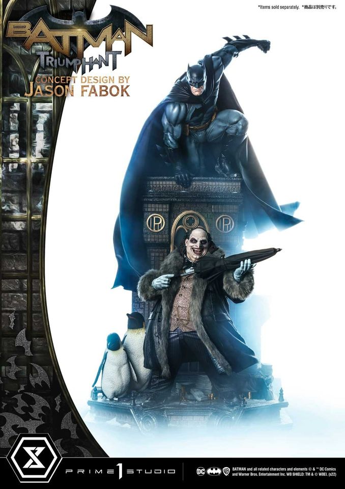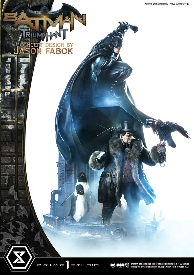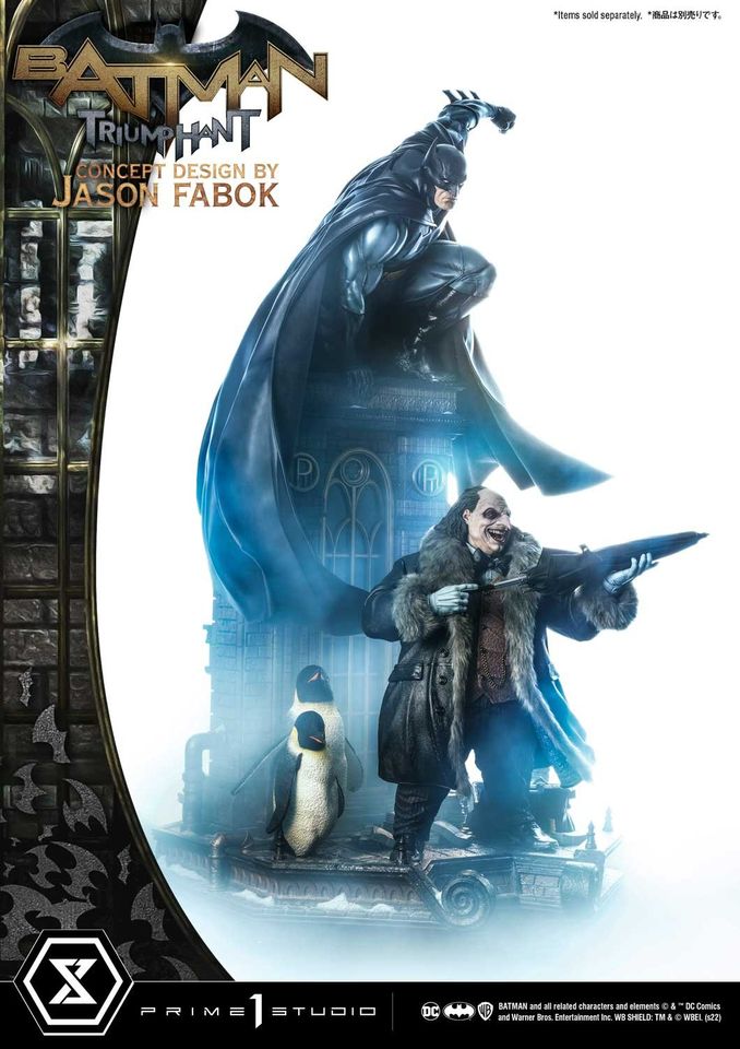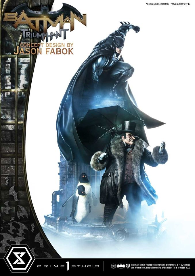 “Ladies. Gentlemen. You have eaten well. You’ve eaten Gotham’s wealth...its Spirit. Your feast is nearly over. From this moment on...None of you are safe.”Prime 1 Studio is proud to present another installment from the mind and talented hands of premiere DC Comics artist, Jason Fabok: the 1:3 Scale MMDC-57S Batman Triumphant Bonus Version Concept Design by Jason Fabok from DC Comics!Our talented sculptors and painters at Prime 1 Studio enjoyed bringing Jason Fabok’s latest Batman statue come to astonishing life. They have imbued it with as many real-world textures and as much realistic detailing as they could. At a showstopping 43.7 inches tall, Batman is atop a gothic edifice, probably overlooking his beloved Gotham City. He’s ready to swoop into action on criminals unaware of the world of hurt that Batman is about to introduce them to.Batman’s pose is taut, and athletic. His muscles are clearly defined, and his intent is clear. Be treated to a multitude of textures, and details that Prime 1 Studio has deemed to pack in into this statue: the leather-like texture of his cowl, the pores on his face amidst his focused scowl. His costume has been appointed with piping, wrinkles, and shading to bring forth the awesome character of Batman’s iconic uniform.And that poseable leather cape! Pose it to your heart’s desire, to bring out the most dramatic, dynamic action pose that you can.Pre-Order this Bonus Version from our official online store or any authorized distributor and will you receive a Bonus Part: an extra, swappable right hand holding a Batarang!Batman’s base is a medley of realistic building materials that are appropriate to this environment...concrete, rebar, metal piping, and snow, all come together to bring you into the world of Gotham. Look even closer for some cool Bat-themed easter eggs.And while this statue may be impressive on its own, this statue is even better when displayed together with MMDC-56DXS The Penguin Deluxe Bonus Version Concept Design by Jason Fabok!Jason Fabok’s Batman Triumphant is sure to be an instant classic, so Pre-Order this today![Product Specifications]-Statue Size approx. 43.7 inches tall [H:111cm W:56cm D:47cm]-Statue Size approx. 46.9 inches tall with Batarang [H:119cm W:56cm D:47cm]-Gotham Rooftop-themed Base-One (1) Swappable Right Hand with Batarang [BONUS PART][Notice]-Prototype samples are shown.-Product details could be subject to change without further notice.