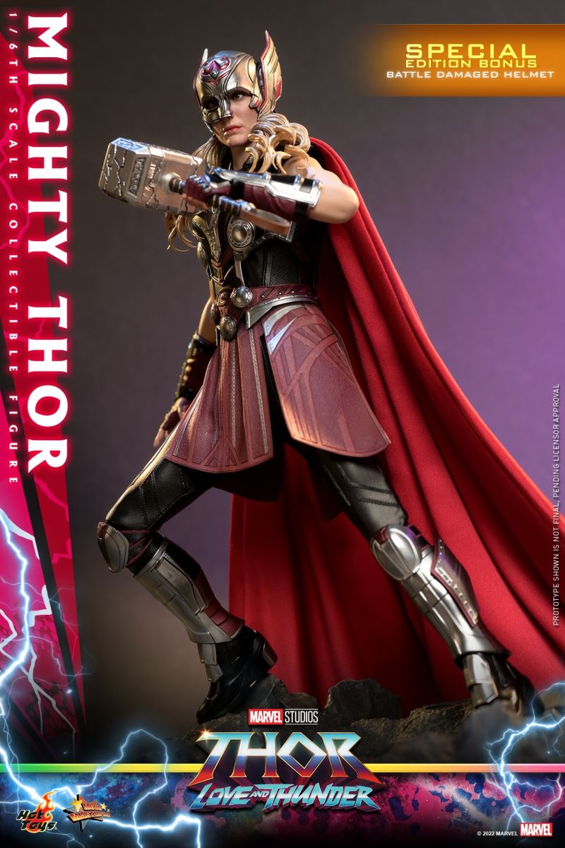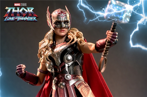 Thor: Love and Thunder Female Thor 1:6 Scale Collectible Figure (Special Edition)After nine years of Thor: The Dark World, Natalie Portman finally reappears in Marvel In the movie universe, she played the domineering new role in Thor 4: Love and Thunder - the goddess of Thor!Hot Toys, with its craftsmanship and quality that strives for perfection in proportions and details, refers to the body proportions of actress Natalie Portman who played the goddess of Thor in Thor 4: Love and Thunder, andspecially created a model with a height of about 29cm and a height of more than 28 cm. There are movable joints, a toned body with strong arms, and an extremely high-precision 1:6 scale doll body. Various poses can be flexibly placed to restore the various combat postures of the characters in the movie.In terms of head sculpting, Hot Toys used exquisite carving and painting techniques to carefully create a high-resolution photo that references actress Natalie Portman's facial contours, skin textures, expressions, and long curly blonde hair. Head carving;at the same time, there is a helmet-shaped head carving for replacement. A whole new set of armor tabards with open arms, combined with delicate tailoring and many details, thevest-shaped armor is equipped with six round shields decorated with imitation metallic silver, imitation leather skirt armor, wrist guards, and The red capes, sewn in fabric, are all made in full reference to the movie.The doll will also be equipped with a cracked Thor's Hammer equipped with an LED light-emitting device, a set of thunder and lightning effects that can be mounted on the Thor's Hammer, a Thor's Hammer rod with thunder and lightning effects, andmultiple pairs of different hand shapes. 's replaceable palms and a characteristic stand from the Thor: Love and Thunder figure series.*Special Edition Accessory: Battle Damaged Helmet~ Movie Masterpiece Series ~Thor 4: Love and Thunder Female Thor 1:6 Scale Collectible Figure Features:- Based on the movie Thor 4: Love and Thunder, it highly restores the shape design of the goddess of Thor, and perfectly presents the facial contours and expressions of actress Natalie Portman in the film- One interchangeable helmet head sculpt - A female Thor is highly sculpted like a real head- Realistic paint technology to highlight its skin texture and makeup- Delicately sculpts the texture of long golden curly hair- about 29cm high- Newly created up to 30 movable special bodies- 6 replaceable palms including:- a pair of fists- A pair of relaxed palms- A pair of arms for holding the weapon- Head carvings are painted by handClothing style :- a red cape- One metallic silver, red and black upper body armor dress accessory- Pair of metallic silver, red and black forearm armor- One metallic silver, red right hip ring- a pair of black trousers- One pair of metallic silver and red knee pads- Pair of metallic silver calf armor- a pair of black bootsWeapons :- A battle-damaged LED lighted Thor's Hammer (battery-operated)- A Thor's Hammer rod with lightning effectsAccessories :- One Mjolnir blue gradient lightning effect accessory- Specially designed movie-themed platform with logo and character nameplatesSpecial Edition Collectible Accessories *- A replaceable battle-damaged helmetMMS663B - Thor 1:6 Scale Collectible Figure (Special Edition)Product barcode: 4895228611970Packing: 6 per cartonMMS663 - Goddess of Thor 1:6 Scale Collectible FigureProduct barcode: 4895228611963Packing: 6 per cartonRelease Date : Around Q1 2024 to Q2 2024*The picture shown is not the final product prototype, waiting for approval**Collection accessory already includes battery***Product details are subject to change without notice(c) 2022 Marvel.(c) 2022 Hot Toys Limited. All Rights Reserved.