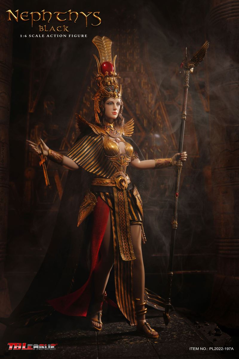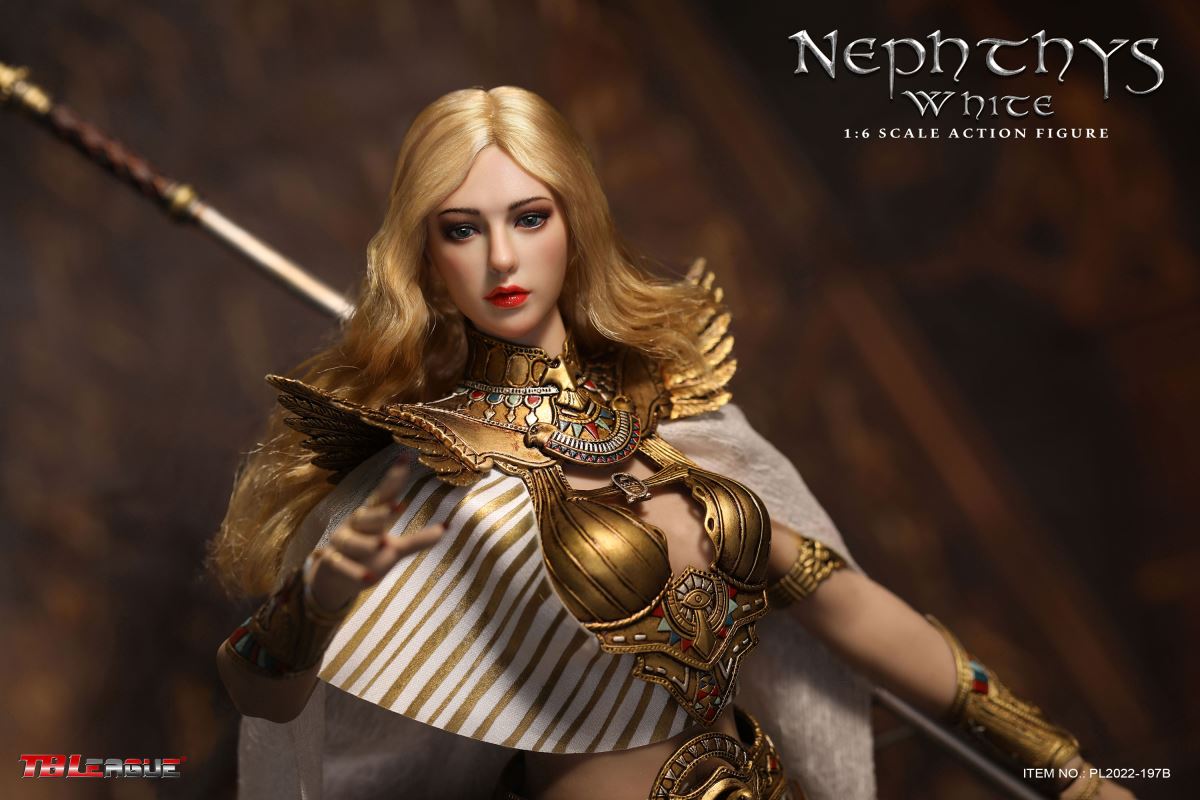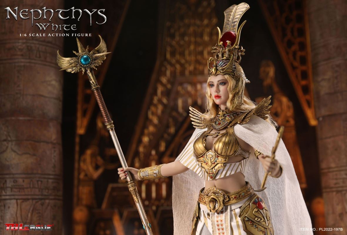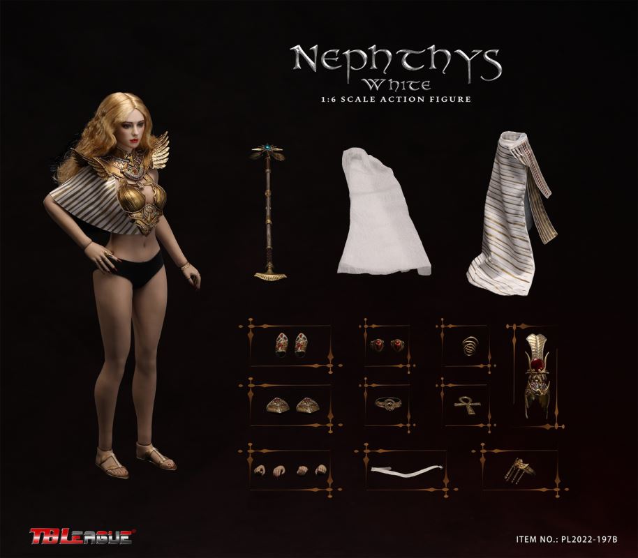 Nephthys - Black 1/6 Scale Action FigureItem Name: Nephthys - Black 1/6 Scale Action FigureItem No: PL2022-197ABar Code: 697 127233 155 7Packing List:1) 1 x crown2) 1 x head sculpt3) 1 x TBLeague 1/6 scale female seamless body with metal skeleton4) 1 x one-piece armor for upper body5) 1 x cloak6) 1 x one shoulder shawl for right arm7) 1 x upper arm bracelet8) 1 pair x armor pieces for lower arms9) 1 x decorative belt for waist (cobra ornament)10) 1 x white waist belt11) 1 pair x armor pieces for thighs12) 1 x long skirt13) 1 pair x underpants14) 1 x fringe belt for left thigh15) 1 x snake design bracelet for lower left leg16) 1 x ankle bracelet17) 1 xa strip of fabric for fastening noto right ankle18) 1 pair x sandals19) 1 x ankh symbol20) 3 pairs x interchangeable hands21) 1 x sceptrePackaging:1 product/individual boxGW: 1.63 kgMeasurements: 23cm*10cm*36cm6 products/master cartonGW: 10.79 kgMeasurements: 50cm*36.7 cm*40.5cm--------------------------Nephthys - White 1/6 Scale Action FigureItem Name: Nephthys - White 1/6 Scale Action FigureItem No: PL2022-197BBar Code: 697 127233 156 4Packing List:1) 1 x crown2) 1 x head sculpt3) 1 x TBLeague 1/6 scale female seamless body with metal skeleton4) 1 x one-piece armor for upper body5) 1 x cloak6) 1 x one shoulder shawl for right arm7) 1 x upper arm bracelet8) 1 pair x armor pieces for lower arms9) 1 x decorative belt for waist (cobra ornament)10) 1 x white waist belt11) 1 pair x armor pieces for thighs12) 1 x long skirt13) 1 pair x underpants14) 1 x fringe belt for left thigh15) 1 x snake design bracelet for lower left leg16) 1 x ankle bracelet17) 1 xa strip of fabric for fastening noto right ankle18) 1 pair x sandals19) 1 x ankh symbol20) 3 pairs x interchangeable hands21) 1 x sceptrePackaging:1 product/individual boxGW: 1.63 kgMeasurements: 23cm*10cm*36cm6 products/master cartonGW: 10.79 kgMeasurements: 50cm*36.7cm*40.5cm