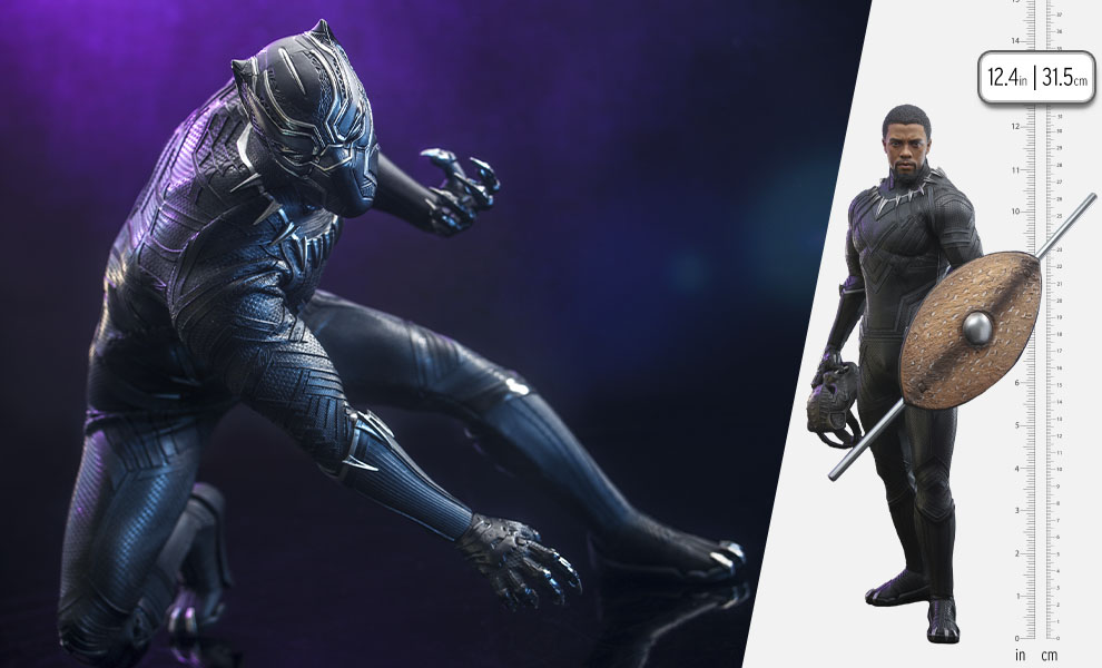 ABOUT THIS SIXTH SCALE FIGURE“We must find a way to look after one another, as if we were one single tribe.” – Black Panther As the new king of Wakanda, T’Challa is struggling to cope with the loss of his father T’Chaka, but is determined to live up to his great legacy. When Wakanda finds herself beset by two enemies intent on the nation’s downfall, Black Panther must do all he can to defend Wakanda and the rest of the world.Celebrating the lasting legacy of the King of Wakanda, Sideshow and Hot Toys are pleased to introduce the Black Panther (Original Suit) Sixth Scale Collectible Figure for Marvel Studios’ Black Panther Legacy collection.Meticulously crafted based on the Black Panther’s original suit in the movie, the collectible figure features a T’Challa head sculpt with remarkable likeness, an interchangeable Black Panther masked head, a highly poseable and specialized body to highlight the king’s muscled physique, a newly refined screen-accurate Black Panther’s vibranium weave suit with silver accents and intricate details, iconic accessories including a shield, a spear, a Wakanda warrior mask, and a figure stand.Pick up the figure of Black Panther in his Original Suit to check out his combat prowess! Wakanda Forever!BrandMarvelManufacturerHot ToysTypeAction Figure Sixth Scale FigureGenreSuperhero Comic Book Pop CultureWHAT'S IN THE BOX?The Black Panther (Original Suit) Sixth Scale Figure features:Authentic and detailed likeness of Chadwick Boseman as T’Challa/Black Panther in Black PantherOne (1) T’Challa head sculpt One (1) interchangeable Black Panther masked headMovie-accurate facial features with detailed skin texture and sculpted beardApproximately 31.5 cm tallNewly developed muscular body with over 30 points of articulationsSeven (7) pieces of interchangeable hands including:One (1) pair of fistsOne (1) pair of clenching handsOne (1) pair of clenching hands with clawsOne (1) right hand for holding spearEach piece of head sculpt is specially hand-printedCostume:One (1) newly tailored Black Panther suit with silver accent and detailed patternsWeapon:One (1) shieldOne (1) spearAccessories:One (1) Wakanda warrior mask (wearable on head sculpt)Specially designed themed figure stand with movie logo and character nameADDITIONAL DETAILS & DIMENSIONSMaterialsProduct SizeHeight: 12.4 (31.5 cm) *Box SizeHeight: 6.00 (15.2 cm)Width: 10.00 (25.4 cm)Depth: 16.00 (40.6 cm) *Shipping Weight5.00 lbs (2.3 kg) ** Size and weight are approximate values.SKU911691UPC4895228612137Item shown is a prototype. When shipped, the final production piece may differ in appearance.© 2022 Marvel. © 2022 Hot Toys Limited. All Rights Reserved.