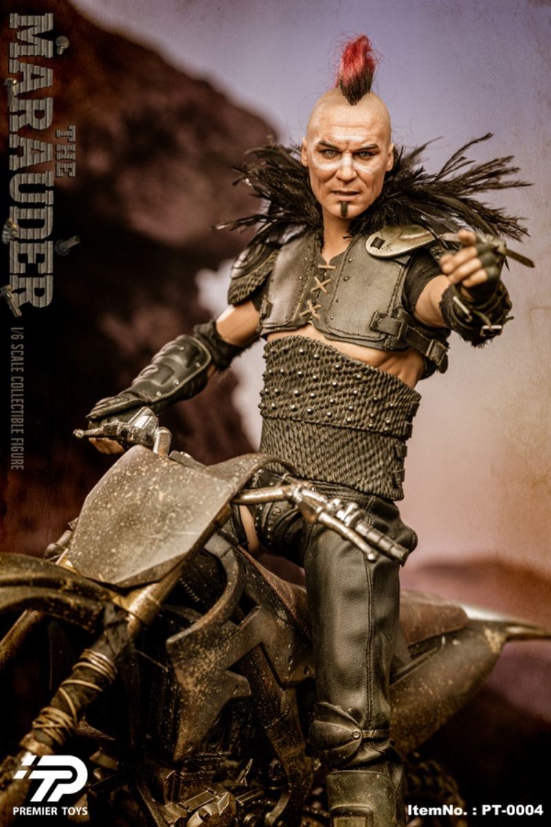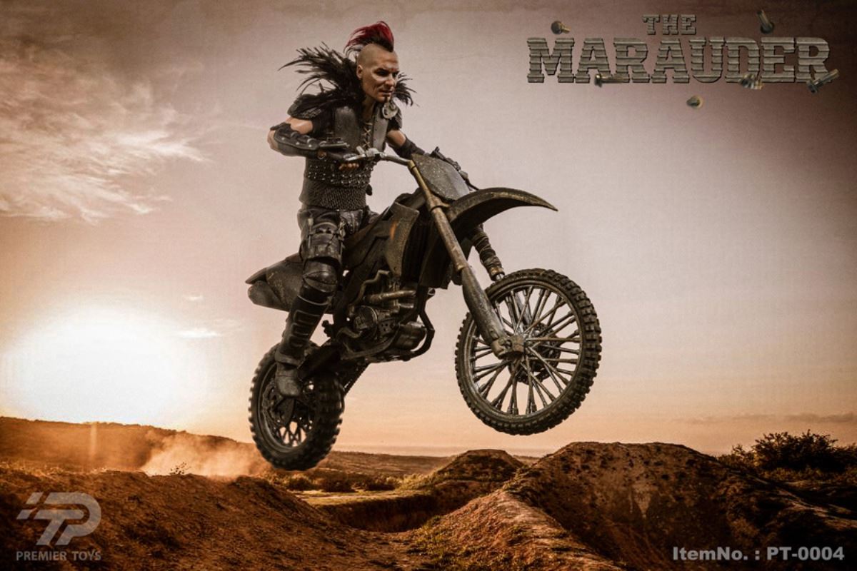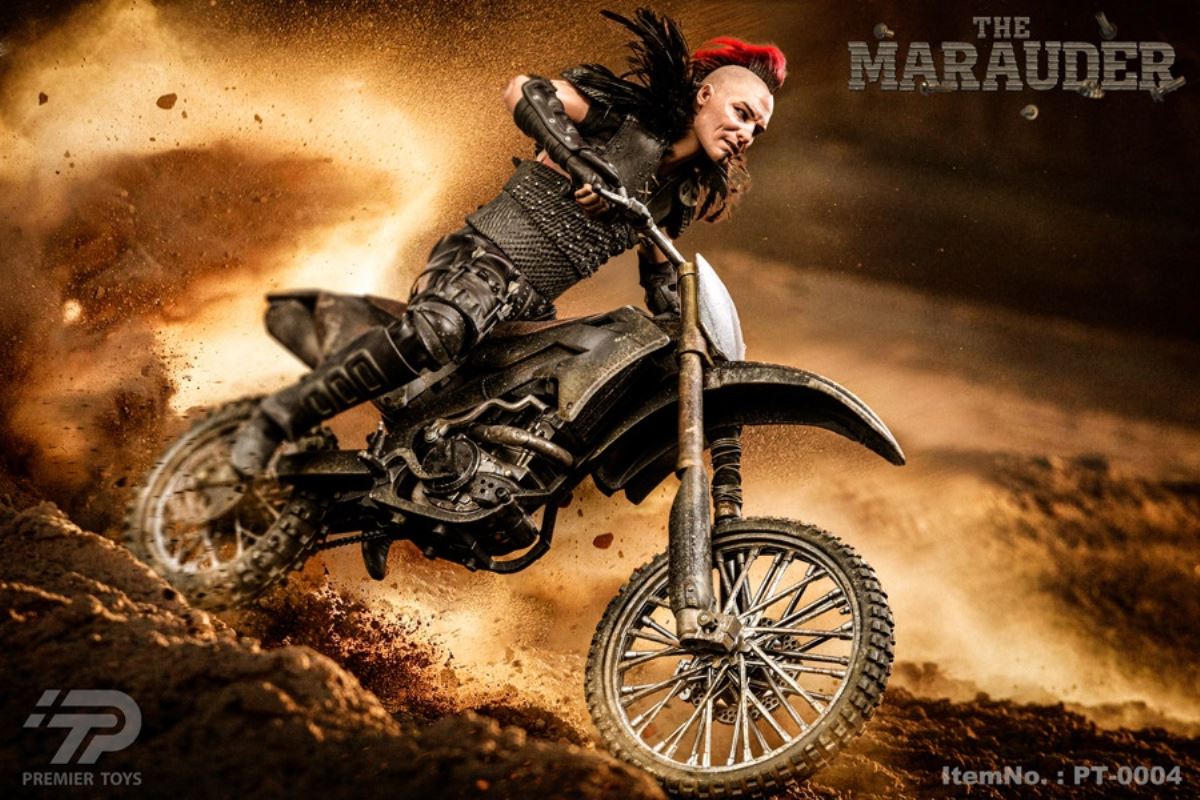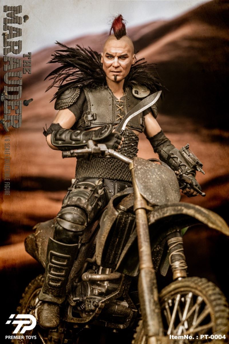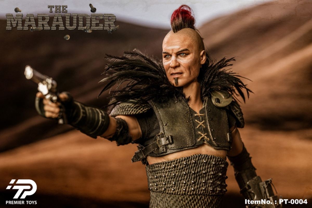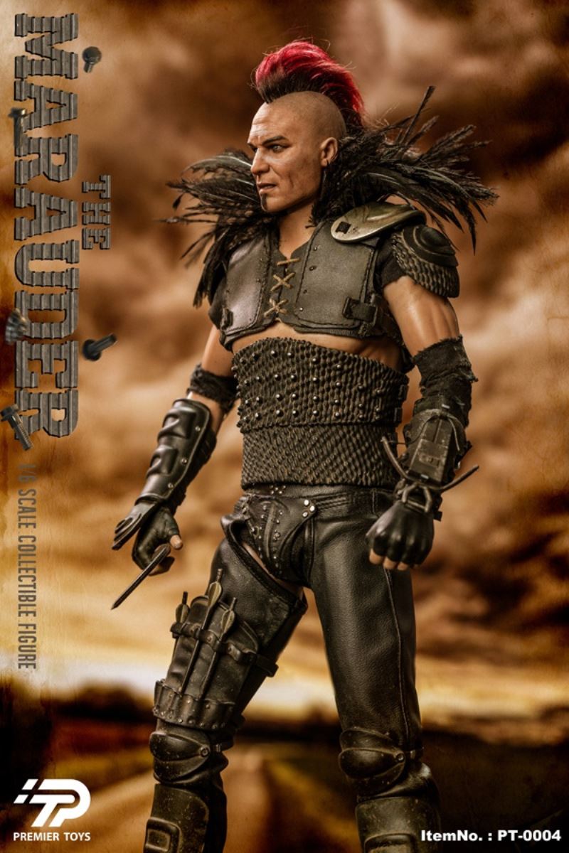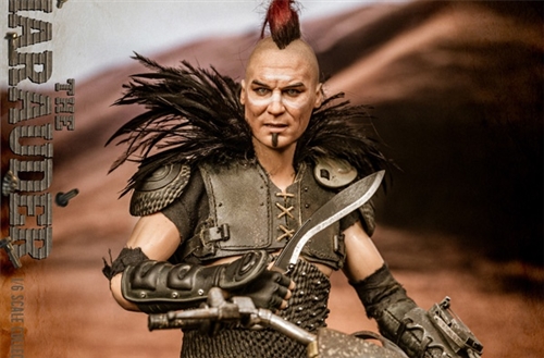 The 1/6th scale The Marauder Collectible Figure features:- Highly realistic detailed soft head sculpt- Long black/red individually hand rooted Mohawk hair- 1/6 scale body with 30 points of articulation- Approximately 30 cm tall- Six (6) pieces of interchangeable hands including:- One (1) pair pointing finger hands- One (1) pair C-grip hands-One (1) pair closed fist handsCostume:- One (1) black-colored cow leather biker armor with boa of feathers- One (1) black undershirt- One (1) pair of black colored pants with knee pad- One (1) cow leatherbelt with shoulder strap- One (1) pair of black colored boots- One (1) PVC of waist armor with cow belt- One (1) pair of shin guardsWeapons:- One (1) .44 Magnum pistol (zinc alloy) -One (1) Forearm/wrist Crossbow- One (1) Kukri Combat Machete (zinc alloy)- One (1) Long chain- Five (5) Crossbow arrowsAccessories:- Figure stand