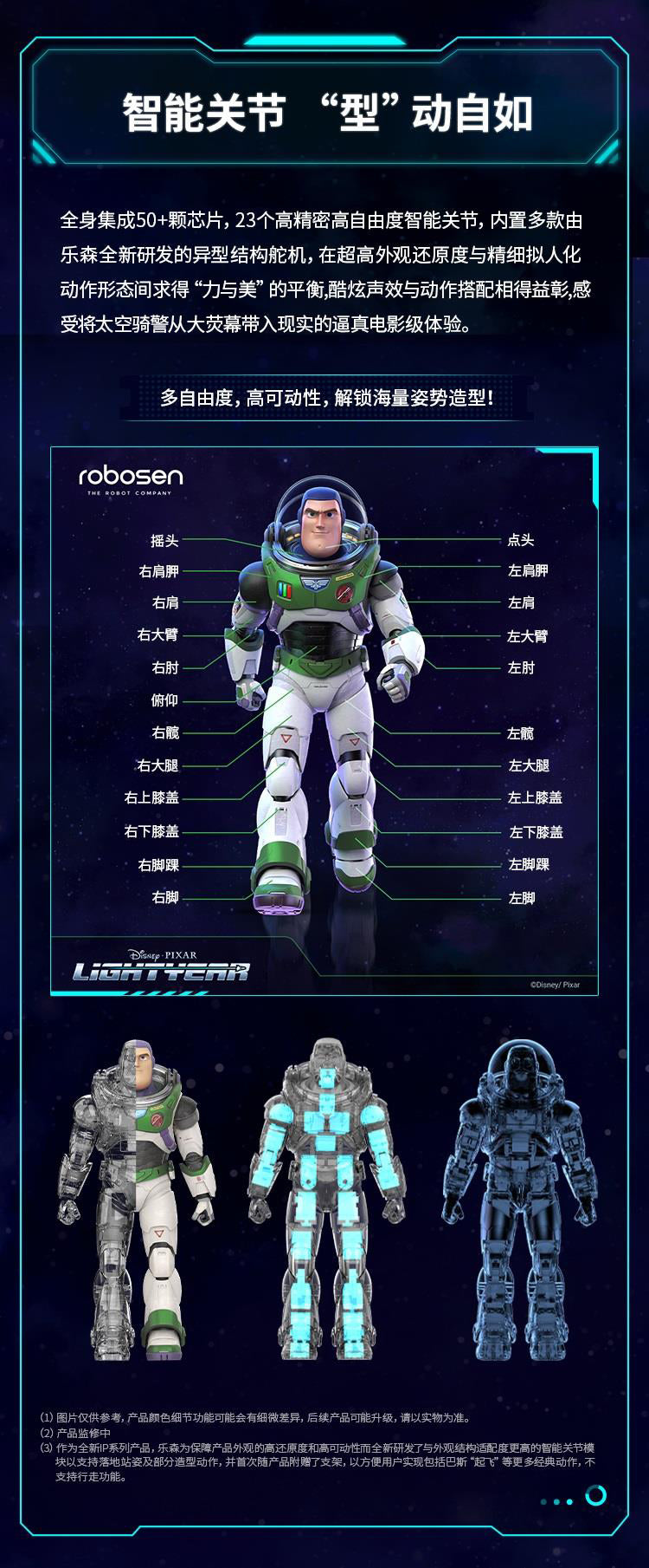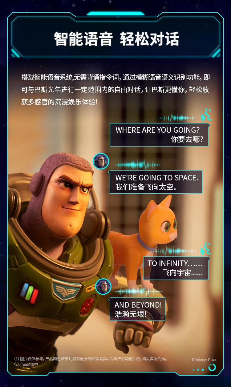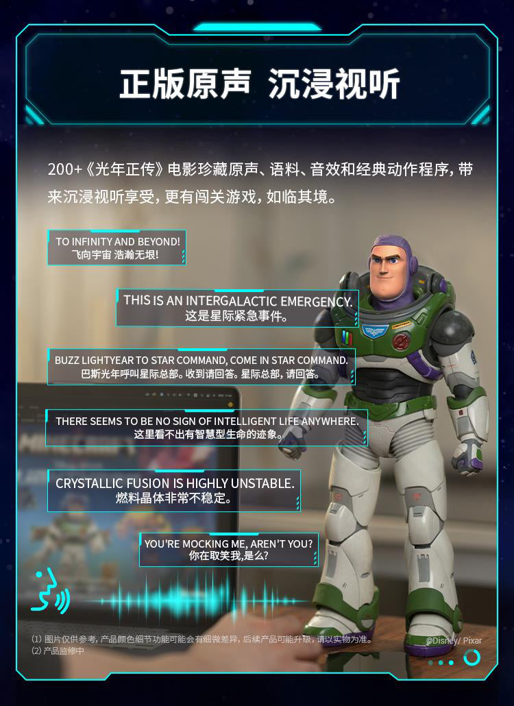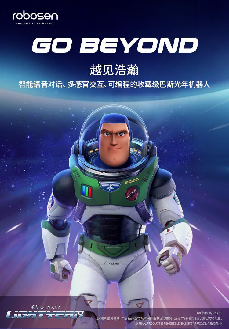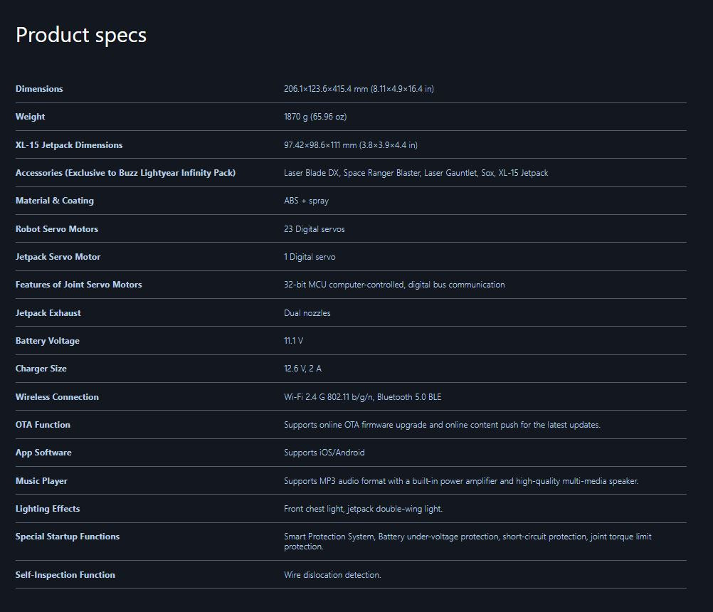 RobosenABS + Magnet + LEDCharacter:H41.54 * W12.36 * L20.61cm EstimatedXL-15 Jetpack:H11.1 * W9.86 * L29.74cm EstimatedWeight 1.87kg EstimatedBattery Voltage:11.1 VCharger Size:12.6 V, 2 AWireless Connection:Wi-Fi 2.4 G 802.11 b/g/n, Bluetooth 5.0 BLEApp Software:Supports iOS/AndroidShipping Date:Q3 (September) 2023 EstimatedUltra-Authentic Lightyear Design + Smart Conversational Voice Interaction + Build-in 23 High-Precision Servo Motors + Programmable with FOUR Operating Modes + Original Sounds and Actions + Premium Quality Full Pack Alpha Suit + OTA Updates with Unlimited Downloads.Standard ver.:Character + Personal Companion Sox comes with non-mechanical joints in head, limbs and tail + A pair of index finger-pointing hands + Space Ranger Stand + Interchangeable Face + Charger + User Manual + Quick Start Guide + Warranty Card.Advanced ver. :Standard ver. + magnetic auto-converting XL-15 Jetpack with Four color options LED which H11.1 * W9.9 * L29.7cm Estimated + FOUR Exchangeable Hand (Blaster Holding Hand, Blade Holding Hand, Salute Hand, Fist Hand) + Laser Gauntlet with LED that can be held in either hand + Space Ranger Blaster with LED that can be stored in either hand + Laser Blade DX with LED that can be controlled in either hand + Dog Tags with limited collector's number + Blade Guard.The transparent space hood can be opened and closed manually and freely removable; The inside of the helmet and the red, green and blue buttons on the breastplate can be illuminated.The Laser Blade DX can be magnetically absorbed on the back, The wrist communicator can be manually opened and closed.Robot Servo Motors:23 Digital servosJetpack Servo Motor:1 Digital servoFeatures of Joint Servo Motors:32-bit MCU computer-controlled, digital bus communicationJetpack Exhaust:Dual nozzlesOTA Function:Supports online OTA firmware upgrade and online content push for the latest updates.Music Player:Supports MP3 audio format with a built-in power amplifier and high-quality multi-media speaker.Lighting Effects:Front chest light, jetpack double-wing light.Special Startup Functions:Smart Protection System, Battery under-voltage protection, short-circuit protection, joint torque limit protection.Self-Inspection Function:Wire dislocation detection.