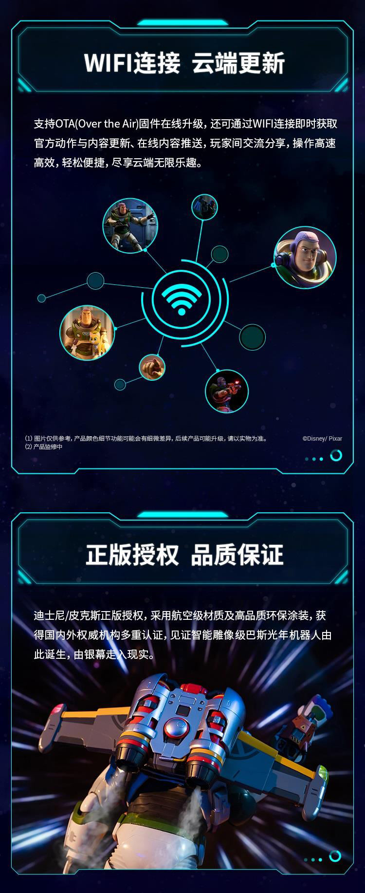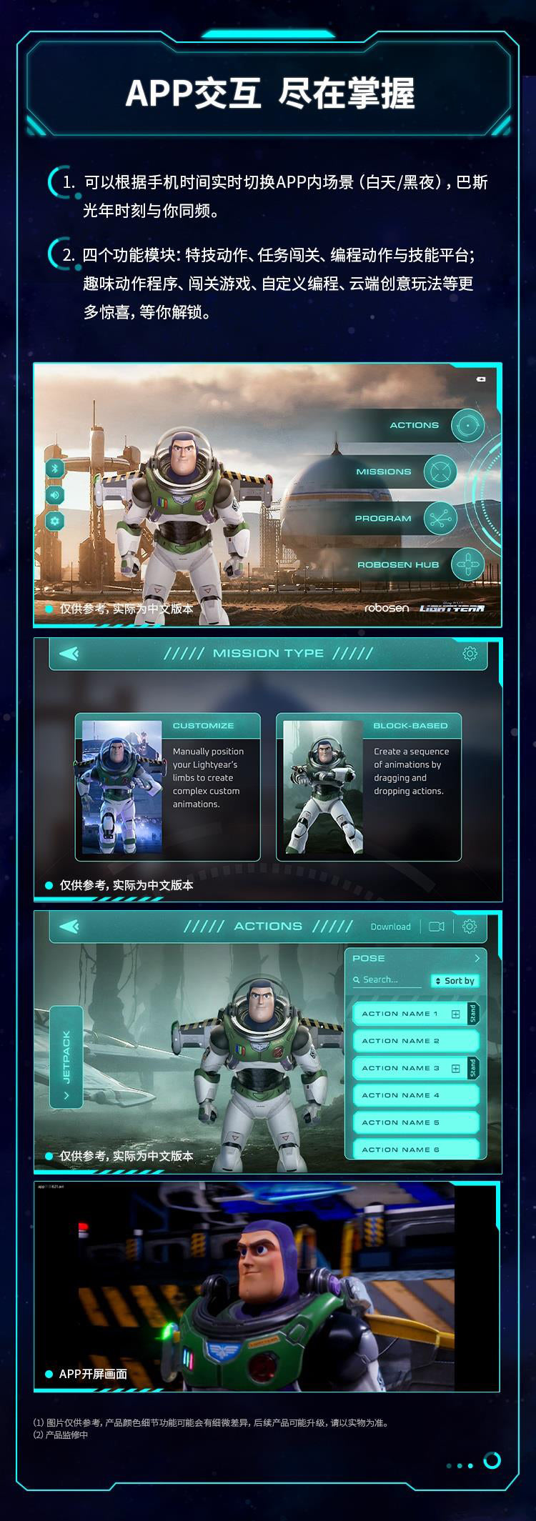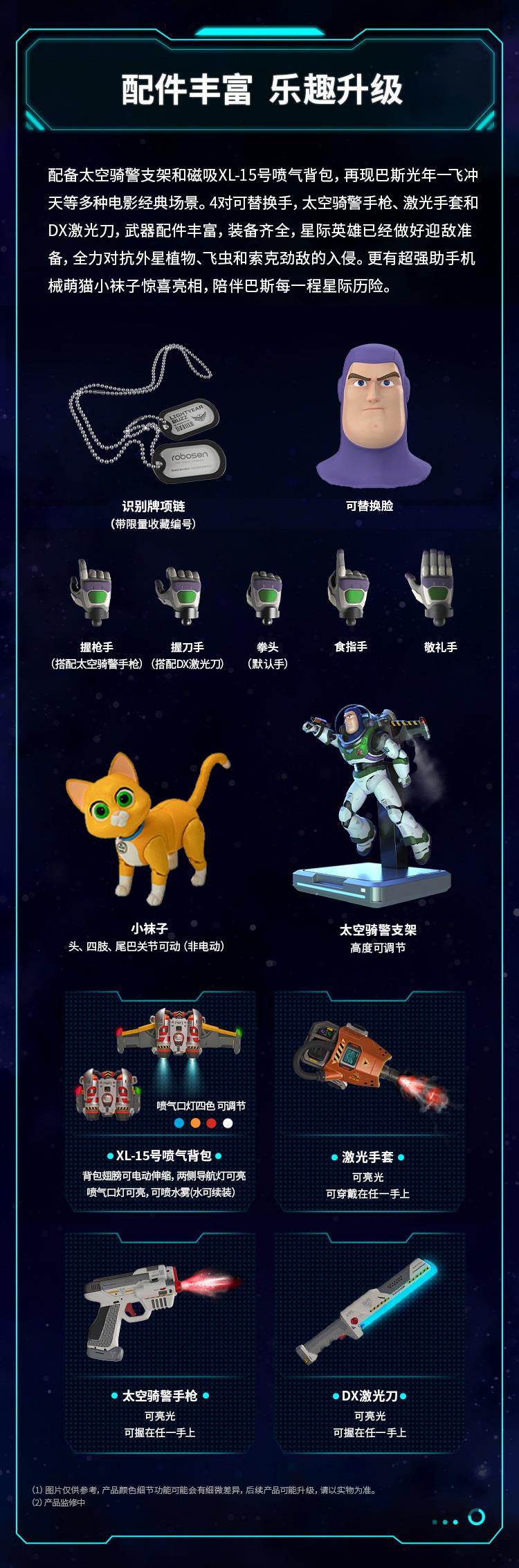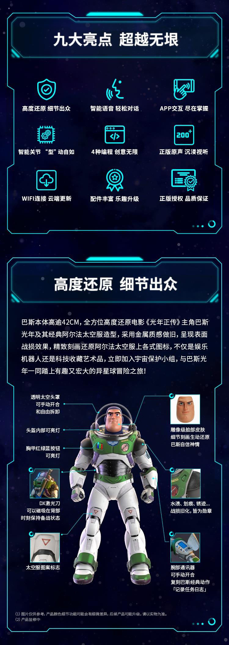 RobosenABS + Magnet + LEDCharacter:H41.54 * W12.36 * L20.61cm EstimatedXL-15 Jetpack:H11.1 * W9.86 * L29.74cm EstimatedWeight 1.87kg EstimatedBattery Voltage:11.1 VCharger Size:12.6 V, 2 AWireless Connection:Wi-Fi 2.4 G 802.11 b/g/n, Bluetooth 5.0 BLEApp Software:Supports iOS/AndroidShipping Date:Q3 (September) 2023 EstimatedUltra-Authentic Lightyear Design + Smart Conversational Voice Interaction + Build-in 23 High-Precision Servo Motors + Programmable with FOUR Operating Modes + Original Sounds and Actions + Premium Quality Full Pack Alpha Suit + OTA Updates with Unlimited Downloads.Standard ver.:Character + Personal Companion Sox comes with non-mechanical joints in head, limbs and tail + A pair of index finger-pointing hands + Space Ranger Stand + Interchangeable Face + Charger + User Manual + Quick Start Guide + Warranty Card.Advanced ver. :Standard ver. + magnetic auto-converting XL-15 Jetpack with Four color options LED which H11.1 * W9.9 * L29.7cm Estimated + FOUR Exchangeable Hand (Blaster Holding Hand, Blade Holding Hand, Salute Hand, Fist Hand) + Laser Gauntlet with LED that can be held in either hand + Space Ranger Blaster with LED that can be stored in either hand + Laser Blade DX with LED that can be controlled in either hand + Dog Tags with limited collector's number + Blade Guard.The transparent space hood can be opened and closed manually and freely removable; The inside of the helmet and the red, green and blue buttons on the breastplate can be illuminated.The Laser Blade DX can be magnetically absorbed on the back, The wrist communicator can be manually opened and closed.Robot Servo Motors:23 Digital servosJetpack Servo Motor:1 Digital servoFeatures of Joint Servo Motors:32-bit MCU computer-controlled, digital bus communicationJetpack Exhaust:Dual nozzlesOTA Function:Supports online OTA firmware upgrade and online content push for the latest updates.Music Player:Supports MP3 audio format with a built-in power amplifier and high-quality multi-media speaker.Lighting Effects:Front chest light, jetpack double-wing light.Special Startup Functions:Smart Protection System, Battery under-voltage protection, short-circuit protection, joint torque limit protection.Self-Inspection Function:Wire dislocation detection.
