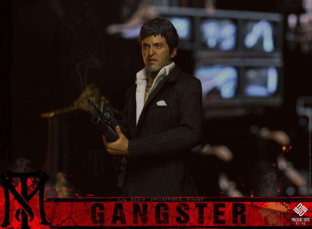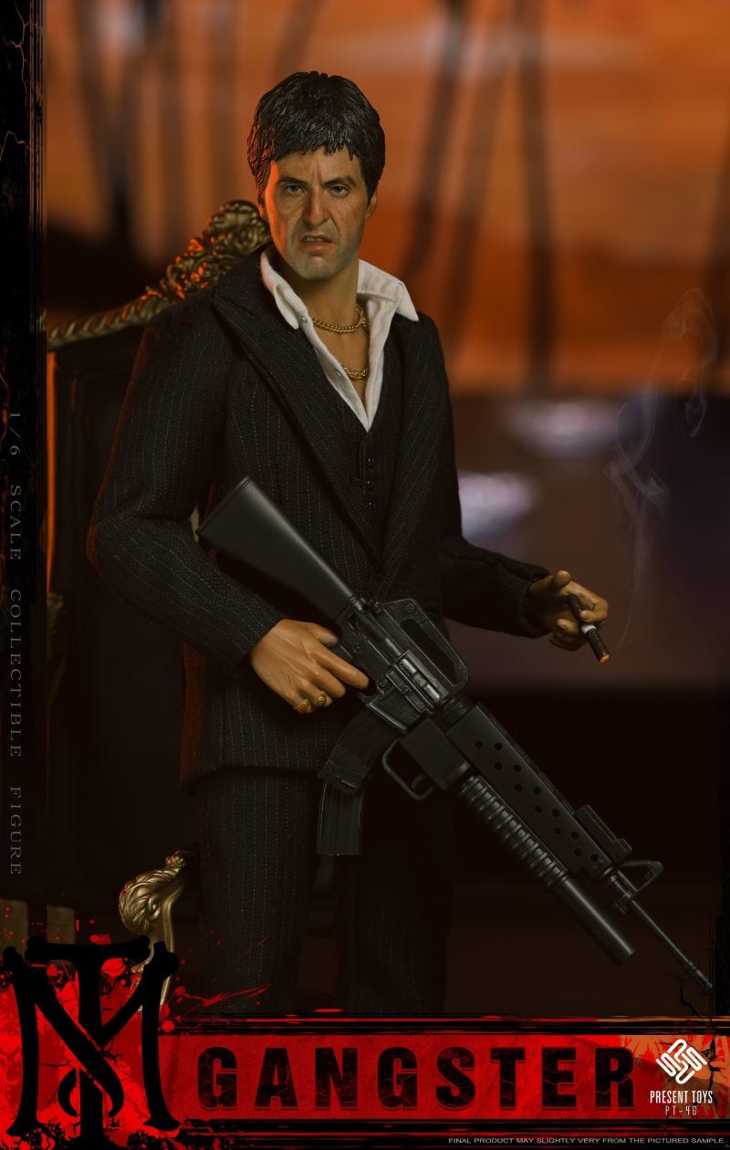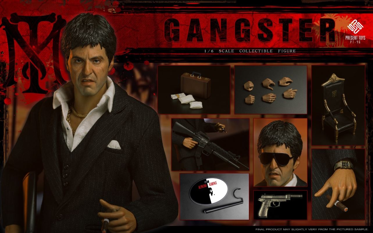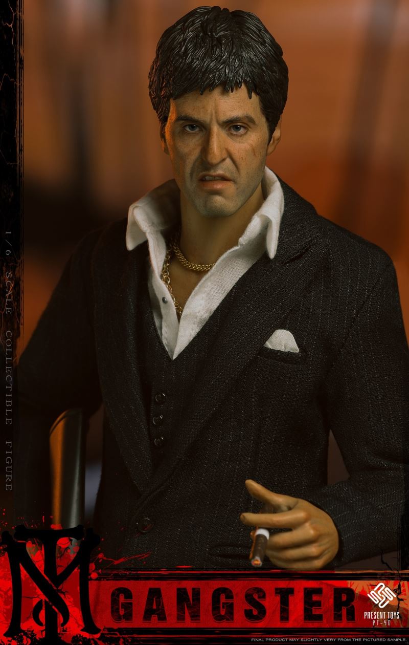 PRESENT TOYS is proud to release new 1:6 collectible figure – GangsterProduct Specs:Product Name: GangsterProduct Number:PT-sp46Scale:1/6List:Authentic Head Sculpture*1Articulated Body*1Interchangeable Hands*6Cigar*1Pistol*1Rifle * 1Sunglasses * 1Chair*1Watch*1Cash*1 0Necklace*2The suitcase * 1White powder bag * 2Figure Stand*1Clothes:Black suit *1Black vest *1White shirt *1Black dress pants *1Shoes * 1Release Date:2nd quarter 2023