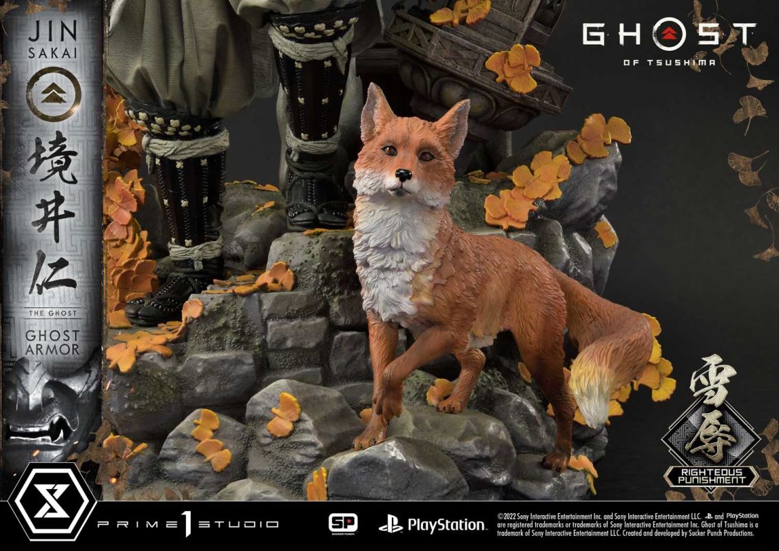 I will make sure you are remembered. As a great warrior, a wise leader, and a father.” Prime 1 Studio is proud to present a follow-up to our hit Jin Sakai Ghost Armor statue: the 1:4 Scale UPMGHOT-03LM: Jin Sakai, The Ghost “Righteous Punishment Ghost Armor” from Ghost of Tsushima! Prime 1 Studio brings back a limited-edition Jin Sakai with a new dye set for a fan-favorite armor. Limited to 150 pieces, this 23-inch-tall stoic statue stands still in a slight breeze, surrounded by golden Gingko leaves and a friendly fox. Enrobed in Rank III Ghost Armor dyed in Righteous Punishment, Jin boasts a ghostly, white silhouette. Jin’s menpo, or facemask, presents a frighteningly demonic visage! All over this detailed statue, you can see each and every part, plate, and cord that keeps this armor together. The high level of precision on this statue is breathtaking! To match the expert sculpting of this beautiful figure, Prime 1 Studio’s painting team has accepted the challenge of an all-white armor set with subtle shading, artistic highlighting, and precise detailing. The result is a piece of art that is every bit as realistic as the fantastic game art. The Ghost stands ready to fight with his katana drawn on his fantastic environmental base. Jin stays still in a subtle whirlwind of golden Gingko leaves, ornate, moss-covered rocks steps, Japanese stone lanterns, and stonework Inari. To his side is a friendly Fox, ready to guide The Ghost to his next goal. Jin will come equipped with two (2) swappable heads (Mask on, Mask off), and two (2) swappable right hands (holding Scabbard, holding Mask). [Product Specifications] ・Statue Size approximately 23 inches tall [H:58.2cm W:56.8m D:43.9cm] ・Two (2) Swappable Heads ・Two (2) Swappable Left Arms ・Ghost of Tsushima-themed Base featuring friendly Fox ・Limited Quantity Available [Notice] -Prototype samples are shown. -Product details could be subject to change without further notice.