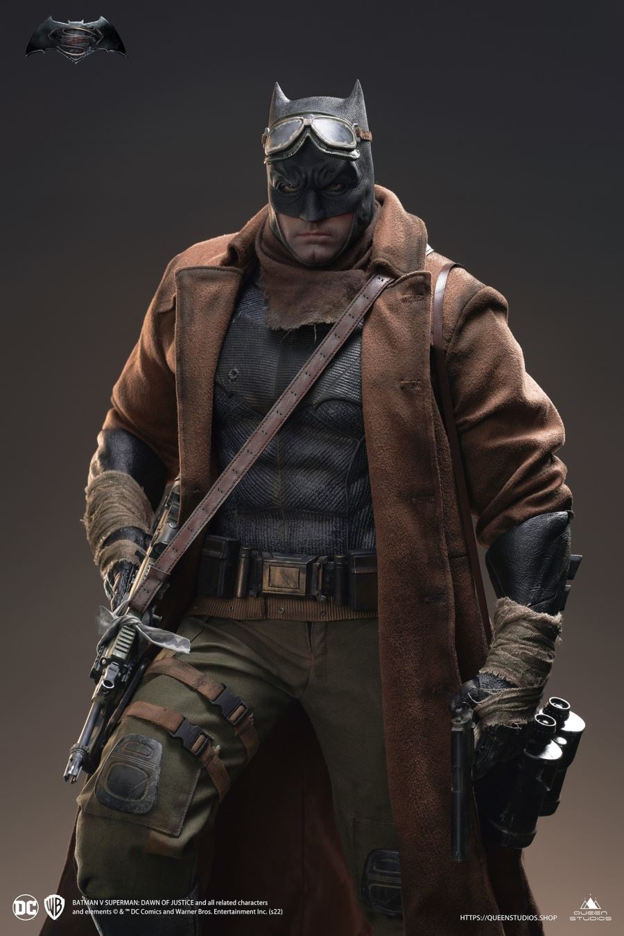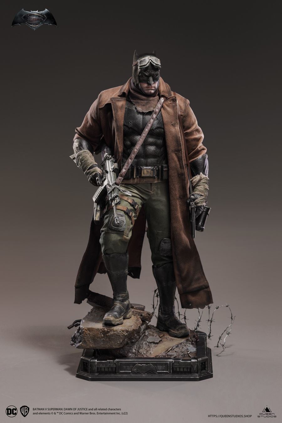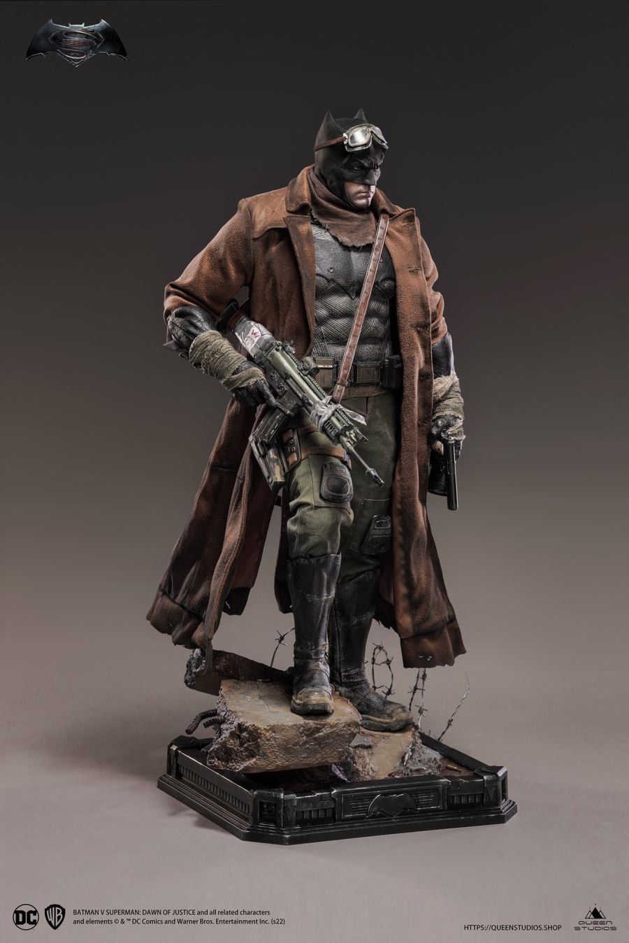 𝗣𝗥𝗢𝗗𝗨𝗖𝗧 𝗜𝗡𝗙𝗢𝗥𝗠𝗔𝗧𝗜𝗢𝗡*Material: Resin, Fabric Clothing, PUProduct Size: 53cm (H) × 27cm (W) × 30cm (D)Estimated Delivery Time: Q4 2023Edition Size: 800*Full list of materials will be listed on the product web page.----------------------------------------------------𝗔𝗯𝗼𝘂𝘁 𝘁𝗵𝗲 𝘀𝘁𝗮𝘁𝘂𝗲The Knightmare Batman is inspired by the “Knightmare Sequence” in Batman v Superman: Dawn of Justice. To capture the character we’ve opted for a powerful standing pose. Batman holds his weapon in his right hand and a pair of binoculars in his left. His left hand can also be switched-out.His coat is made of real fabric, and will include weathering around the edges to make the outfit more movie accurate. Collectors can also chose to display the statue with the goggles on or off.𝗔𝗯𝗼𝘂𝘁 𝘁𝗵𝗲 𝗕𝗮𝘀𝗲The base includes barbedwire surrounding the rocks below tying the whole piece together.