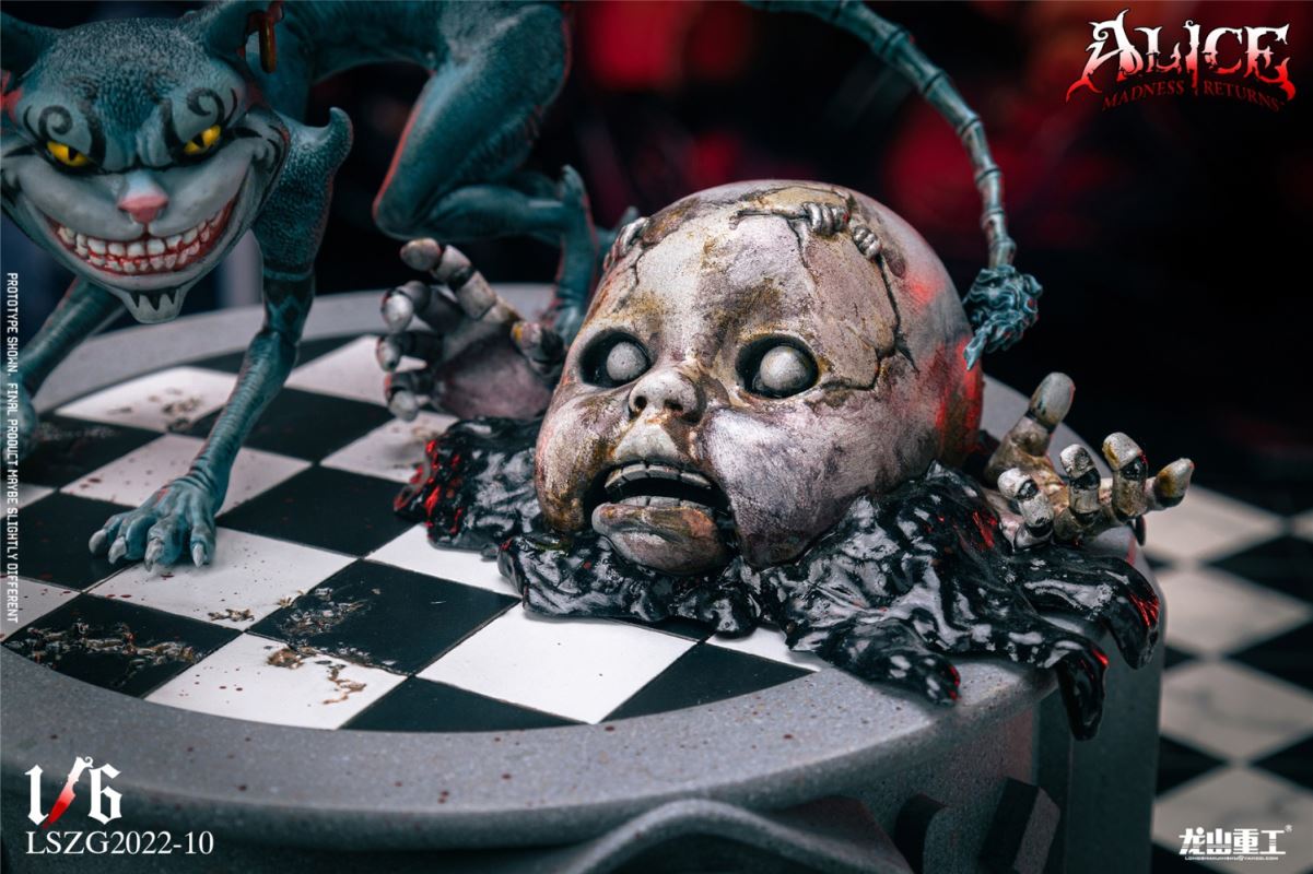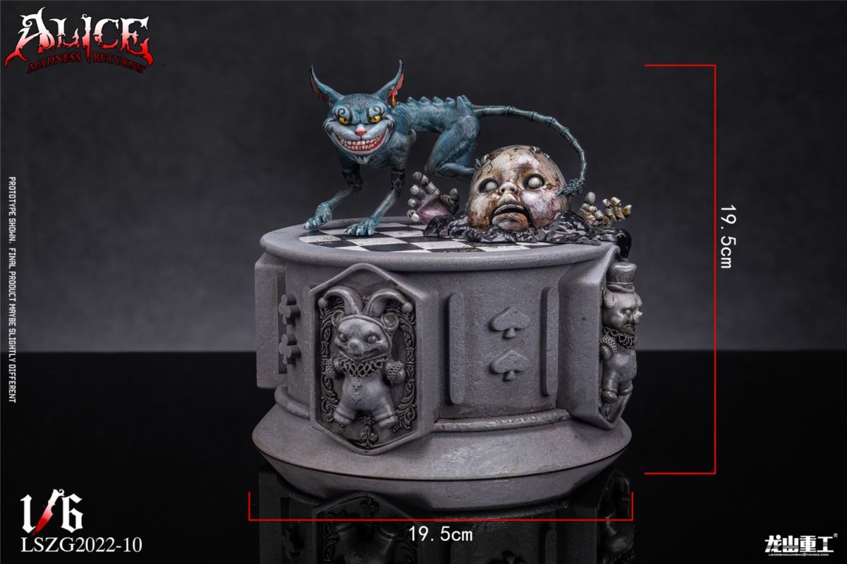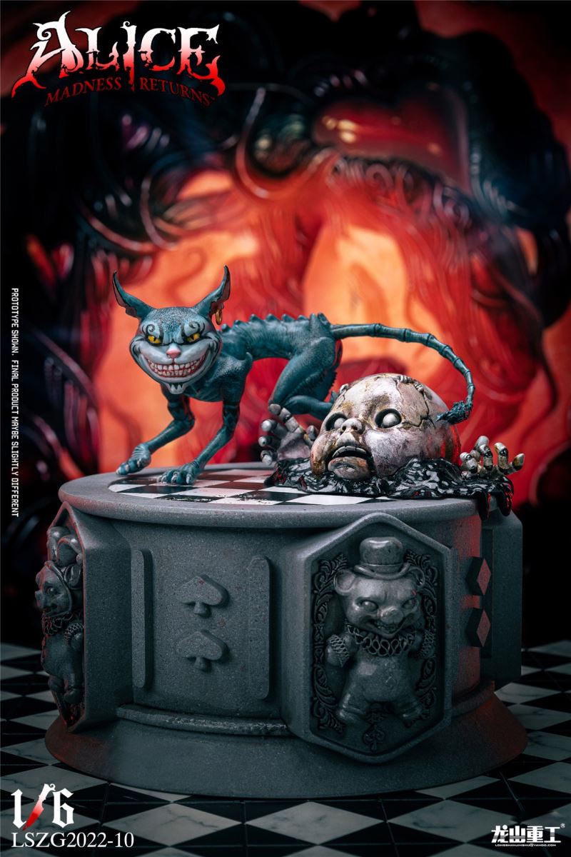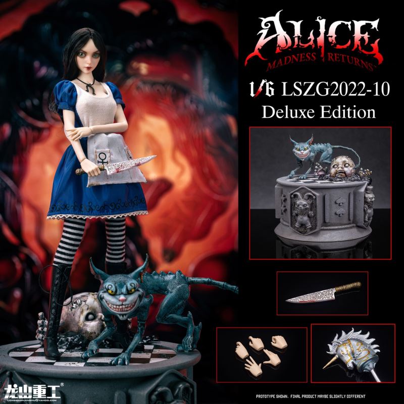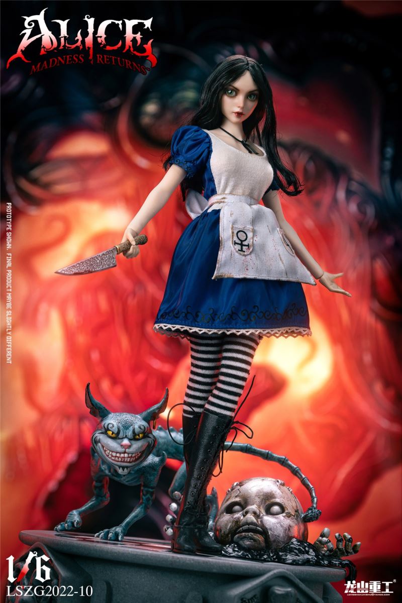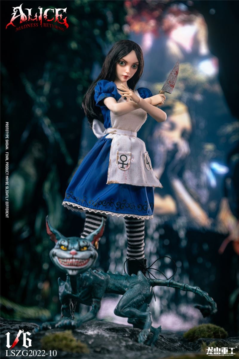 LONGSHANZHONGGONG.TOYS LSZG2022-10 1/6 Alice returns crazilyProduct No: LSZG2022-10Product list:TBL-S36 Gelatinite X1Simulated head carving X1Dress X1Underwear X1Waist X1Long leg socks X2Leather boots X2Hand X5Cutter X1(pure copper)Small single angle smashing X1Cheshire Cat X1Imp X1Platform X1