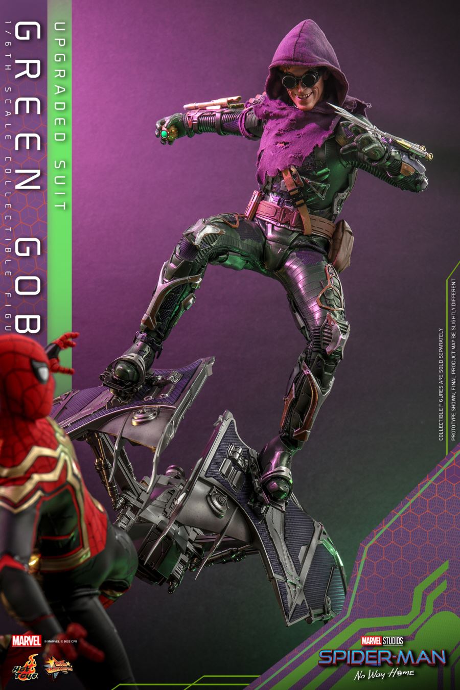 [Hot Toys launched the Spider-Man: No Return Green Goblin (upgraded uniform version) 1:6 scale collectible doll, in-depth restoration of the Green Goblin suit with a strong battle damage effect and equipped with rich equipment]Spider-Man: No Fight There are three generations of Spider-Man in the same house and the collection of classic villains from the past, making fans ecstatic! In the end of the movie, the final battle between the three generations of Spider-Man and the Green Goblin becomes the turning point of the whole movie! Hot Toys has released the Spider-Man: No Return Green Goblin (upgrade uniform version) 1:6 scale collectible doll with reference to the battle damage model of the Green Goblin during the battle!The Hot Toys team relies on the top doll production technology and rich experience, and fully refers to the final battle of Spider-Man: No Fight, No Return, the design blueprint of the Green Goblin and the three generations of Spider-Man's upgraded uniforms, with a high contract The movable body with a height of about 30cm and 30 movable joints is made in the 1:6 scale collectible doll mode of the famous MMS. The focus of this set of Green Goblin (upgraded battle suit version) 1:6 scale collectible figure will be on the super realistic deep battle damage battle suit, the metallic green armored battle suit and boots are equipped with silver armor pieces, and at the same time meticulously engraved The war-damage scratches, cracks and dents are scratched, revealing the details of the inner layer of the combat uniform; at the same time, various details on the combat uniform are restored, such as a belt with a cross-shoulder, missile weapons on the left and right forearms, and can be assembled on the left forearm Upper blade, and comes with a purple ripped hooded top. In addition, the Norman Osborn head sculpture, which is similar in shape and spirit, is made by the Hot Toys head carver team through ingenious carving and painting skills, which vividly shows the charm of actor Willem Dafoe in the film. With Separate Rolling Eyeballs, a black eye patch can be worn. In addition, a 1:6 scale Goblin Glinder (about 33cm long x 21cm wide) is also attached. The glider is decorated with metallic purple and silver paint. The fine structure is divided into every detail, such as movable The details of the pedals, jets, blades and missile weapons, etc., even the details of the exposed wires on the bottom of the aircraft are also restored, and the glider engine and the missile positions on both sides are equipped with LED lighting effect devices to restore the Green Devil holding a pumpkin bomb, The classic shape of a pedal-only glider! The doll is also equipped with two classic Pumpkin Bombs, multiple pairs of shaped palms, and a doll platform.“Poor Peter. Too weak to send me home to die.” – Green GoblinA spell from Doctor Strange goes horribly awry and releases the most powerful villains who’ve ever fought a Spider-Man in any universe. Outside of his Goblin mask, Norman Osborn wears a poncho over the suit in signature green with gears upgraded. This cunning and dangerous villain who poses significant threats to the world is attempting to push Peter Parker to his moral limits.Spider-Man: No Way Home collectible series continues to amaze fans around the world! Joining Hot Toys’ Movie Masterpiece Series is the Green Goblin (Upgraded Suit) as 1/6th scale collectible figure with fabric poncho and enhanced armor outfit translated every detail.Expertly crafted based on Norman Osborn/ Green Goblin’s maniacal portrait in Spider-Man: No Way Home, the movie-accurate figure features a newly developed head sculpt of Willem Dafoe as Norman Osborn with separate rolling eyeballs, realistic wrinkles and hair sculpture. His upgraded costume painted in metallic green color with battle damaged effects, a distressed poncho, highly-detailed accessories including goggles, pumpkin bombs, attachable blades, his trademark Goblin Glider in one-sixth scale with LED light up design and articulated function.This Green Goblin figure is a must-have for infamous villains and Spider-Man collectors!The 1/6th scale Green Goblin (Upgraded Suit) Collectible Figure’s special features:- Authentic and detailed likeness of Willem Dafoe as Norman Osborn/ Green Goblin wears final suit in Spider-Man: No Way Home- One (1) newly developed head sculpt with separate rolling eyeballs features- Movie-accurate facial features with detailed wrinkles and skin texture- Body with over 30 points of articulation- Approximately 30cm tall- Six (6) pieces of interchangeable gloved hands including:- One (1) pair of fists- One (1) pair of open hands- One (1) pair of hands for holding pumpkin bomb- Each piece of head sculpt is specially hand-paintedCostume:- One (1) newly crafted metallic green colored armored suit with battle damage effects- One (1) pair of metallic green colored armored boots- One (1) purple poncho with distress effects- One (1) brown colored crossbody utility belt with pouchesWeapons:- Two (2) pumpkin bombs- One (1) blade (interchangeable onto left forearm)Accessories:- One (1) pair of goggle- One (1) 1/6th scaled Goblin Glider features articulated function and LED light up function (battery operated; approximately 33cm L x 21cm W)- Specially designed dynamic figure stand with movie logo and character nameplateRelease date: Approximately Q4, 2023 – Q1, 2024*Prototype shown, final product may be slightly different**Battery included for accessory, button cells are required***Product details are subject to change without further noticeMARVEL 2022 CPII. All Rights Reserved.2022 Hot Toys Limited. All Rights Reserved.