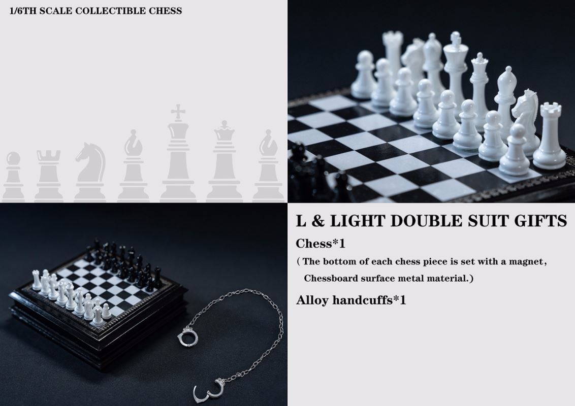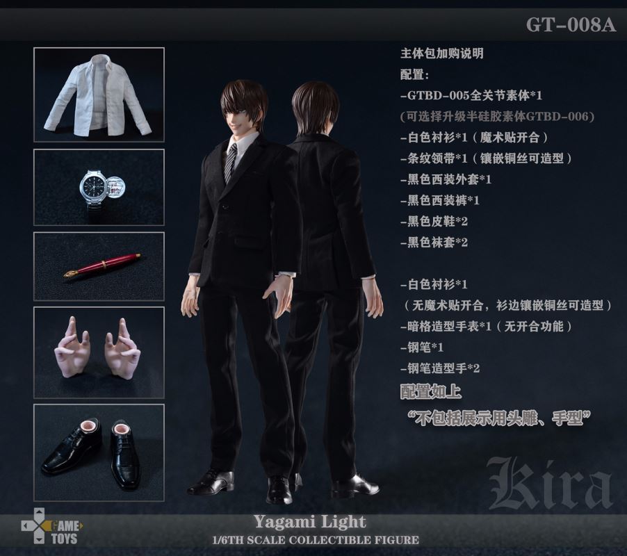 GAMETOYS DN Note L·Lawliet/L 1/6 Action Figure Product Number: GT-007Product configuration sheet:The overall height of the character is about 32CM- Two-dimensional proportion male body*1 GTBD-005 (full joint body)(optional upgrade to half-body silicone body GTBD-006)-Doll display stand*1-Head carving*1 (normal expression can be adjusted by moving eyes)-Replacement hand type*8-Replacement soles*4 (2 pairs)-Laptop*1-Folding phone*1-Coffee table*1-Sofa*1-cake, cake saucer*1-tea cup, teacup saucer*1-spoon, fork*1apparel:-White top*1-Loose jeans*1【Order cut-off time is December 12th】[Shipment time is expected to be in the third quarter of 2023]Subject to the actual delivery time----------------------GAMETOYS DN Notes Yagami Light/Night God Moon/KIRA 1/6 Action Figure Product Number: GT-00 8Product configuration sheet:The overall height of the character is about 32CM- Two-dimensional ratio male body*1 GTD-005 (full joint body)(optional upgrade to half-length silicone body GTD-006) -Dolldisplay stand*1-Head carving*1 (normal expression can be adjusted by moving eyes)-Replacement hands*10-Uniform shoes*2 (1 pair)-Apple*1-Black Notebook*1-Mechanical pencil*1-Headphone*1-Watch*1-Death Sickle*1-Bandage*1apparel:-White shirt*1-Red tie*1 (inlaid with copper wire for styling)-Yellow uniform jacket*1 (inlaid with copper wire for styling)-Gray uniform pants*1-Black belt*1Book gift-Head carving*1 (evil smile expression , movable eye adjustment)【Order cut-off time is December 12th】[Shipment time is expected to be in the third quarter of 2023]Subject to the actual delivery time