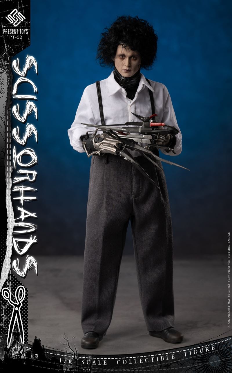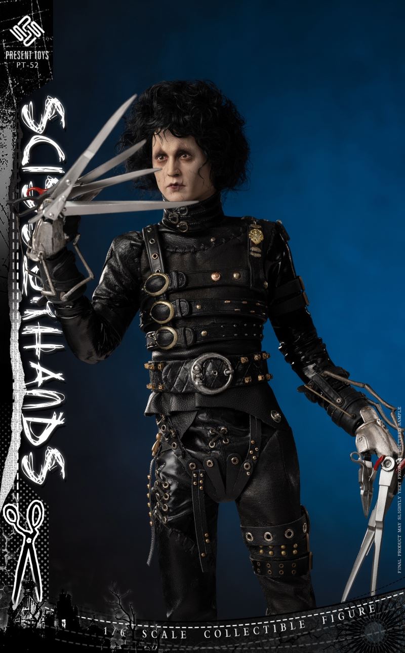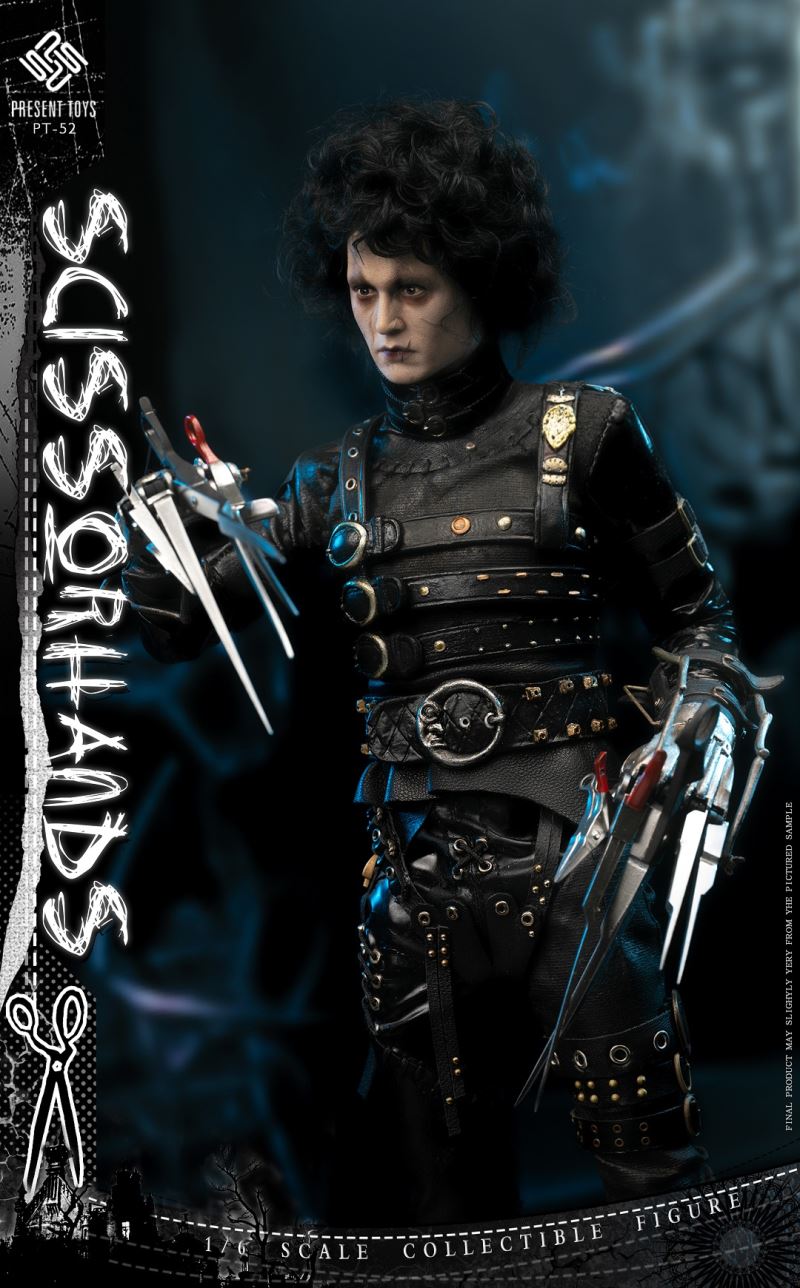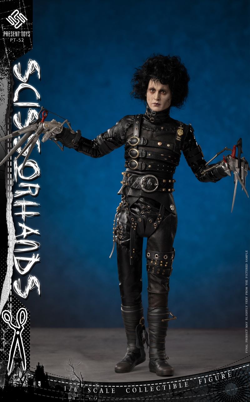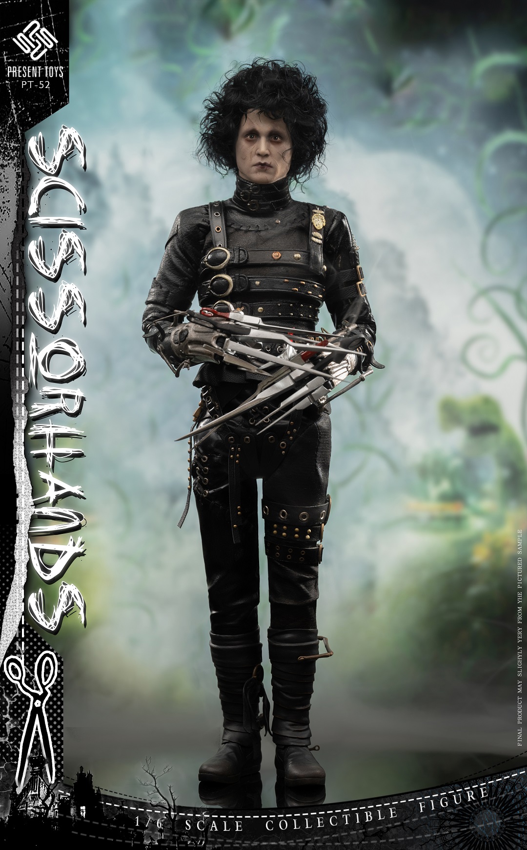 PRESENT TOYS New Product: 1:6 collectible toy – ScissorhandsPRESENT TOYS is proud to release a new product: 1:6 collectible toy – Scissorhands. Product Specs:Name: ScissorhandsProduct Number: PT-sp52Scale: 1/6Product List:Simulated Head Carving *1Articulated Body * 1Scissor hand *2 (Movable design)Black Leather Suit *1 (made of real leather)Shoulder strap *1Belt *1Leg strap *1Long boots *2White shirt *1Pants *1Figure stand*1 Release Date:4th quarter 2023(subject to the actual delivery time of the manufacturer.)
