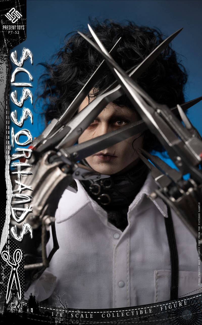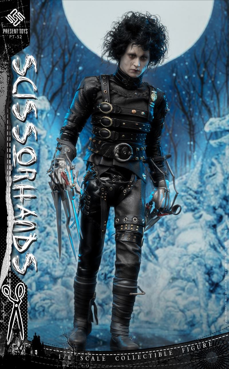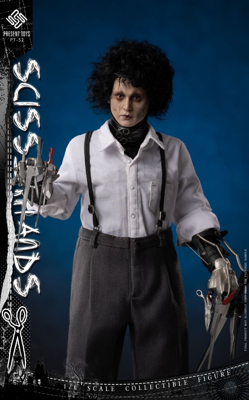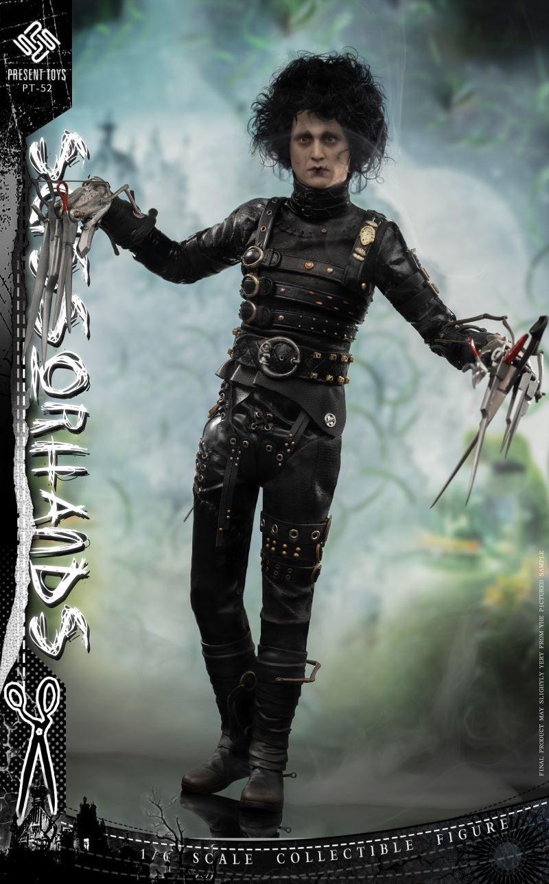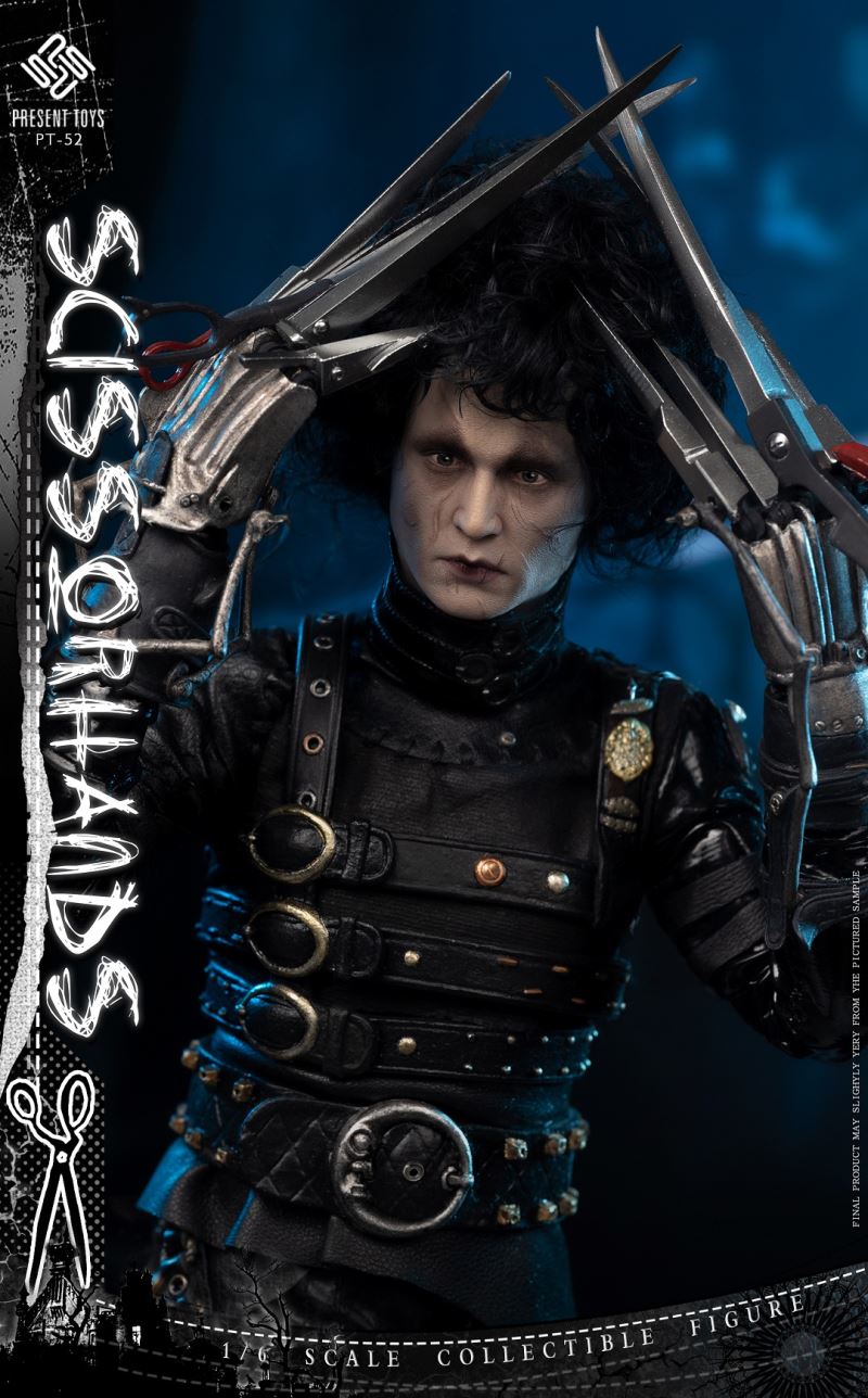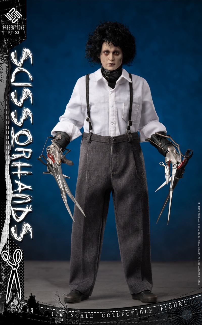 PRESENT TOYS New Product: 1:6 collectible toy – ScissorhandsPRESENT TOYS is proud to release a new product: 1:6 collectible toy – Scissorhands. Product Specs:Name: ScissorhandsProduct Number: PT-sp52Scale: 1/6Product List:Simulated Head Carving *1Articulated Body * 1Scissor hand *2 (Movable design)Black Leather Suit *1 (made of real leather)Shoulder strap *1Belt *1Leg strap *1Long boots *2White shirt *1Pants *1Figure stand*1 Release Date:4th quarter 2023(subject to the actual delivery time of the manufacturer.)