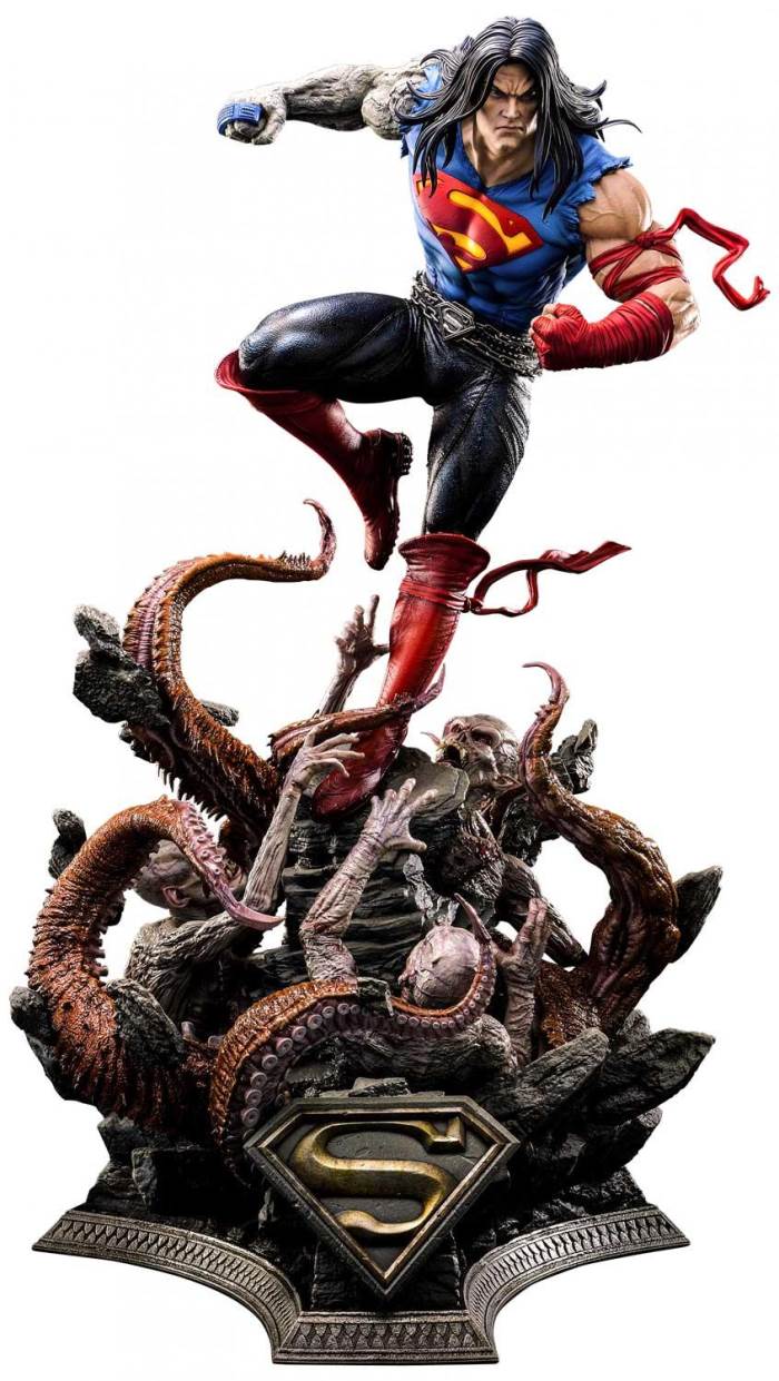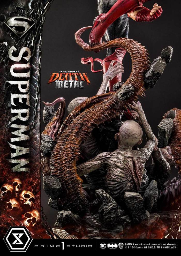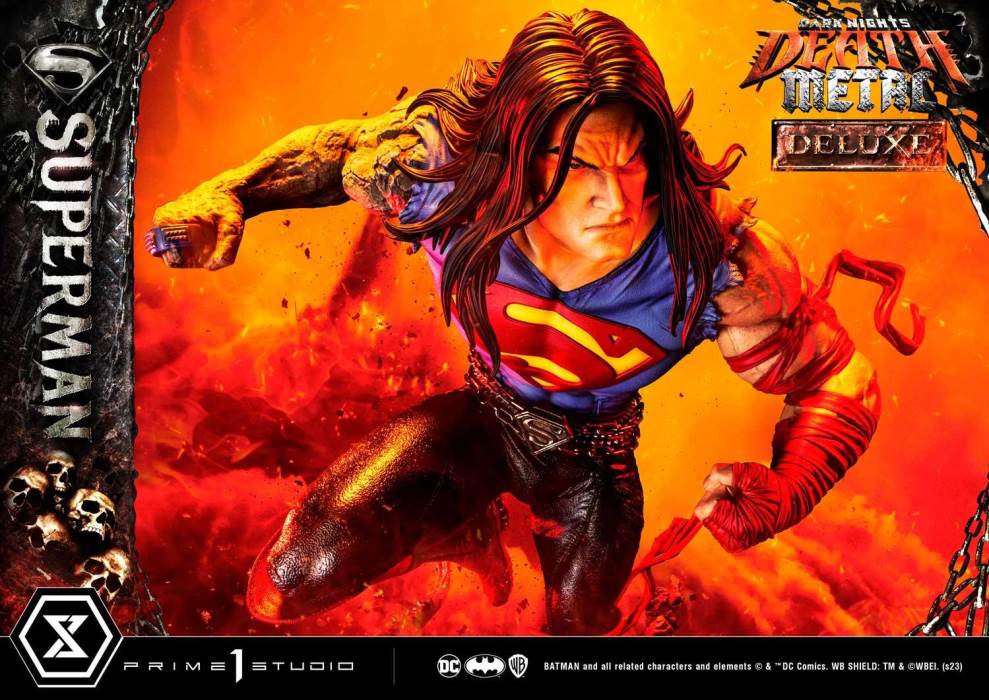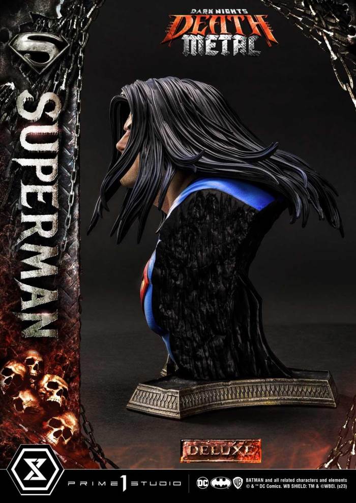 DescriptionsSorry. Every being living, dead, undead we fight together!”Prime 1 Studio is extremely proud and stoked to present yet another head-banging piece, joining our Museum Masterline, the 1:3 Scale DEATH METAL SUPERMAN DELUXE VERSION from DARK NIGHTS: DEATH METALDark Nights: Death Metal, brought to us by Scott Snyder, Greg Capullo and Jonathan Glapion, culminates the five-year long buildup of the Dark Multiverse Saga, unifying every storyline from the New 32 and DC Rebirth into a single universe. After the shattering of the Source Wall which freed Perpetua, our heroes find themselves at the mercy of the Batman Who Laughs. Wonder Woman launches a rescue mission on New Apokolips in order to free the Man of Steel from Darkfather’s torture machine. Enter a long-haired, Darkseid infected Superman equipped with lighting fast fingers that would shred through a mind-numbing apocalyptic guitar solo.Prime 1 Studio has crafted a version of the Man of Steel that has been affected by the Anti-Life Equation, having been tortured with Kryptonite by Darkfather’s Murder Machine, Superman’s appearance has been forever altered. Over 37 inches tall, Clark channels his ultimate rage as he fights his last battle to save humanity once again. His hair may have grown long but majestically flows across his sharp features. Having been exposed to Kryptonite and the Anti-Life Equation, the Darkseid infection has begun spreading, starting with his powerful and muscular right arm, turning it into a rock like limb. Oh, how it bears a suspiciously striking resemblance to Darkseid! His ripped shirt, skin-tight leather trousers, steel belt and crimson boots is the ultimate heavy metal outfit only Kal-El himself could have pulled off perfectly! The Darkest Knight and Perpetua’s demonic horde of zombies and eldritch tentacles are clawing and reaching out at his feet. Obsidian razor-sharp stones protruding from the deepest depths of the abyss. At the base of all this, we find the S-Shield, Krypton’s symbol of Hope. Once again, the breathtaking level of finesse and details is an enormous understatement.The Death Metal Superman Deluxe Version will come with two (2) additional heads bearing different expressions as well as two (2) display headstands so that you can choose to display your Death Metal Superman with the most metal look possible, whether you want him with an angry look or a stern look, screaming or teeth clenching, this Deluxe Version has got you covered!Do not wait any longer, add this hard-rocking, head-banging, guitar-shredding masterpiece to your Dark Nights: Metal & Heavy Metal collection today!Specifications:New Apokolips Demon-themed BaseThree (3) Swappable Superman HeadsTwo (2) display headstandsNotice:Prototype samples shown.Product details could be subject to change without further notice.Please note the final product specifications may differ because each product is Handmade.Since the product is still in the development stage, the Size (up to 10%) & Weight (up to 10kg) may be changed during the production stage.BATMAN and all related characters and elements © & ™ DC Comics.WB SHIELD: TM & © WBEI. (s23)