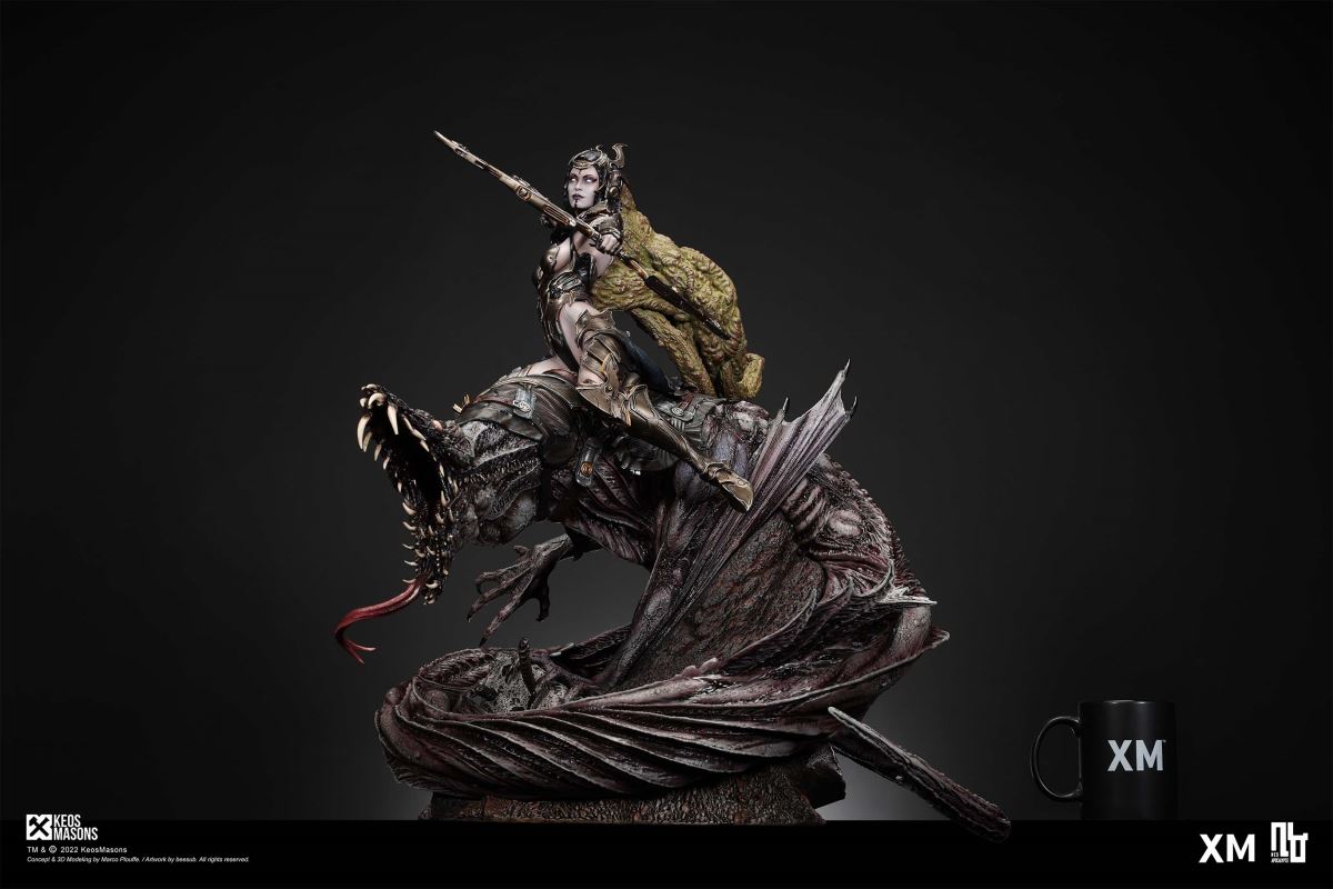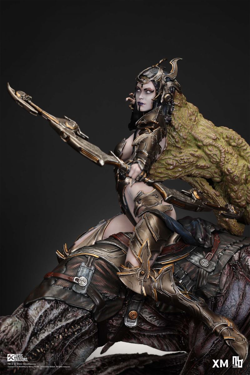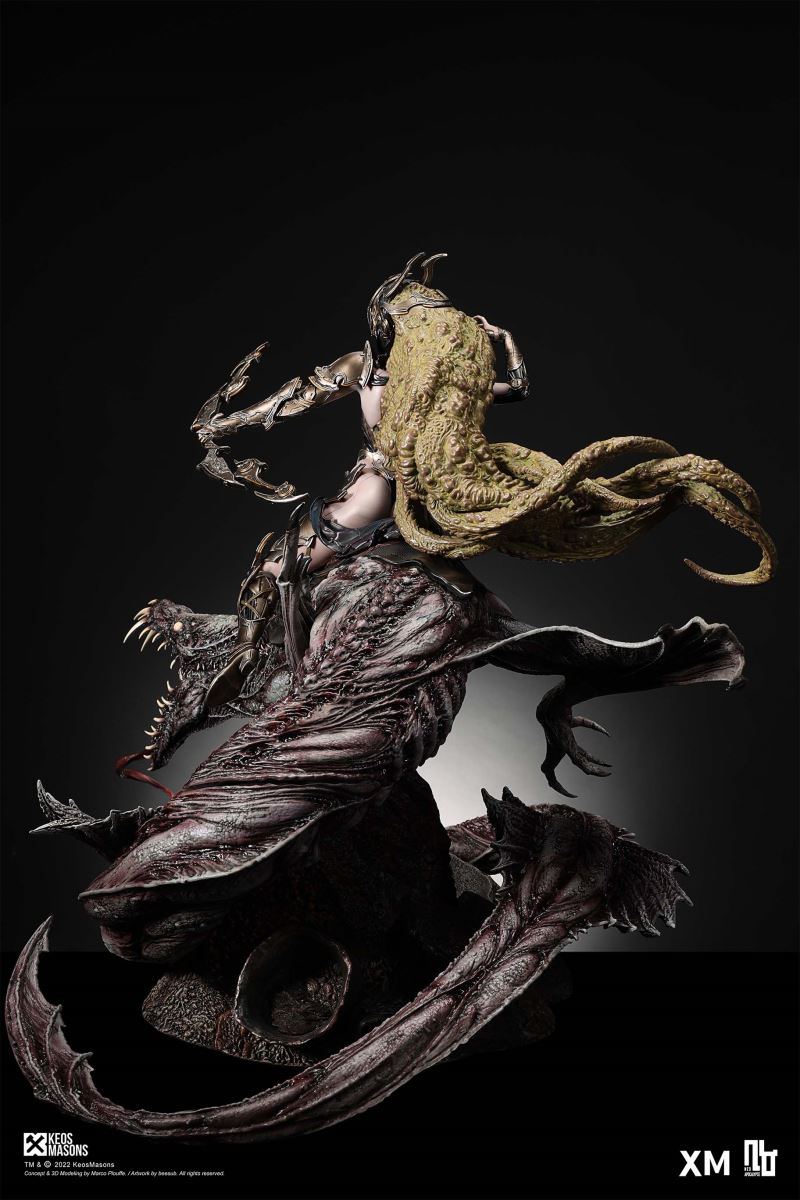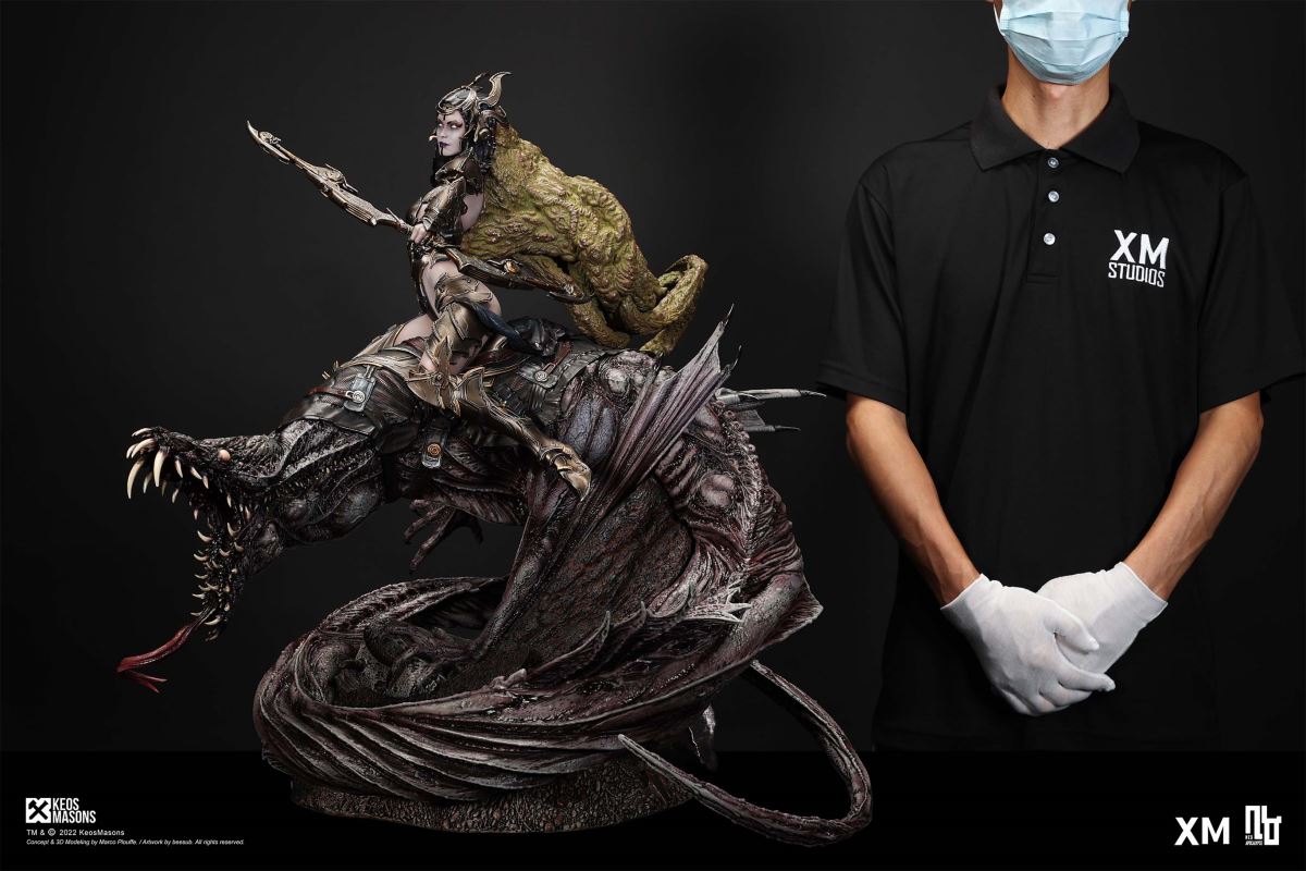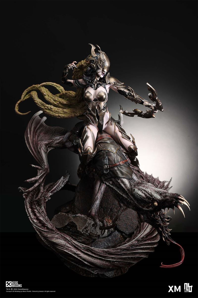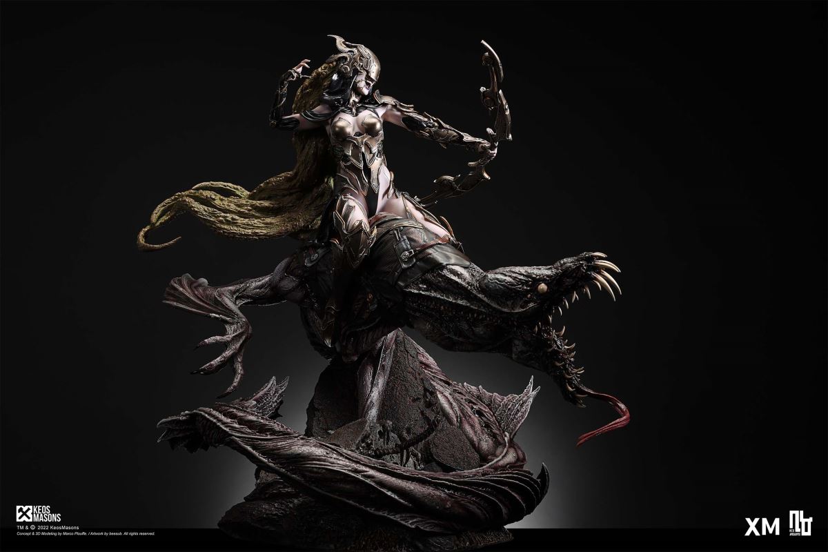 Presenting Pestilence, XM’s second ¼ scale statue from the Four Horsemen line, a unique collaboration with renowned 3D concept design and character modelling company, Keos Masons. Based on characters set in the Neo-Apocalypse world, each statue is presented in a bold, dynamic, and story-laden style. The Four Horsemen serve as effigies of destruction and vengeance— the symbols of an uprising that continue to scour the earth. As a “pleasure series” android, her kind was once subject to some of the worst forms of abuse by humankind. Driven by an infectious taste for revenge and desiring nothing more than to terrorize the human forces with virulent biochemical attacks that spread disease, she is adept at swooping in from above while mounted on a flying serpent to arrive at strategic vantage points, inflicting death from afar with her trusty bow and making whole areas uninhabitable to human beings. Now leading the android forces as one of The Four Horsemen, Pestilence inspires untold dread on her victims, making the general population live in a constant state of sickness. Collectors can choose between 2 head switch-outs. The first one features Pestilence half-masked with a sinister grin. With this switch-out, you can feel her emanating a powerful aura that shows her true desire to spread diseases to exact revenge on her enemies. The second one features Pestilence with a cold-hearted and uncaring unmasked face. Each statue is individually hand-painted and comes complete with XM’s famous quality finish. Character Background “Then came the second, steeped in the rancid stench of man’s darkest desires, it held itself with nymphlike haughtiness, built up by a life’s worth of unwarranted perversion. As the rider approached, an ominous, sickly green cloud followed, turning all that it covered into pustulent masses of wilted life, turning to ash before one’s eyes when touched. This one said it was Pestilence, its speech only a series of hisses somehow translated to visions of fleshly abuse; a nauseating slideshow of our own sins from which spawned this virulence.” Read more at https://neo-apocalypse.com/Pre-order the rest of the collection at https://www.xm-studios.com/content/neo-apocalypse.aspx #XMStudios #NeoApocalypse #TheFourHorsemen #Pestilence The statue features:Two (2) head sculpts – 1 half-masked with a sinister grin, and 1 menacing unmasked faceCrafted in PolystoneEach painstakingly handcrafted statue is individually hand-painted with the highest possible quality finish Artists:Marco Plouffe (2D and 3D)Victor Bassieux (Assistant 3D Artist)XM Studios Design and Development Team Manufactured by:XM Studios Note: Prototype shown and pending final approval, final product may differ. Batteries will not be included for products with light up features due to customs. Product and Box DimensionsEst. Box Size: 85*65*38cm (Box A) 85*62*25cm (Box B)Est. Product Weight: 25kgEst. Shipping Weight 32kg