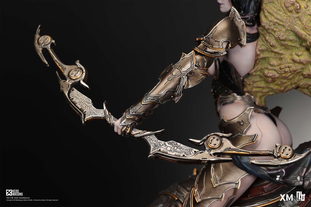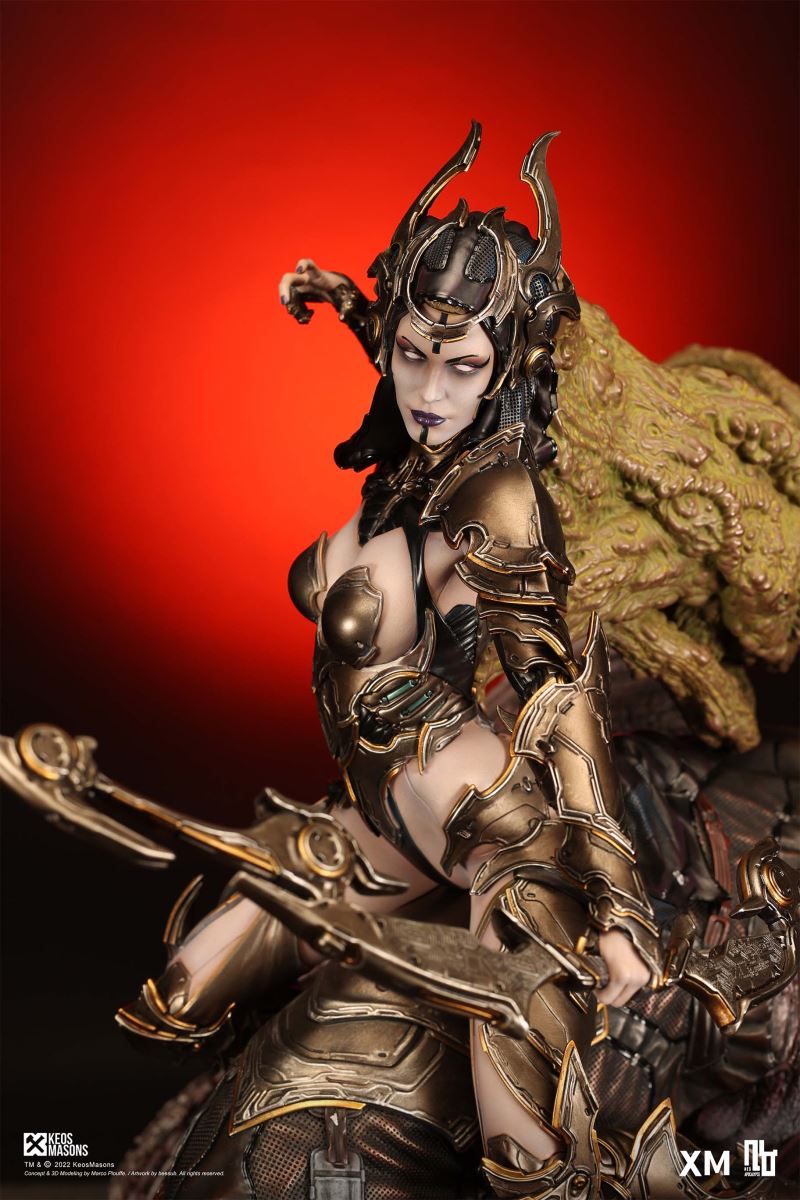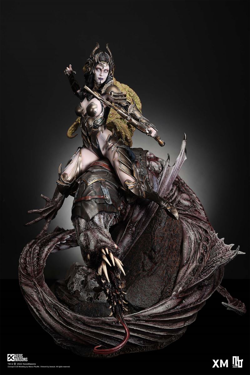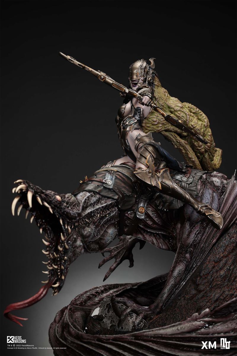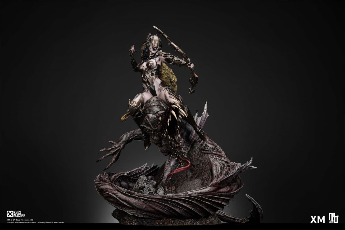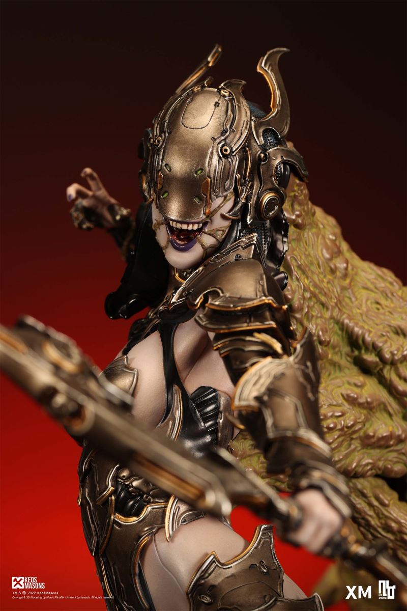 Presenting Pestilence, XM’s second ¼ scale statue from the Four Horsemen line, a unique collaboration with renowned 3D concept design and character modelling company, Keos Masons. Based on characters set in the Neo-Apocalypse world, each statue is presented in a bold, dynamic, and story-laden style. The Four Horsemen serve as effigies of destruction and vengeance— the symbols of an uprising that continue to scour the earth. As a “pleasure series” android, her kind was once subject to some of the worst forms of abuse by humankind. Driven by an infectious taste for revenge and desiring nothing more than to terrorize the human forces with virulent biochemical attacks that spread disease, she is adept at swooping in from above while mounted on a flying serpent to arrive at strategic vantage points, inflicting death from afar with her trusty bow and making whole areas uninhabitable to human beings. Now leading the android forces as one of The Four Horsemen, Pestilence inspires untold dread on her victims, making the general population live in a constant state of sickness. Collectors can choose between 2 head switch-outs. The first one features Pestilence half-masked with a sinister grin. With this switch-out, you can feel her emanating a powerful aura that shows her true desire to spread diseases to exact revenge on her enemies. The second one features Pestilence with a cold-hearted and uncaring unmasked face. Each statue is individually hand-painted and comes complete with XM’s famous quality finish. Character Background “Then came the second, steeped in the rancid stench of man’s darkest desires, it held itself with nymphlike haughtiness, built up by a life’s worth of unwarranted perversion. As the rider approached, an ominous, sickly green cloud followed, turning all that it covered into pustulent masses of wilted life, turning to ash before one’s eyes when touched. This one said it was Pestilence, its speech only a series of hisses somehow translated to visions of fleshly abuse; a nauseating slideshow of our own sins from which spawned this virulence.” Read more at https://neo-apocalypse.com/Pre-order the rest of the collection at https://www.xm-studios.com/content/neo-apocalypse.aspx #XMStudios #NeoApocalypse #TheFourHorsemen #Pestilence The statue features:Two (2) head sculpts – 1 half-masked with a sinister grin, and 1 menacing unmasked faceCrafted in PolystoneEach painstakingly handcrafted statue is individually hand-painted with the highest possible quality finish Artists:Marco Plouffe (2D and 3D)Victor Bassieux (Assistant 3D Artist)XM Studios Design and Development Team Manufactured by:XM Studios Note: Prototype shown and pending final approval, final product may differ. Batteries will not be included for products with light up features due to customs. Product and Box DimensionsEst. Box Size: 85*65*38cm (Box A) 85*62*25cm (Box B)Est. Product Weight: 25kgEst. Shipping Weight 32kg