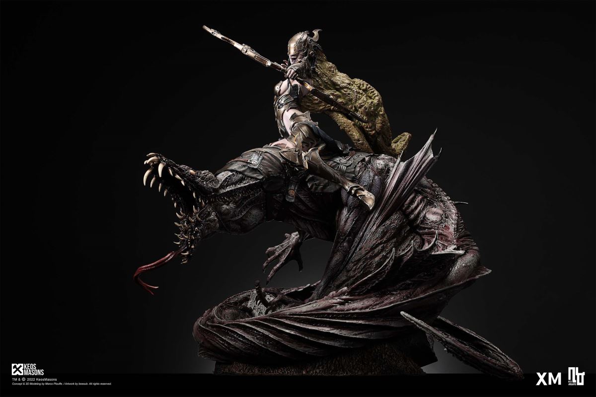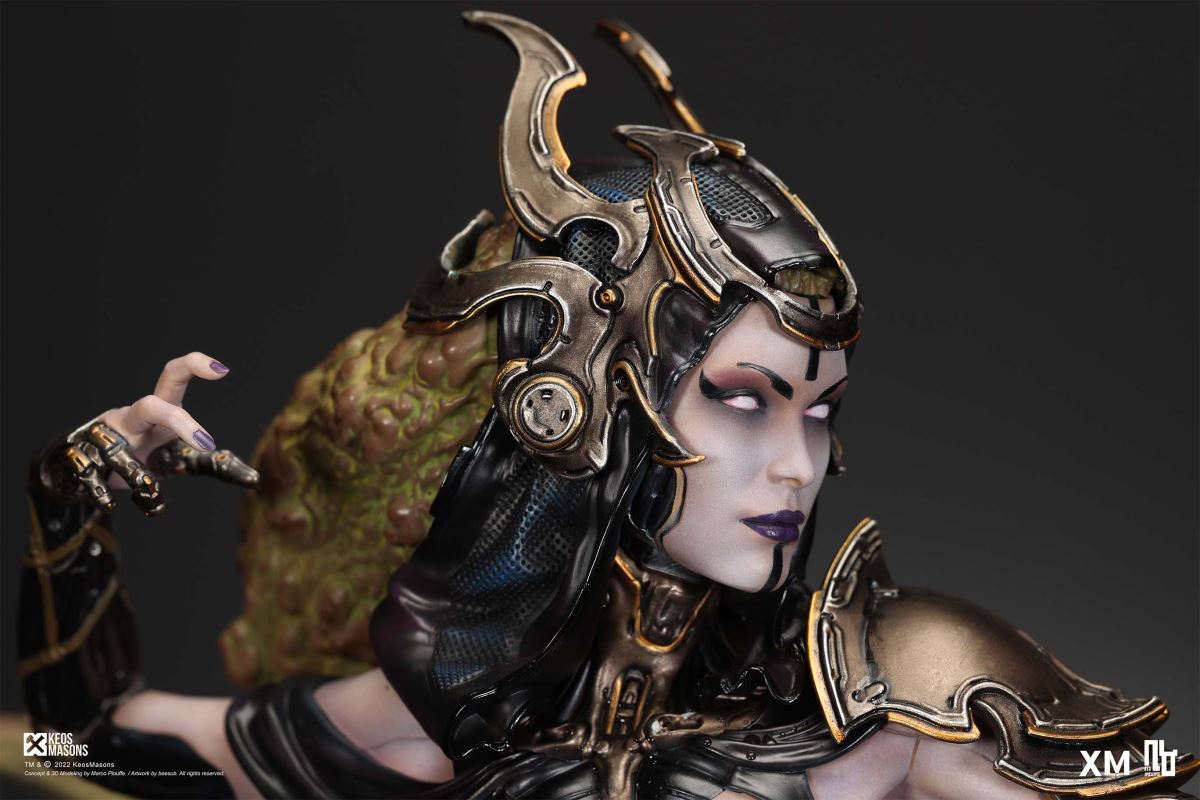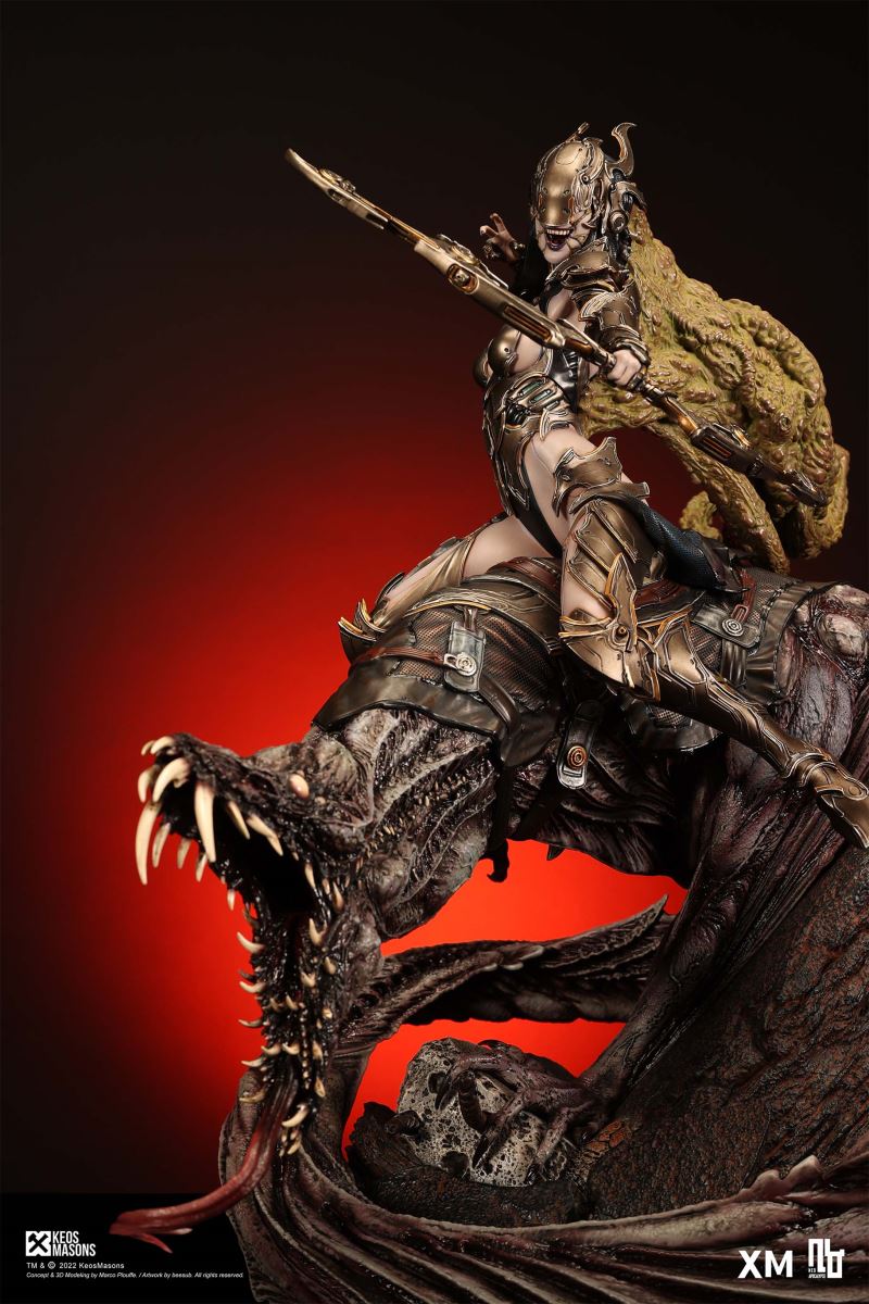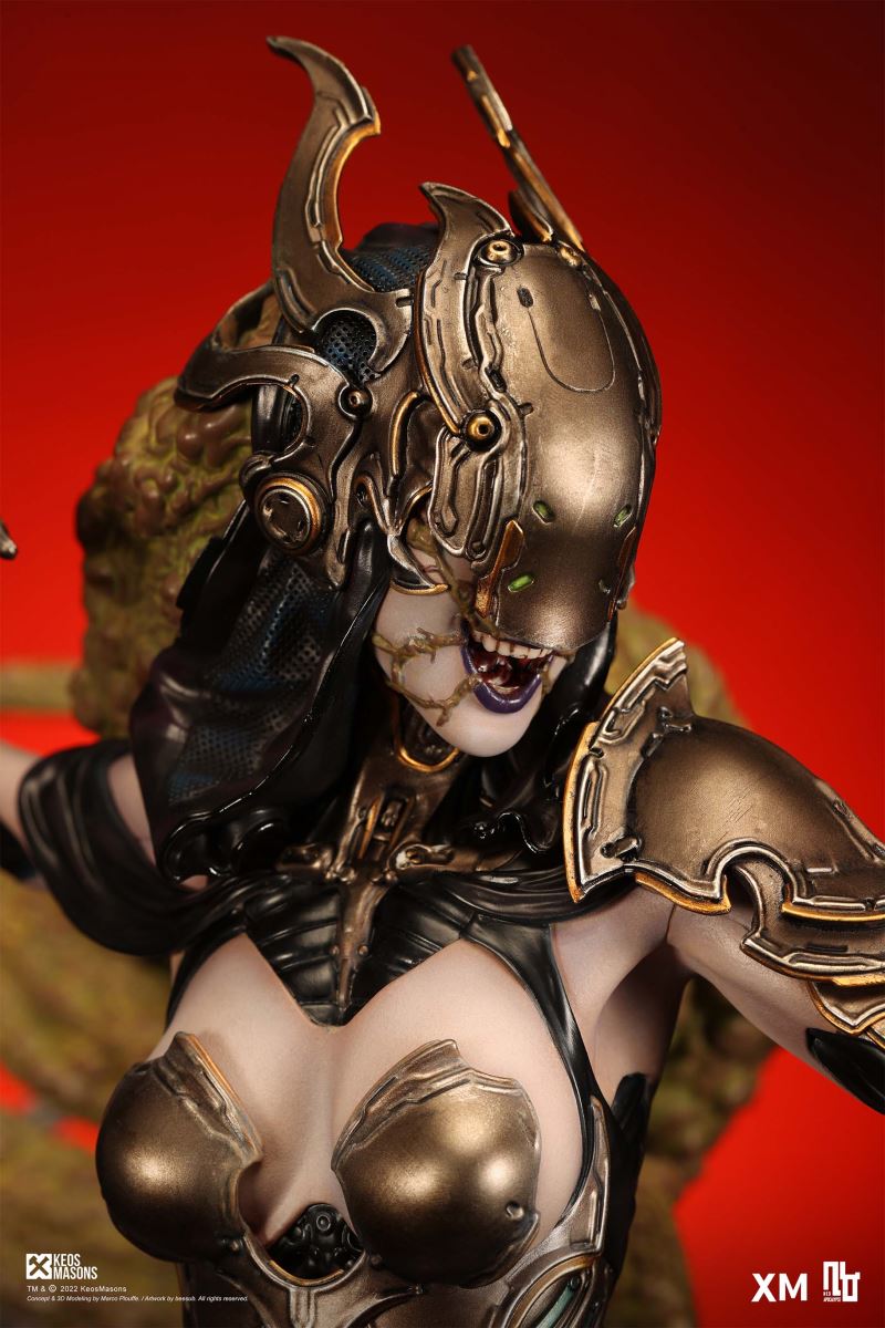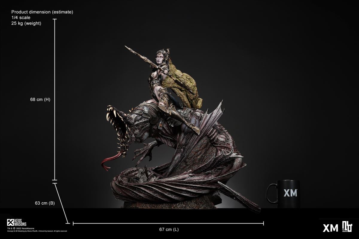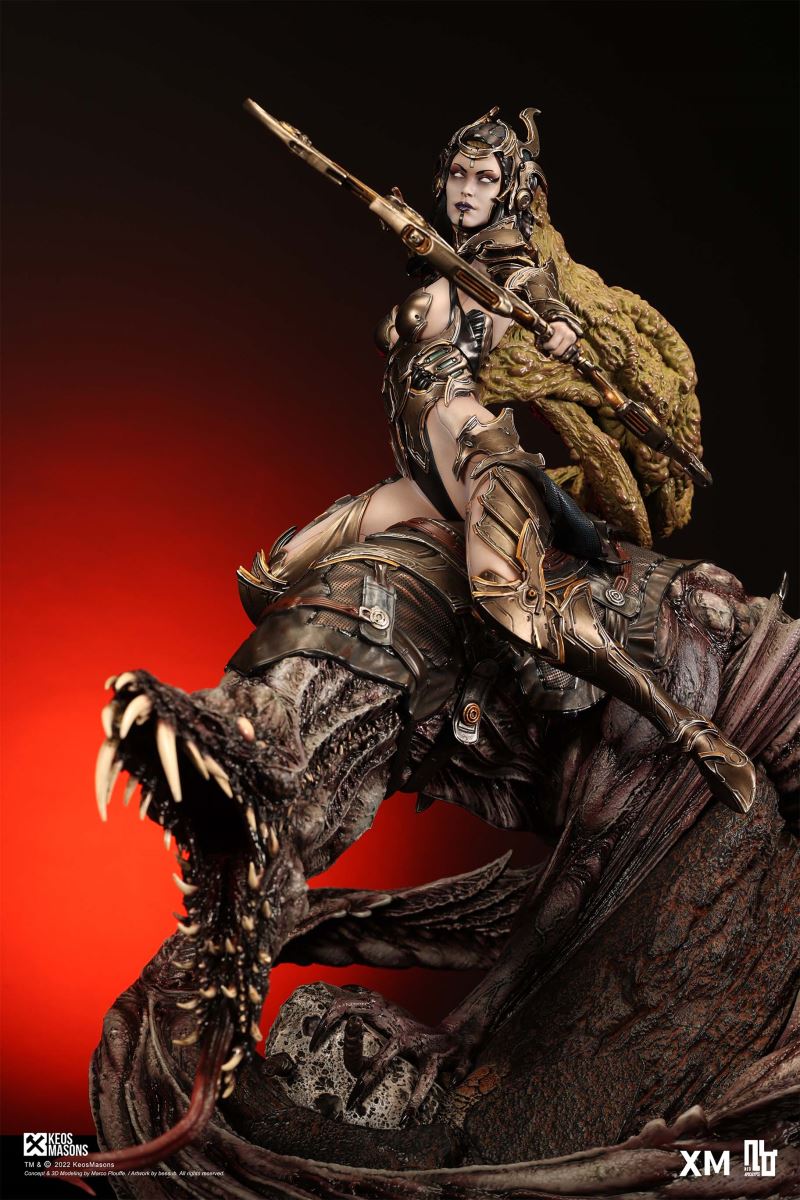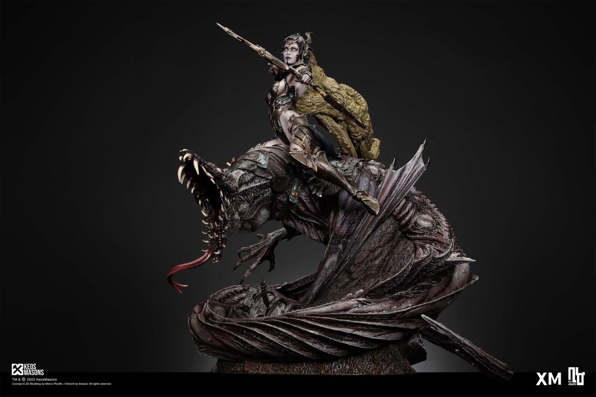Presenting Pestilence, XM’s second ¼ scale statue from the Four Horsemen line, a unique collaboration with renowned 3D concept design and character modelling company, Keos Masons. Based on characters set in the Neo-Apocalypse world, each statue is presented in a bold, dynamic, and story-laden style. The Four Horsemen serve as effigies of destruction and vengeance— the symbols of an uprising that continue to scour the earth. As a “pleasure series” android, her kind was once subject to some of the worst forms of abuse by humankind. Driven by an infectious taste for revenge and desiring nothing more than to terrorize the human forces with virulent biochemical attacks that spread disease, she is adept at swooping in from above while mounted on a flying serpent to arrive at strategic vantage points, inflicting death from afar with her trusty bow and making whole areas uninhabitable to human beings. Now leading the android forces as one of The Four Horsemen, Pestilence inspires untold dread on her victims, making the general population live in a constant state of sickness. Collectors can choose between 2 head switch-outs. The first one features Pestilence half-masked with a sinister grin. With this switch-out, you can feel her emanating a powerful aura that shows her true desire to spread diseases to exact revenge on her enemies. The second one features Pestilence with a cold-hearted and uncaring unmasked face. Each statue is individually hand-painted and comes complete with XM’s famous quality finish. Character Background “Then came the second, steeped in the rancid stench of man’s darkest desires, it held itself with nymphlike haughtiness, built up by a life’s worth of unwarranted perversion. As the rider approached, an ominous, sickly green cloud followed, turning all that it covered into pustulent masses of wilted life, turning to ash before one’s eyes when touched. This one said it was Pestilence, its speech only a series of hisses somehow translated to visions of fleshly abuse; a nauseating slideshow of our own sins from which spawned this virulence.” Read more at https://neo-apocalypse.com/Pre-order the rest of the collection at https://www.xm-studios.com/content/neo-apocalypse.aspx #XMStudios #NeoApocalypse #TheFourHorsemen #Pestilence The statue features:Two (2) head sculpts – 1 half-masked with a sinister grin, and 1 menacing unmasked faceCrafted in PolystoneEach painstakingly handcrafted statue is individually hand-painted with the highest possible quality finish Artists:Marco Plouffe (2D and 3D)Victor Bassieux (Assistant 3D Artist)XM Studios Design and Development Team Manufactured by:XM Studios Note: Prototype shown and pending final approval, final product may differ. Batteries will not be included for products with light up features due to customs. Product and Box DimensionsEst. Box Size: 85*65*38cm (Box A) 85*62*25cm (Box B)Est. Product Weight: 25kgEst. Shipping Weight 32kg