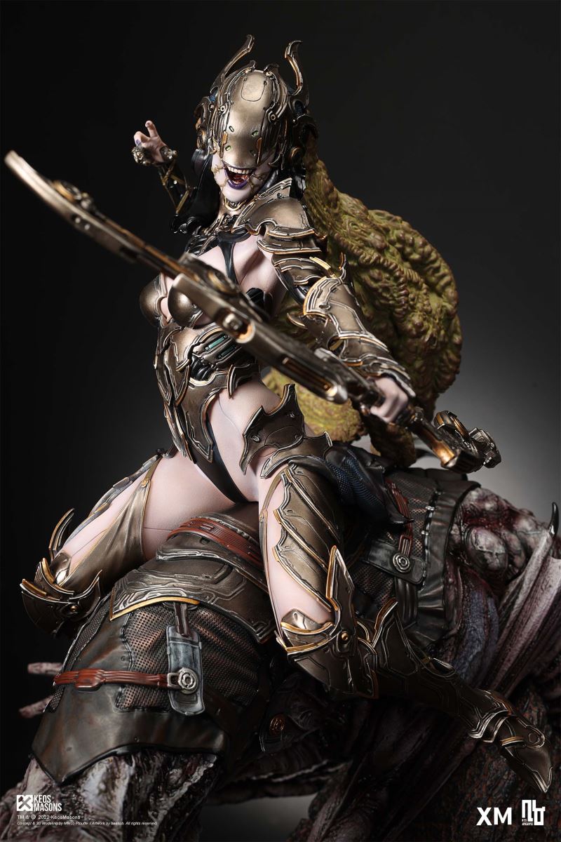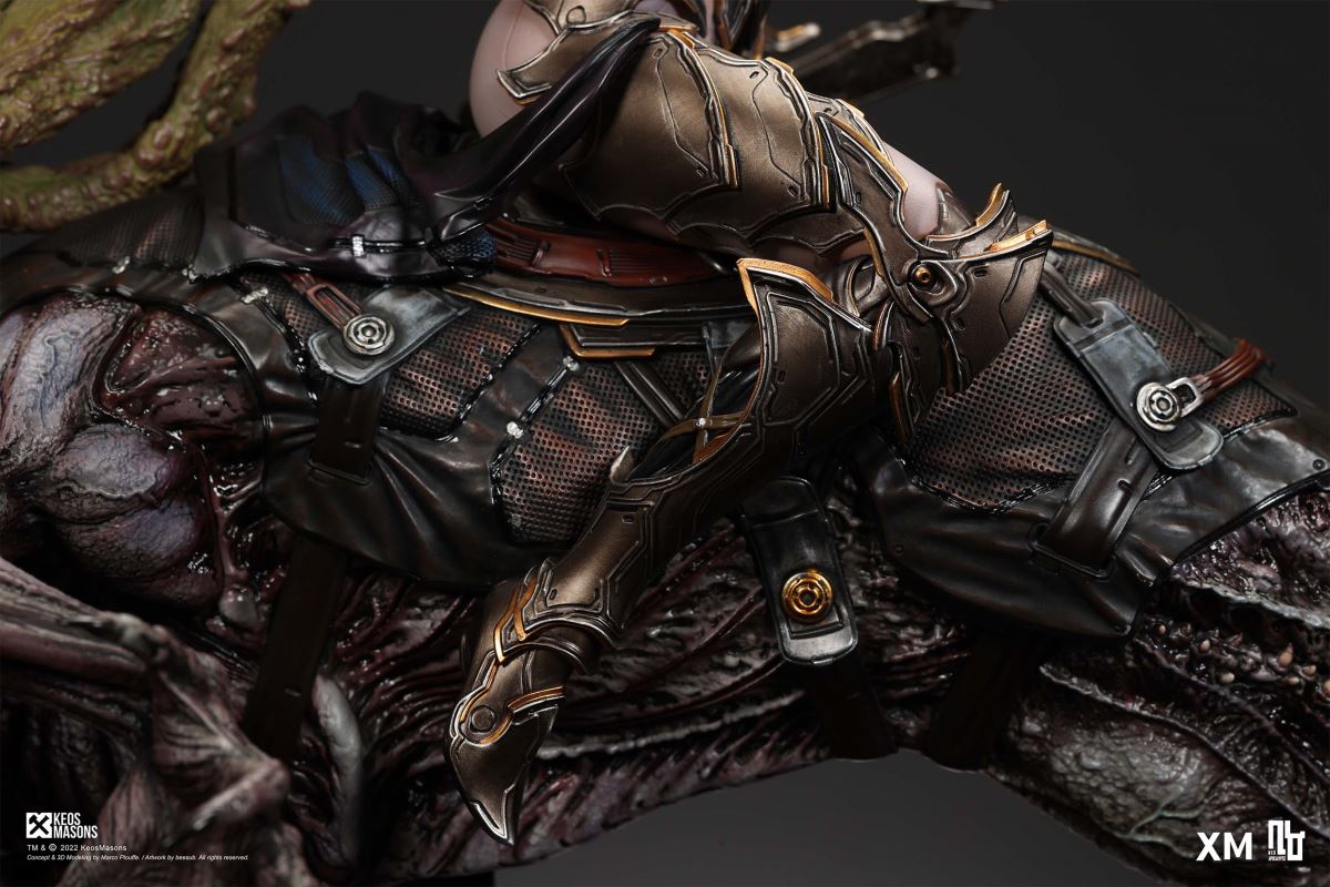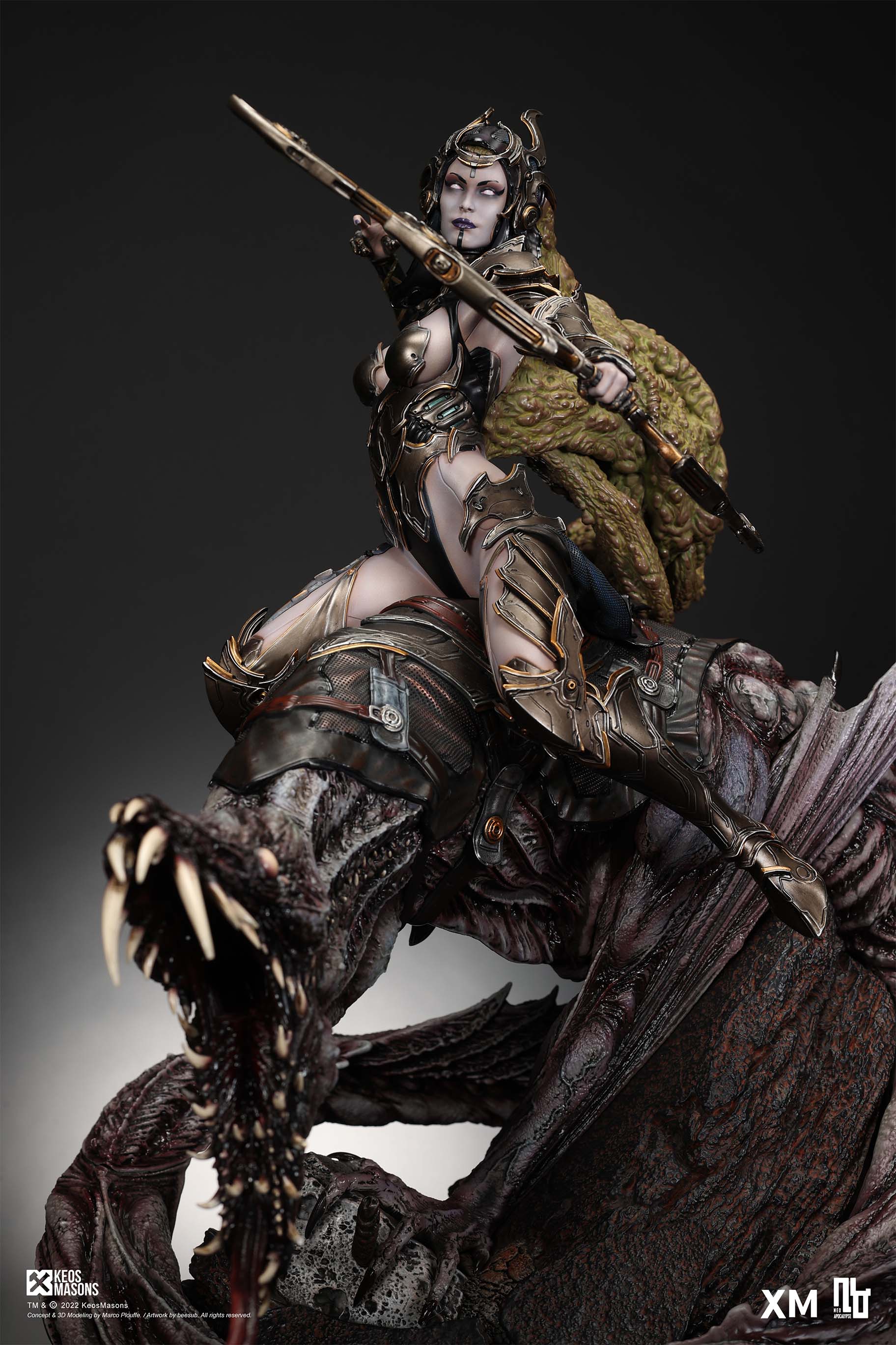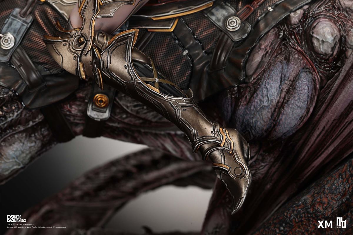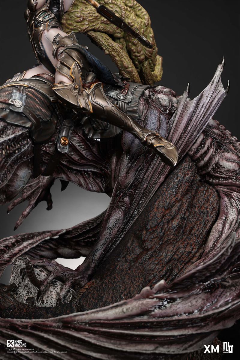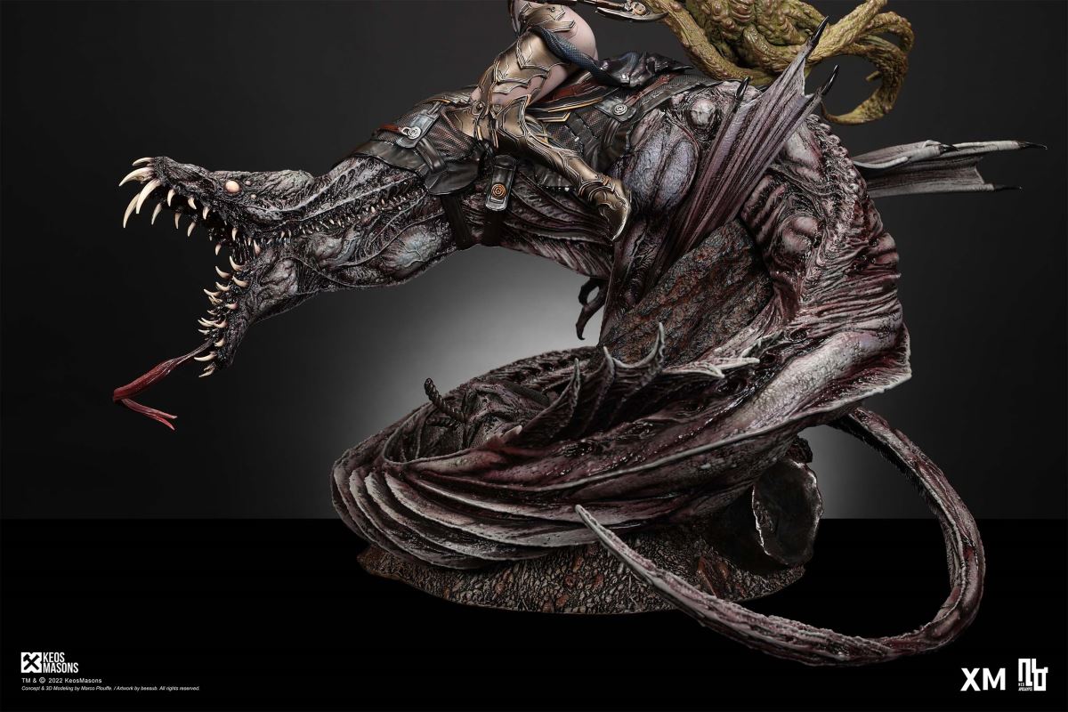 Presenting Pestilence, XM’s second ¼ scale statue from the Four Horsemen line, a unique collaboration with renowned 3D concept design and character modelling company, Keos Masons. Based on characters set in the Neo-Apocalypse world, each statue is presented in a bold, dynamic, and story-laden style. The Four Horsemen serve as effigies of destruction and vengeance— the symbols of an uprising that continue to scour the earth. As a “pleasure series” android, her kind was once subject to some of the worst forms of abuse by humankind. Driven by an infectious taste for revenge and desiring nothing more than to terrorize the human forces with virulent biochemical attacks that spread disease, she is adept at swooping in from above while mounted on a flying serpent to arrive at strategic vantage points, inflicting death from afar with her trusty bow and making whole areas uninhabitable to human beings. Now leading the android forces as one of The Four Horsemen, Pestilence inspires untold dread on her victims, making the general population live in a constant state of sickness. Collectors can choose between 2 head switch-outs. The first one features Pestilence half-masked with a sinister grin. With this switch-out, you can feel her emanating a powerful aura that shows her true desire to spread diseases to exact revenge on her enemies. The second one features Pestilence with a cold-hearted and uncaring unmasked face. Each statue is individually hand-painted and comes complete with XM’s famous quality finish. Character Background “Then came the second, steeped in the rancid stench of man’s darkest desires, it held itself with nymphlike haughtiness, built up by a life’s worth of unwarranted perversion. As the rider approached, an ominous, sickly green cloud followed, turning all that it covered into pustulent masses of wilted life, turning to ash before one’s eyes when touched. This one said it was Pestilence, its speech only a series of hisses somehow translated to visions of fleshly abuse; a nauseating slideshow of our own sins from which spawned this virulence.” Read more at https://neo-apocalypse.com/Pre-order the rest of the collection at https://www.xm-studios.com/content/neo-apocalypse.aspx #XMStudios #NeoApocalypse #TheFourHorsemen #Pestilence The statue features:Two (2) head sculpts – 1 half-masked with a sinister grin, and 1 menacing unmasked faceCrafted in PolystoneEach painstakingly handcrafted statue is individually hand-painted with the highest possible quality finish Artists:Marco Plouffe (2D and 3D)Victor Bassieux (Assistant 3D Artist)XM Studios Design and Development Team Manufactured by:XM Studios Note: Prototype shown and pending final approval, final product may differ. Batteries will not be included for products with light up features due to customs. Product and Box DimensionsEst. Box Size: 85*65*38cm (Box A) 85*62*25cm (Box B)Est. Product Weight: 25kgEst. Shipping Weight 32kg