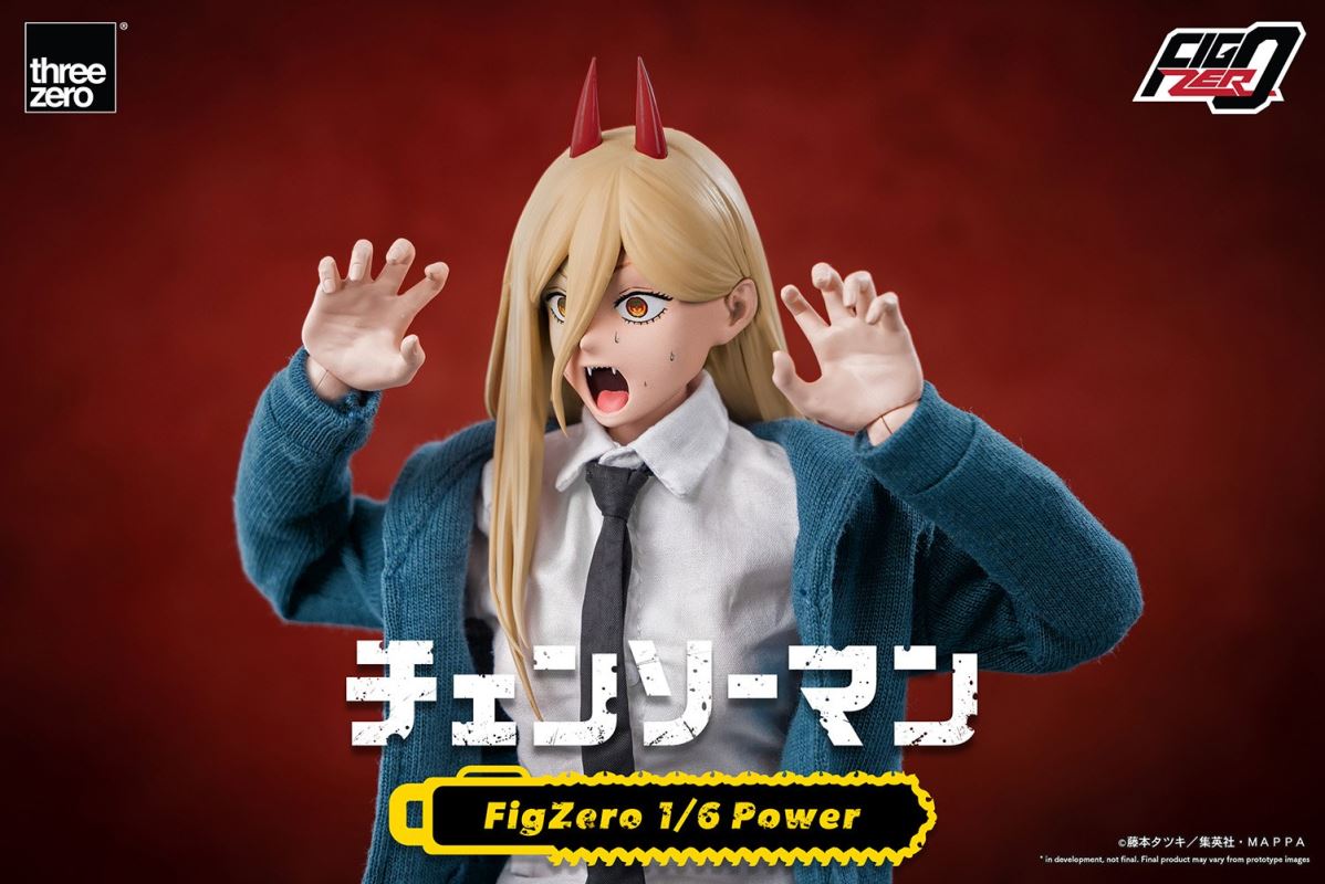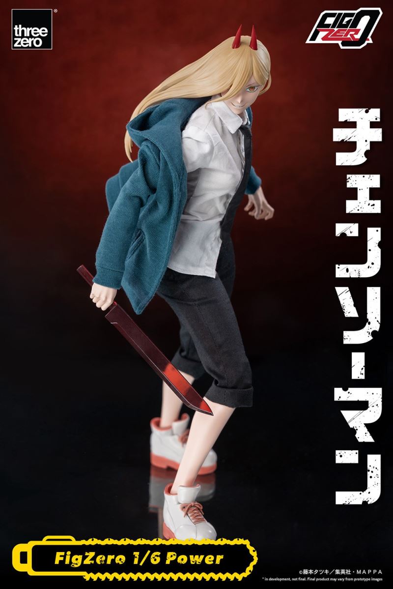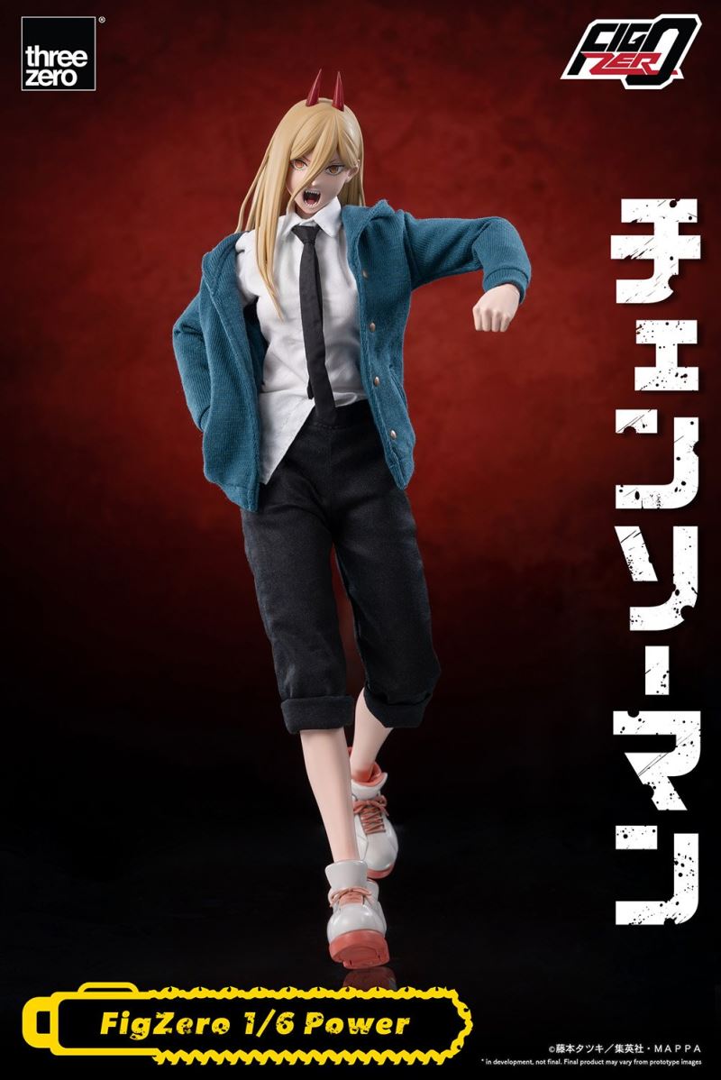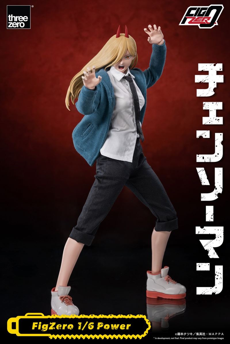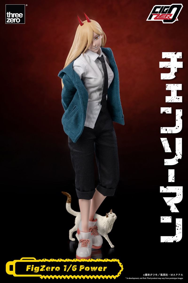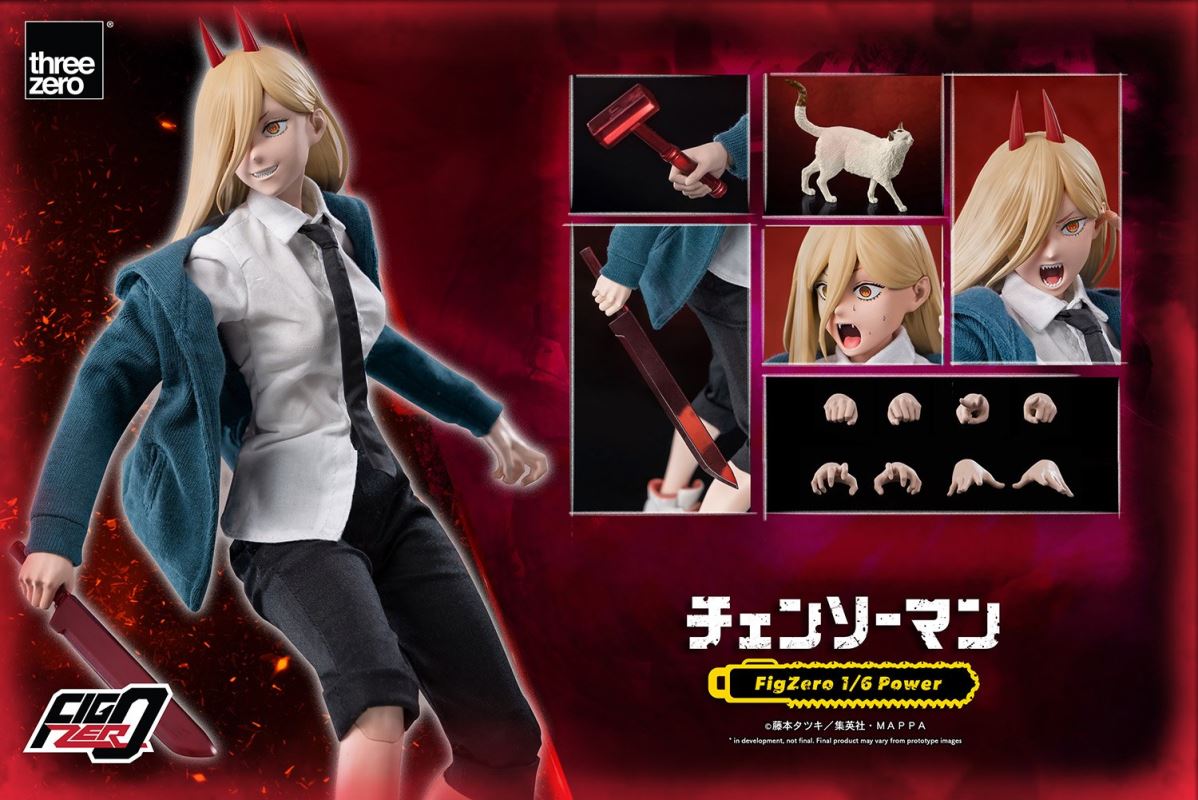 Chainsaw Man Fig Zero 1/6 PowerThe new work of the Fig Zero line of the TV anime Chainsaw Man is Power! A 1/6 scale articulated figure featuring a precise head sculpt and hand-sewn cloth costume, realistically reproducing the appearance in the TV anime play.Fig Zero 1/6 Power is a fully movable figure with a total height of about 28.8 cm and more than 31 points of articulation throughout the body. Mr. Akinori Takagi is in charge of the prototype of all parts. The main materials of the figures are ABS, PVC, POM and cloth.Power's facial expression parts are interchangeable, and 3 pieces are included: a fearless face, a screaming face, and a surprised face. The hair parts are also interchangeable, and two sets of normal hair and action scene hair are included. The upper body has been newly designed for this item, and it uses chest pad parts that can be easily attached and detached by magnets. Jackets, shirts, ties, and trousers are made of cloth. In addition, a bloody sword and a bloody hammer are included as weapons, as well as six interchangeable wrist parts with different poses. In addition, a non-moving figure of the cat Nyako in the same scale is also included.specificationMr. Akinori Takagi is in charge of the prototype1/6 scale, total height about 28.8cmMore than 31 movable points (upper body is newly designed)costumeCloth jacket x 1Cloth shirt x 1Cloth pants x 1Cloth necktie x 11 pair of sneakersaccessoriesInterchangeable expression parts x 3 (Fearless face, screaming face, surprised face)Exchangeable expression parts x 2 sets (normal hair, action scene hair)Detachable chest pad (using magnet) x 1 pairblood sword x1Blood Hammer x1Interchangeable wrist parts x 6 types (fist x 1 pair, open hand x 1 pair, weapon holding hand x 1 pair, grabbing hand x 1 pair, V sign right hand x 1, pointing pose left hand x 1)Nyako (non-movable) x 1Material: ABS, PVC, POM, clothPre-order sales start at threezero store: January 31, 2023 Price at threezero store: 149 USD / 20,880 yen + shipping Scheduled shipping date: Q3 2023 (July-September)