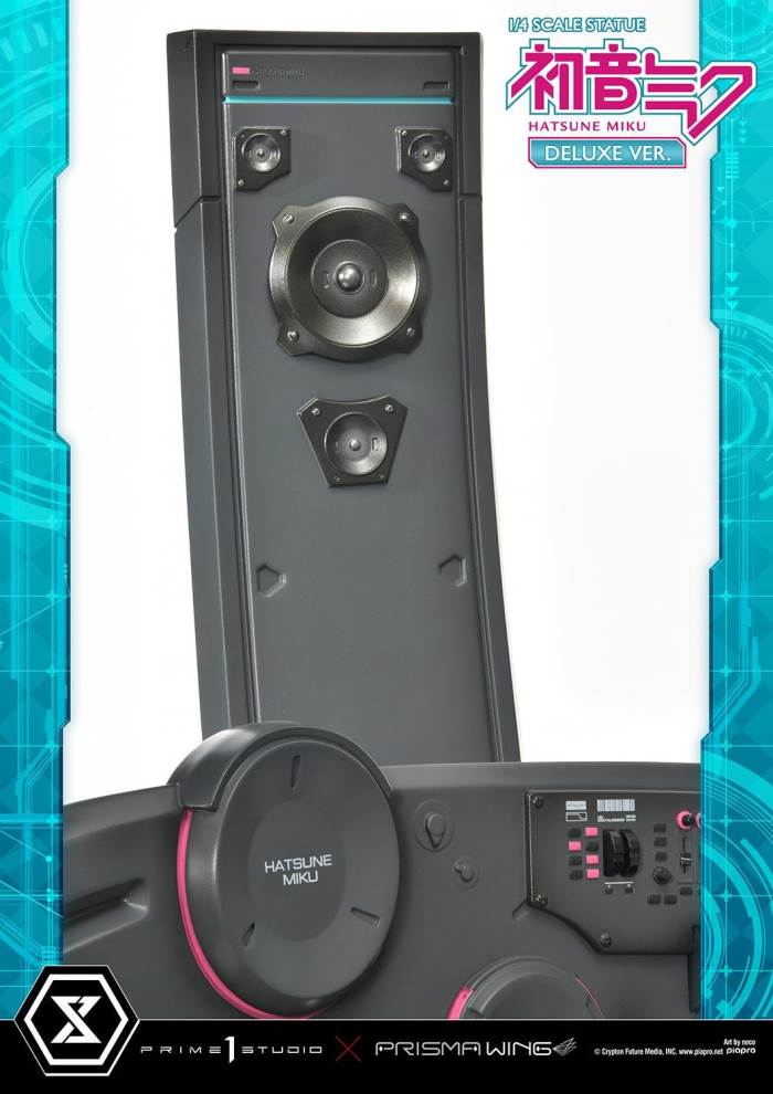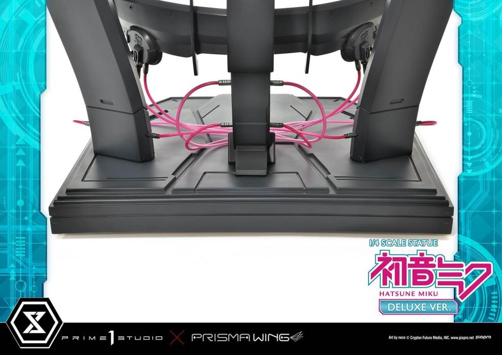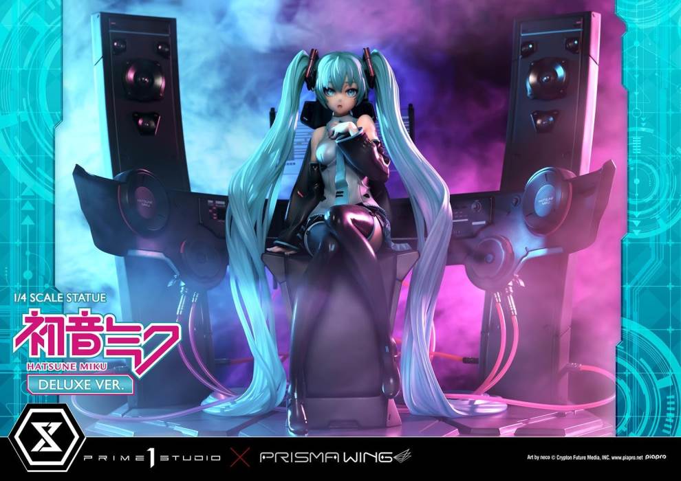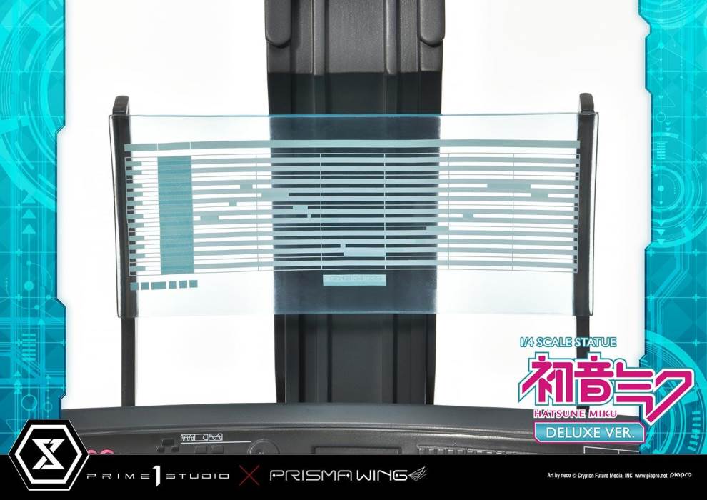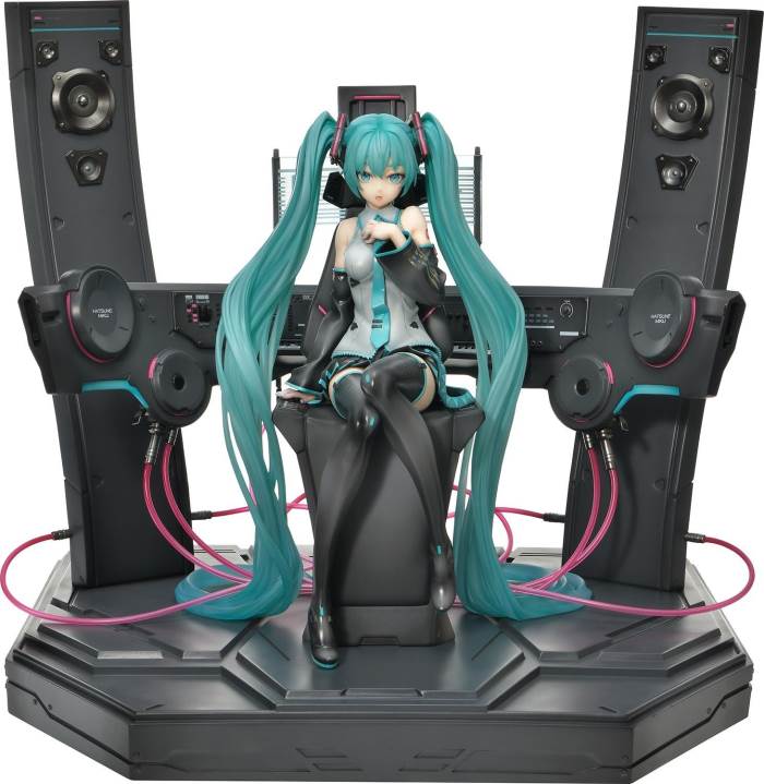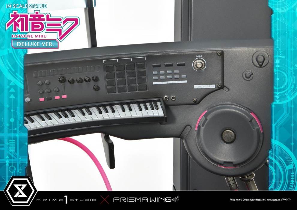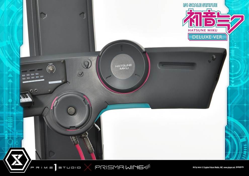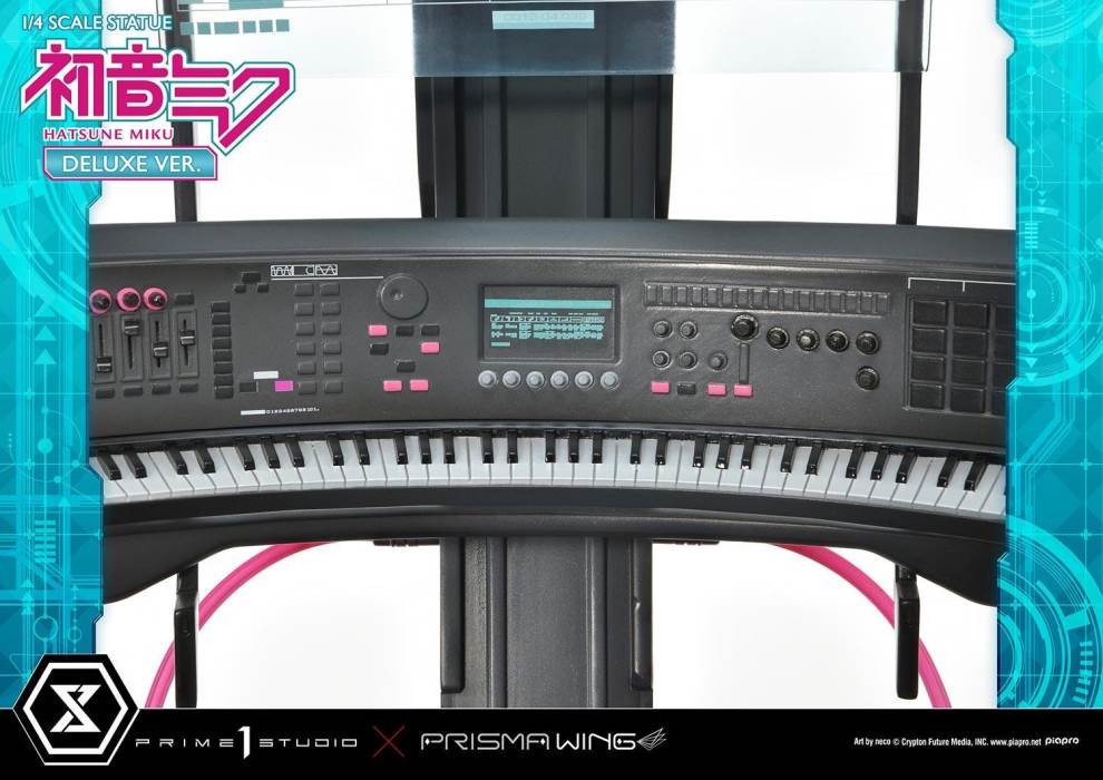 DescriptionsBrought to you from the popular illustrator neco, comes a 46 cm tall voluminous rendition of Hatsune Miku.neco is an artist who has been active in both the character design and illustration worlds. With their usual touch of elegance, they have created this towering depiction of the most popular Japanese virtual singer.Made with neco’s ever-charming signature dark-lined expressions, combined with subtle colors and lines to create an innocent contour that pairs well with Hatsune Miku’s mature-like gaze. The costume as well as the articulated portrayal of shading and texture have been meticulously crafted with a fixation on every minute detail. From her necktie pin to the gauge engraved on her sleeve, only a statue crafted at such a large size can feature precise details like these. Even the 01 on her skin has been elegantly depicted. With closer examination, one can notice the multiple layers of gradation that have been represented, including her light skin color.The Deluxe Bonus version of this rendition of the songstress also features a specialized synthesizer-shaped base. This includes an 88-key keyboard, a clear monitor featuring recorded lines, as well as 2 impressive speakers. The exquisite details crafted in polystone refer to many of her most famous songs. This piece contains great use of stylish symmetry, featured in the making of Miku’s twin tails as she sits in the center of the piece, as well as the 2 large speakers and pink cables. Once you buy this statue, you can fully enjoy every refined piece of this design to your heart’s content.Hatsune Miku “Art by neco” is the perfect representation of neco’s sensibility as an artist, containing the highest level of figurative expression possible. For all of the virtual singer fans around the world, if you order from the official website, you can receive a B3-sized fabric poster featuring original artwork! Don’t miss out on this one-of-a-kind large-scale statue!Specifications:Specialized synthesizer polystone baseB3-sized fabric poster [Bonus Version Exclusive]
