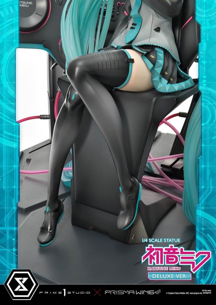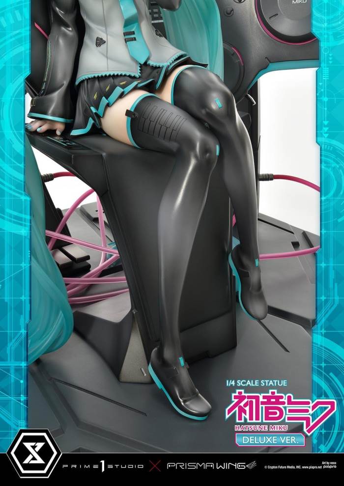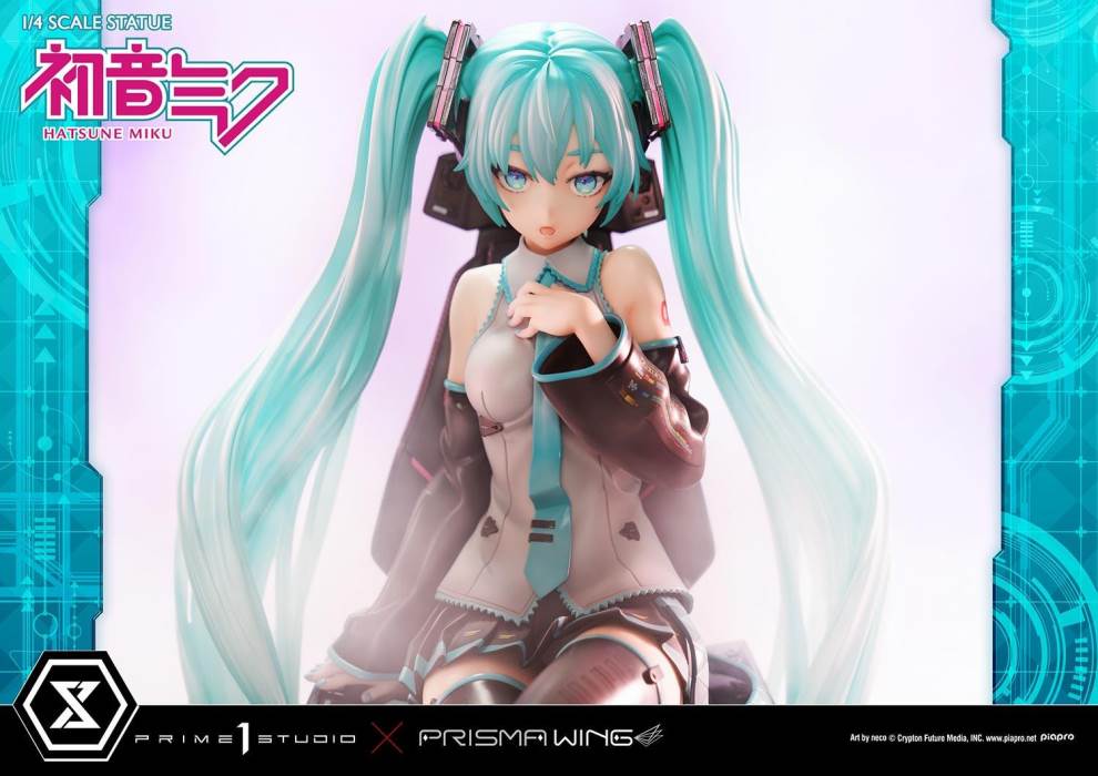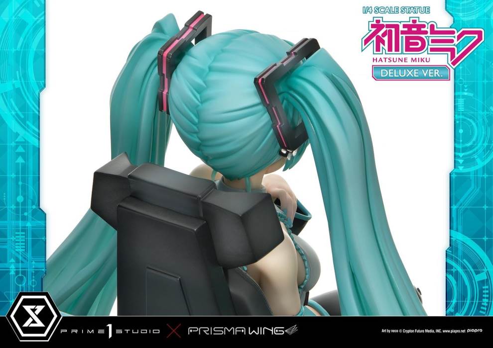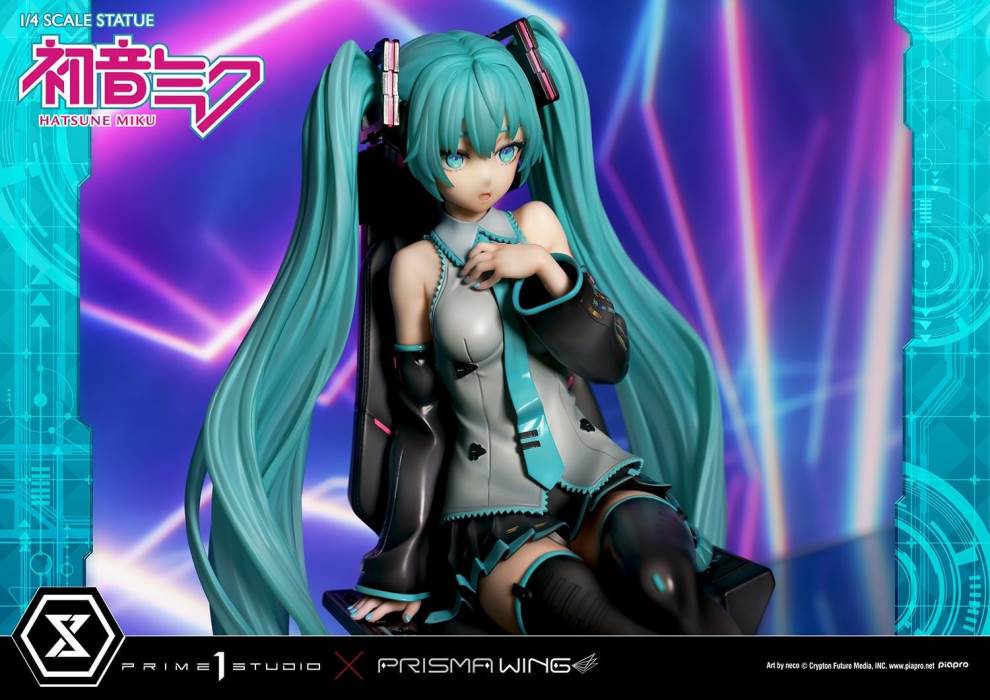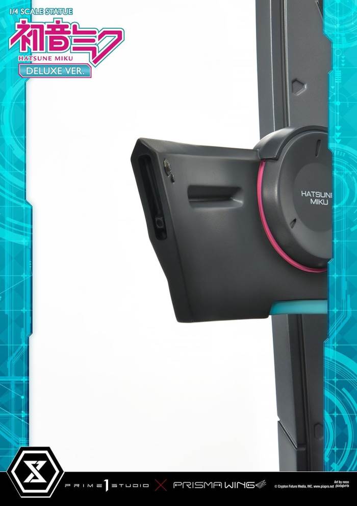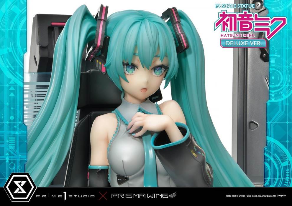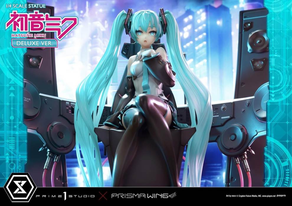 DescriptionsBrought to you from the popular illustrator neco, comes a 46 cm tall voluminous rendition of Hatsune Miku.neco is an artist who has been active in both the character design and illustration worlds. With their usual touch of elegance, they have created this towering depiction of the most popular Japanese virtual singer.Made with neco’s ever-charming signature dark-lined expressions, combined with subtle colors and lines to create an innocent contour that pairs well with Hatsune Miku’s mature-like gaze. The costume as well as the articulated portrayal of shading and texture have been meticulously crafted with a fixation on every minute detail. From her necktie pin to the gauge engraved on her sleeve, only a statue crafted at such a large size can feature precise details like these. Even the 01 on her skin has been elegantly depicted. With closer examination, one can notice the multiple layers of gradation that have been represented, including her light skin color.The Deluxe Bonus version of this rendition of the songstress also features a specialized synthesizer-shaped base. This includes an 88-key keyboard, a clear monitor featuring recorded lines, as well as 2 impressive speakers. The exquisite details crafted in polystone refer to many of her most famous songs. This piece contains great use of stylish symmetry, featured in the making of Miku’s twin tails as she sits in the center of the piece, as well as the 2 large speakers and pink cables. Once you buy this statue, you can fully enjoy every refined piece of this design to your heart’s content.Hatsune Miku “Art by neco” is the perfect representation of neco’s sensibility as an artist, containing the highest level of figurative expression possible. For all of the virtual singer fans around the world, if you order from the official website, you can receive a B3-sized fabric poster featuring original artwork! Don’t miss out on this one-of-a-kind large-scale statue!Specifications:Specialized synthesizer polystone baseB3-sized fabric poster [Bonus Version Exclusive]